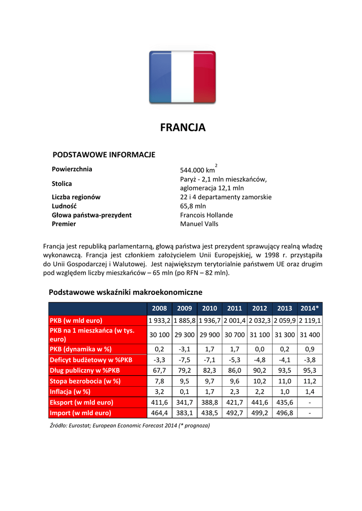 FRANCJA PODSTAWOWE INFORMACJE 2 Powierzchnia 544.000 km Paryż - 2,1 mln mieszkańców, aglomeracja 12,1 mln 22 i 4 departamenty zamorskie 65,8 mln Francois Hollande Manuel Valls Stolica Liczba regionów Ludność Głowa państwa-prezydent Premier Francja jest republiką parlamentarną, głową państwa jest prezydent sprawujący realną władzę wykonawczą. Francja jest członkiem założycielem Unii Europejskiej, w 1998 r. przystąpiła do Unii Gospodarczej i Walutowej. Jest największym terytorialnie państwem UE oraz drugim pod względem liczby mieszkańców – 65 mln (po RFN – 82 mln). Podstawowe wskaźniki makroekonomiczne 2008 PKB (w mld euro) PKB na 1 mieszkańca (w tys. euro) PKB (dynamika w %) Deficyt budżetowy w %PKB Dług publiczny w %PKB Stopa bezrobocia (w %) Inflacja (w %) Eksport (w mld euro) Import (w mld euro) 2009 2010 2011 2012 2013 2014* 1 933,2 1 885,8 1 936,7 2 001,4 2 032,3 2 059,9 2 119,1 30 100 29 300 29 900 30 700 31 100 31 300 31 400 0,2 -3,3 67,7 7,8 3,2 411,6 464,4 -3,1 -7,5 79,2 9,5 0,1 341,7 383,1 1,7 -7,1 82,3 9,7 1,7 388,8 438,5 Źródło: Eurostat; European Economic Forecast 2014 (* prognoza) 1,7 -5,3 86,0 9,6 2,3 421,7 492,7 0,0 -4,8 90,2 10,2 2,2 441,6 499,2 0,2 -4,1 93,5 11,0 1,0 435,6 496,8 0,9 -3,8 95,3 11,2 1,4 - SYTUACJA GOSPODARCZA Francja należy do największych potęg gospodarczych i inwestorów zagranicznych na świecie jest piątą potęgą gospodarczą świata (po USA, Chinach, Japonii i Niemczech). Do atutów gospodarki francuskiej zaliczyć należy: silnie rozwinięty przemysł obronny, lotniczy, samochodowy, energetykę atomową, prężny sektor wysokich technologii produkcyjnych, nowoczesny potencjał usługowy, silnie zróżnicowane rolnictwo. Kraj ten jest liderem w światowej turystyce (średniorocznie Francję odwiedza ok. 75 mln turystów). Głównym problemem gospodarczym Francji pozostaje od lat rosnące zadłużenie publiczne, deficyt w bilansie handlowym i spadek konkurencyjności międzynarodowej, wiążący się z postępującą dezindustrializacją i utrzymywaniem wysokiego poziomu konsumpcji mimo spadającej efektywności gospodarczej kraju. W 2012 r. odnotowano we Francji zerowy wzrost gospodarczy (przy 2,0% w 2011 r.). Z początkiem 2013 r. francuska gospodarka weszła w fazę recesji, jednakże po 12 miesiącach 2013 r. rząd wstępnie odnotował wzrost gospodarczy na poziomie 0,3%. W 2014 r. rząd przewiduje dalszą poprawę sytuacji, licząc zwłaszcza na stopniowe ożywienie w strefie euro i na świecie, jak również wzrost popytu wewnętrznego, prognozując średnioroczny wzrost PKB na poziomie 0,9%. Wdrożone programy ożywienia gospodarczego przyniosły efekty stabilizacyjne, ale jednocześnie pogorszył się stan finansów publicznych. Rząd zapewnia, iż dalszy proces ograniczania deficytu będzie kontynuowany, zaznaczając, iż nie może negatywnie odbijać się na wzroście gospodarczym. W świetle rekomendacji przyjętych na czerwcowym posiedzeniu Rady Europejskiej, Francja do końca 2015 r. powinna wyjść z procedury nadmiernego deficytu redukując jego poziom do poniżej 3% PKB. Zgodnie z przyjętą przez rząd ścieżką redukcji deficytu publicznego, na koniec 2013 r. jego poziom spadnie do 4,1% PKB (3,6% PKB w 2014 r. i 2,8% na koniec 2015 r.), przy czym deficyt strukturalny ma zostać całkowicie zlikwidowany w 2017 r. Wyniki handlu zagranicznego nie napawają optymizmem, gdyż ujemne saldo osiągnęło poziom 61 mld euro (w 2013 r. eksport - 435 mld euro, import -496 mld euro). Negatywnym zjawiskiem jest również zmniejszający się napływ inwestycji zagranicznych do Francji (w ostatnich dwóch latach średnio na rocznym poziomie 25 mln euro) oraz dwukrotnie wyższa wartość wypływającego z Francji kapitału. Natomiast stopa bezrobocia wzrosła do rekordowego poziomu ponad 10,6% (10% w 2012r.), co oznacza ponad 2,8 mln osób bez pracy. POLITYKA GOSPODARCZA Rząd francuski realizuje Program Stabilności na lata 2011-2014 zmierzający do uzyskania równowagi budżetowej, ograniczenia niektórych świadczeń socjalnych i zwiększenia innowacyjności gospodarki. Na 2014 rok rząd Francji zapowiedział również kontynuację reform gospodarczych, w tym uproszczeń procedur administracyjnych dla przedsiębiorców sektora MŚP oraz zmniejszenie obciążeń fiskalnych, mających na celu trwałe wejście Francji na ścieżkę wzrostu gospodarczego oraz poprawę niekorzystnych trendów panujących na rynku pracy. Założenia polityki gospodarczej rządu na najbliższe lata koncentrują się na trzech głównych obszarach: walka z rosnącym bezrobociem, tworzenie zachęt dla młodych przedsiębiorców, promowanie zatrudniania absolwentów i seniorów (grupa wiekowa 50+), ograniczanie nierówności społecznych, ochrona najuboższych obywateli; wsparcie wzrostu konkurencyjności przedsiębiorstw (wprowadzenie ulgi podatkowej na rzecz konkurencyjności i zatrudnienia, dalsza deregulacja, uproszczenie systemu podatkowego dla MŚP); kontynuacja konsolidacji finansów publicznych, przy zapewnieniu finansowania priorytetowych polityk rządu - bezpieczeństwo, wymiar sprawiedliwości, polityka zatrudnienia. Jeśli chodzi o zainicjowane do tej pory reformy przez rząd premiera Ayrault wymienić należy wprowadzenie dla przedsiębiorstw ulgi podatkowej na rzecz konkurencyjności i zatrudnienia (crédit d’impôt pour la compétitivité et l’emploi, CICE), dzięki której poprawie ma ulec konkurencyjność francuskich firm, a w rezultacie sytuacja na krajowym rynku pracy. Zamierzeniem rządu jest obniżenie kosztów pracy, które powinno przełożyć się na niższe ceny jednostkowe towarów i przyczynić do wzmocnienia konkurencyjności francuskich producentów. Ponadto, rząd zapowiedział wprowadzenie zmian podatkowych (modyfikacja wysokości stawek VAT od początku 2014 r., a w dłuższej perspektywie także wzrost podatków środowiskowych). Przygotowana przez rząd reforma emerytalna, która przewiduje