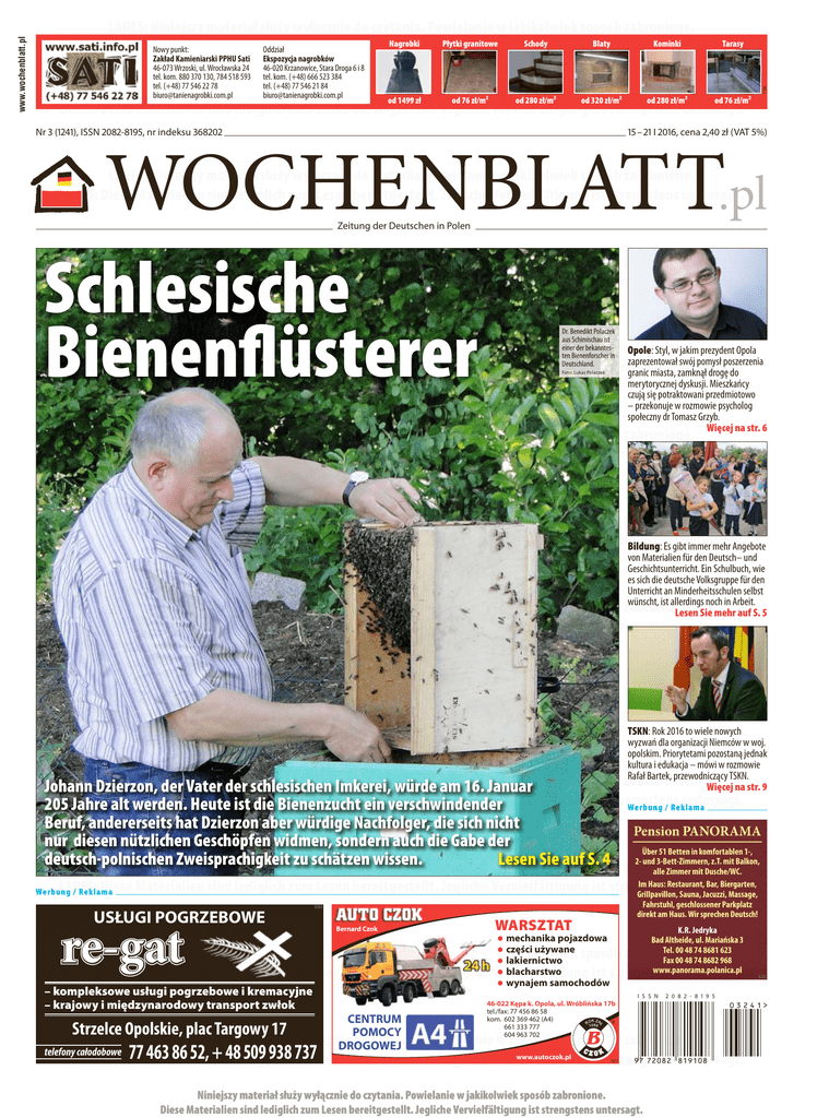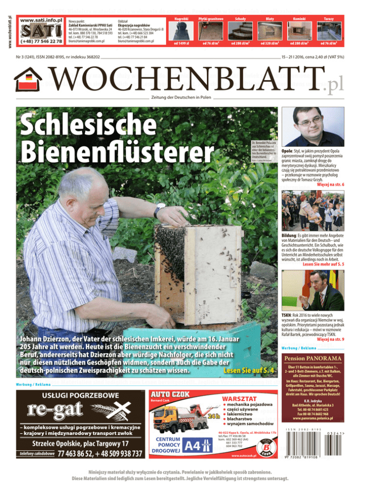 Zakład Kamieniarski PPHU Sati 46-073 Wrzoski, ul. Wrocławska 24 tel. kom. 880 370 130, 784 518 593 tel. (+48) 77 546 22 78 [email protected] Ekspozycja nagrobków 46-020 Krzanowice, Stara Droga 6 i 8 tel. kom. (+48) 666 523 384 tel. (+48) 77 546 21 84 [email protected] LARES: Niniejszy materiał służy wyłącznie do czytania. Powielanie w jakikolwiek sposób zabronione. od 1499 zł od 76 zł/m² od 280 zł/m² od 320 zł/m² od 280 zł/m² od 76 zł/m² LARES: Diese Materialien sind lediglich zum Lesen bereitgestellt. Jegliche Vervielfältigung ist strengstens untersagt. Nr 3 (1241), ISSN 2082-8195, nr indeksu 368202 7706 www.wochenblatt.pl LARES: Niniejszy materiał służy wyłącznie do czytania. Powielanie w jakikolwiek sposób zabronione. Nagrobki Płytki granitowe Schody Blaty Kominki Tarasy LARES: Diese Materialien sind lediglich Nowy punkt: Oddział zum Lesen bereitgestellt. Jegliche Vervielfältigung ist strengstens untersagt. 15 – 21 I 2016, cena 2,40 zł (VAT 5%) WOCHENBLATT.pl LARES: Niniejszy materiał służy wyłącznie do czytania. Powielanie w jakikolwiek sposób zabronione. LARES: Diese Materialien sind lediglich zum Lesen bereitgestellt. Jegliche Vervielfältigung ist strengstens untersagt. Zeitung der Deutschen in Polen Schlesische Bienenflüsterer LARES: Niniejszy materiał służy wyłącznie do czytania. Powielanie w jakikolwiek sposób zabronione. LARES: Diese Materialien sind lediglich zum Lesen bereitgestellt. Jegliche Vervielfältigung ist strengstens untersagt. Dr. Benedikt Polaczek aus Schimischau ist einer der bekanntesten Bienenforscher in Deutschland. LARES: Niniejszy materiał służy wyłącznie do czytania. Powielanie w jakikolwiek sposób zabronione. Opole: Styl, w jakim prezydent Opola zaprezentował swój pomysł poszerzenia LARES: Diese Materialien sind lediglich zum Lesen bereitgestellt. Jegliche Vervielfältigung ist strengstens untersagt. granic miasta, zamknął drogę do Foto: Lukas Polaczek merytorycznej dyskusji. Mieszkańcy czują się potraktowani przedmiotowo – przekonuje w rozmowie psycholog społeczny dr Tomasz Grzyb. Więcej na str. 6 LARES: Niniejszy materiał służy wyłącznie do czytania. Powielanie w jakikolwiek sposób zabronione. LARES: Diese Materialien sind lediglich zum Lesen bereitgestellt. Jegliche Vervielfältigung ist strengstens untersagt. LARES: Niniejszy materiał służy wyłącznie do czytania. Powielanie w jakikolwiek sposób zabronione. LARES: Diese Materialien sind lediglich zum Lesen bereitgestellt. Jegliche Vervielfältigung ist strengstens Bildung: Es gibtuntersagt. immer mehr Angebote von Materialien für den Deutsch– und Geschichtsunterricht. Ein Schulbuch, wie es sich die deutsche Volksgruppe für den Unterricht an Minderheitsschulen selbst wünscht, ist allerdings noch in Arbeit. LARES: Niniejszy materiał służy wyłącznie do czytania. Powielanie w jakikolwiek sposób zabronione. Lesen Sie mehr auf S. 5 LARES: Diese Materialien sind lediglich zum Lesen bereitgestellt. Jegliche Vervielfältigung ist strengstens untersagt. LARES: Niniejszy materiał służy wyłącznie do czytania. Powielanie w jakikolwiek sposób zabronione. LARES: Diese Materialien sind lediglich zum Lesen bereitgestellt. Jegliche Vervielfältigung ist strengstens untersagt. TSKN: Rok 2016 to wiele nowych wyzwań dla organizacji Niemców w woj. opolskim. Priorytetami pozostaną jednak kultura i edukacja – mówi w rozmowie Rafał Bartek, przewodniczący TSKN. LARES: Niniejszy materiał służy wyłącznie do czytania. Powielanie w jakikolwiek sposób zabronione. Więcej na str. 9 Johann Dzierzon, der Vater der schlesischen Imkerei, würde am 16. Januar LARES: Materialien sind ist lediglich zum Lesen bereitgestellt. Jegliche Vervielfältigung ist strengstens untersagt. 205 JahreDiese alt werden. Heute die Bienenzucht ein verschwindender Werbung / Reklama Beruf, andererseits hat Dzierzon aber würdige Nachfolger, die sich nicht Pension PANORAMA nur diesen nützlichen Geschöpfen widmen, sondern auch die Gabe der Über 51 Betten in komfortablen 1-, 2- und 3-Bett-Zimmern, z.T. mit Balkon, deutsch-polnischen Zweisprachigkeit zu schätzen wissen. Lesen Sie auf S. 4 LARES: Niniejszy materiał służy wyłącznie do czytania. Powielanie w jakikolwiek sposób zabronione. alle Zimmer mit Dusche/WC. Im Haus: Restaurant, Bar, Biergarten, Grillpavillon, Sauna, Jacuzzi, Massage, Fahrstuhl, geschlossener Parkplatz direkt am Haus. Wir sprechen Deutsch! LARES: Diese Materialien sind lediglich zum Lesen bereitgestellt. Jegliche Vervielfältigung ist strengstens untersagt. Werbung / Reklama USŁUGI POGRZEBOWE re-gat 8263 Bernard Czok warsztat K.R. Jedryka Bad Altheide, ul. Mariańska 3 Tel. 00 48 74 8681 623 Fax 00 48 74 8682 968 www.panorama.polanica.pl lmechanika pojazdowa lczęści używane llakiernictwo lblacharstwo lwynajem samochodów LARES: Niniejszy materiał służy wyłącznie do czytania. Powielanie w jakikolwiek sposób zabronione. LARES: Diese Materialien sind lediglich zum Lesen bereitgestellt. Jegliche Vervielfältigung ist strengstens untersagt. – kompleksowe usługi pogrzebowe i kremacyjne –krajowy i międzynarodowy transport zwłok 46-022 Kępa k. Opola, ul. Wróblińska 17b tel./fax: 77 456 86 58 kom. 602 369 462 (A4) ® 661 333 777 604 963 702 I S S N 2 0 8 2 - 8 1 9 5 CENTRUM POMOCY LARES: Niniejszy materiał służy wyłącznie do czytania. Powielanie w jakikolwiek sposób zabronione. DROGOWEJ telefony całodobowe Strzelce Opolskie, plac Targowy 17 86 52,sind + 48 509 938 737Lesen bereitgestellt. Jegliche Vervielfältigung www.autoczok.pl LARES: Diese77 463 Materialien lediglich zum ist strengstens untersagt. 7877 Niniejszy materiał służy wyłącznie do czytania. Powielanie w jakikolwiek sposób zabronione. Diese Materialien sind lediglich zum Lesen bereitgestellt. Jegliche Vervielfältigung ist strengstens untersagt. 8282 LARES: Niniejszy materiał służy wyłącznie do czytania. Powielanie w jakikolwiek sposób za