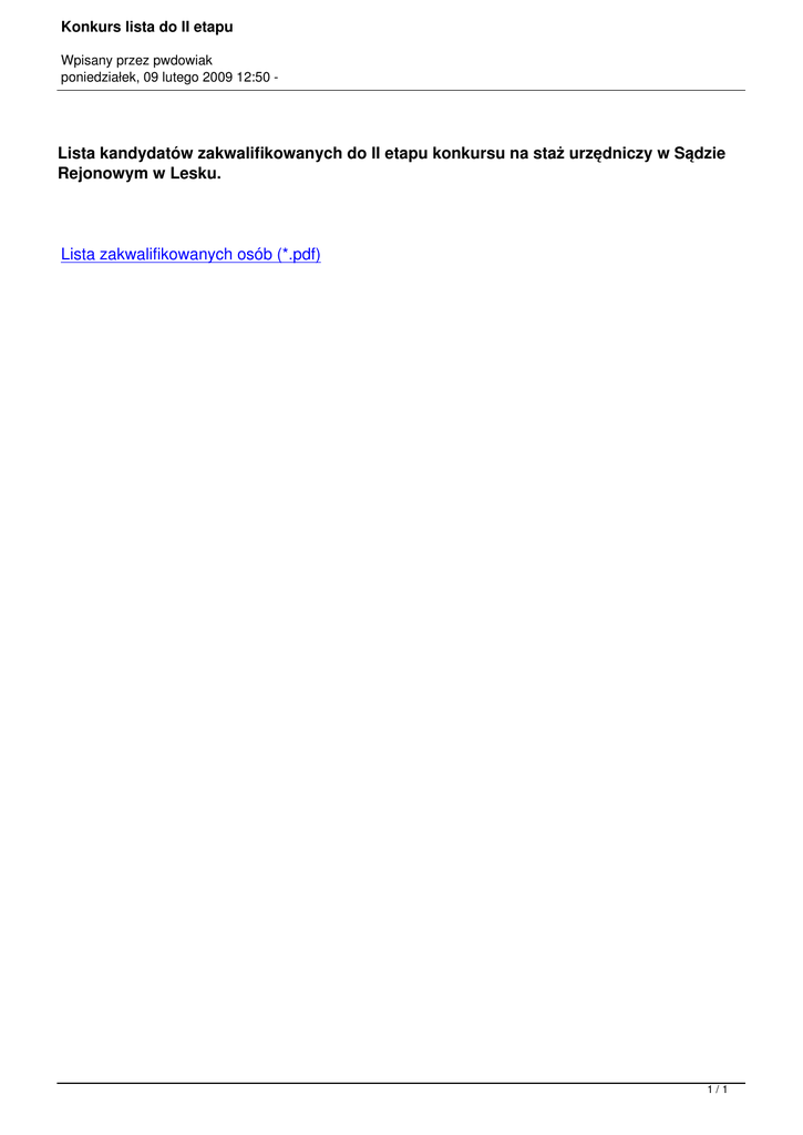 Konkurs lista do II etapu Wpisany przez pwdowiak poniedziałek, 09 lutego 2009 12:50 - Lista kandydatów zakwalifikowanych do II etapu konkursu na staż urzędniczy w Sądzie Rejonowym w Lesku. Lista zakwalifikowanych osób (*.pdf) 1/1