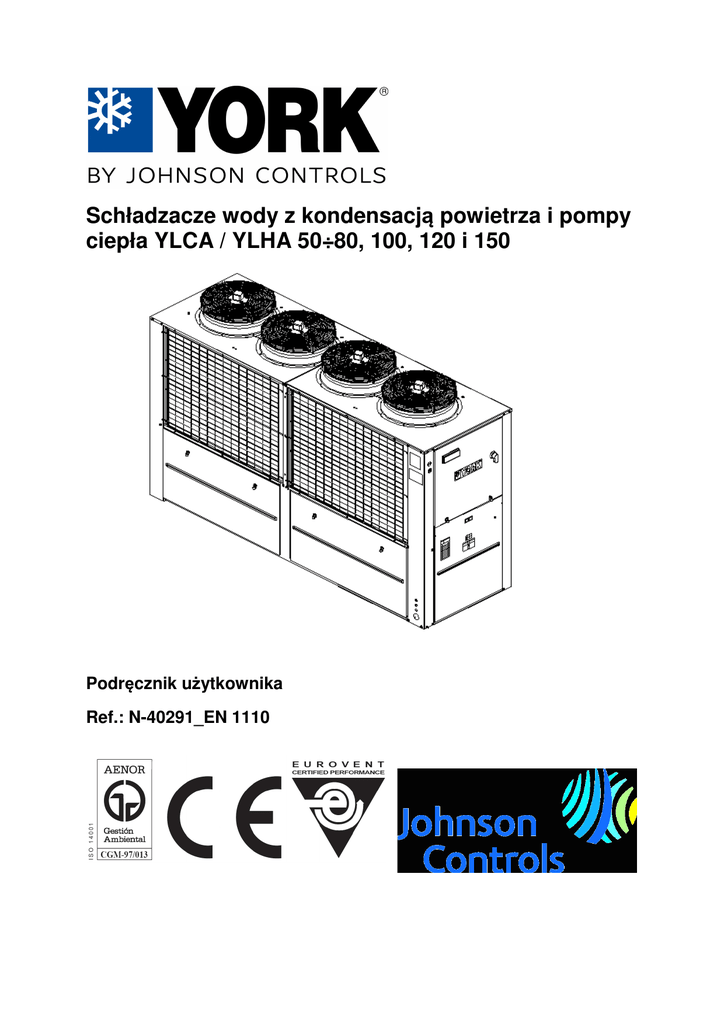 Schładzacze wody z kondensacją powietrza i pompy ciepła YLCA / YLHA 50÷80, 100, 120 i 150 Podręcznik użytkownika Ref.: N-40291_EN 1110 Spis Treści 1. Podręcznik Użytkownika .................................................................................................................. 3 1.1 Opis ogólny urządzenia ........................................................................................................... 3 1.1.1 Dostępne modele i ich moce ................................................................................................... 3 1.1.2 Parametry techniczne.............................................................................................................. 3 1.1.3 Instrukcje obsługi sterownika µC3 (YLCA / YLHA 50÷80 oraz 100, 120 i 150) ...................... 6 1.1.4 Regularne czynności konserwacyjne, za które odpowiada użytkownik ................................ 25 1. Podręcznik Użytkownika 1.1 Opis ogólny urządzenia Schładzacze powietrza i pompy ciepła o wysokiej wydajności YLCA/YLHA pracują na czynniku chłodniczym R-410A. Urządzenia te przeznaczone są do klimatyzacji lub do zastosowań w instalacjach przemysłowych, gdzie występuje zapotrzebowanie na wodę zimną lub gorącą. Odznaczające się cichą pracą i zwartą budową urządzenia wyposażone są w pionowe osiowe wentylatory spustu powietrza, możliwe do zainstalowania na zewnątrz pomieszczeń. Są one dostępne w dwu wersjach: z hydro-zestawem lub bez. Hydro-zestaw zawiera zbiornik buforowy i pompę wytwarzającą wysokie ciśnienie przesyłu. System sterowania tych urządzeń stanowi specjalnie zaprogramowany sterownik elektroniczny, stosowany w schładzaczach powietrza – wody i pompach ciepła wyposażonych w sprężarki podwójne (tandem). Te łatwe w użyciu i bezpieczne urządzenia precyzyjnie sterują temperaturą wody powrotnej w instalacji, wykonują cykle odmrażania, modulują prędkość obrotową wentylatora oraz sterują uruchomieniem sprężarki, pompy i grzejnika elektrycznego. Przez odczyt wskazań sensorów sterujących i elementów zabezpieczających, sterownik chroni całe wyposażenie przed awarią. Urządzenie nadaje się do podłączenia do standardowej sieci monitorującej RS485. Dalsze informacje – patrz Instrukcje Obsługi. 1.1.1 Dostępne modele i ich moce Model „Tylko chłodzenie” Moc chłodzenia Pompa ciepła Moc chłodzenia Moc grzewcza YLCA 50 YLCA 60 YLCA 80 YLCA 100 YLCA 120 YLCA 150 52,1 60,5 77,6 99 119 151 YLCA 50 52 YLCA 60 60,5 YLCA 80 72,2 YLCA 100 96 YLCA 120 114 YLCA 150 145 52,5 59,6 74,7 104 119,6 150 0 Moce chłodzenia w kW, przy temperaturze na wlocie / wylocie wody 12/7 C i temperaturze otoczenia 0 35 C. 0 Moce grzewcze w kW, przy temperaturze na wlocie / wylocie wody 40/45 C i temperaturze otoczenia 0 7 C. 1.1.2 Parametry techniczne Urządzenia dostarczane są w pełni zmontowane fabrycznie, z pełnym orurowaniem chłodziwa i okablowaniem gotowym do zainstalowania na obiekcie. Po montażu, urządzenia poddawane są badaniu funkcjonowania na wodzie. W badaniu kontrolowane są też ewentualne wycieki chłodziwa. Obudowa z blachy Urządzenia wykonane są z blachy ocynkowanej, a stosowane w nich śruby i nakrętki są ze stali nierdzewnej. Panele można zdjąć w celu udostępnienia komponentów wewnętrznych. Części obudowy powlekane są polimerową emalią piecową białą RAL9001. Sprężarki W urządzeniach stosuje się jedną, dwie lub cztery hermetyczne sprężarki spiralne (Scroll), montowane parami na szynach i podporach tłumiących wibracje. Sprężarki połączone są w sposób umożliwiający pracę w jednym obwodzie chłodzenia. Uruchomienie zapewniają dwa niezależne rozruszniki. Sprężarki wyposażone są w elementy mechaniczne, dla ochrony przed wysokimi temperaturami pracy. Grzejniki skrzyni korbowej pracują tylko wtedy gdy sprężarka jest wyłączona. Wymiennik ciepła po stronie wody Jest to wymiennik płytowy, z nierdzewnej stali, odpowiednio zaizolowany warstwą pianki elastomerowej o komórkach zamkniętych. Zawiera grzejnik zapobiegający zamarzaniu, monitorowany przez sterownik. Ciśnienie robocze w wymienniku po stronie cieczy chłodzącej może osiągnąć wartość 45 bar, zaś po stronie wody - 10 bar. W urządzeniach wyposażonych w hydrozestaw maksymalne dopuszczalne ciśnienie po stronie wody wynosi 6 bar (regulacja zaworu bezpieczeństwa zbiornika). Wymiennik ciepła po stronie powietrza Wykonany z dwóch naciętych, aluminiowych wężownic z niebieskimi łopatkami oraz drążonych rur miedzianych, mechanicznie wpuszczonych w zespół łopatki. Wentylatory Typu osiowego, o cichej pracy. Wyposażone w silniki jednofazowe, z zabezpieczeniem IP54. Do sterowania prędkością obrotową silników służy przesuwnik fazowy [phase cut-out shifter] sterowany przez sterownik urządzenia. Umożliwia to pracę maszyny przy niskich temperaturach otoczenia (0 10 C). W pompach ciepła podczas odmrażania wentylator nie pracuje. Płyta połączeń elektrycznych i moduł sterowania Położona w przedniej części urządzenia, z zabezpieczeniem IP44. Jej komponenty robocze i sterujące są wmontowane, okablowane i przetestowane fabrycznie. Drzwi panelu sterowania wyposażone są w izolator blokujący, wyłączający zasilanie. W jego wnętrzu znajdują się: styczniki do sprężarek i pompy, transformator, ochronniki magnetotermiczne, elektroniczne moduły sterowania, regulator prędkości, listwa połączeniowa oraz klawiatura-wyświetlacz z elementami regulacyjnymi. Klawiatura sterująca – wyświetlacz Urządzenie to dostępne jest za zewnętrzną hermetyczną pokrywą z tworzywa sztucznego. Zapewnia łatwe sterowanie, przy czym zakres dostępnych funkcji zależy od przypisanego użytkownikowi, jednego z trzech poziomów dostępu: bezpośredni, użytkownik (hasło) i fabryka (hasło). Dalsze informacje – patrz Instrukcje Obsługi. Obwód chłodzenia Obwód chłodzenia w urządzeniach z 