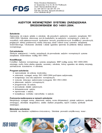 FDS Firma Doradczo Szkoleniowa ul. Senatorska 15 m 10, 58-316 Wałbrzych email: [email protected] tel.: 669 268 417 lub 607 391 274 NIP 886 150 6975; REGON 891498122 www.szkolenia-fds.pl AUDYTOR WEWNĘTRZNY SYSTEMU ZARZĄDZANIA ŚRODOWISKIEM ISO 14001:2004. Szkolenie: Zapraszamy do wzięcia udziału w szkoleniu dla przyszłych audytorów systemów zarządzania ISO 14001:2004. Szkolenie skierowane jest do kandydatów na audytorów wewnętrznych a także do wszystkich osób zainteresowanych uzyskaniem nowych, przyszłościowych kwalifikacji zawodowych, pragnących zdobyć podstawową wiedzę dotyczącą zasad i metod oceny systemów zarządzania środowiskowego. Ukończenie szkolenia i zdanie egzaminu uprawnia do pełnienia funkcji audytora wewnętrznego. Cel szkolenia: Zdobycie umiejętności i wiedzy potrzebnych do prowadzenia audytów wewnętrznych systemu zarządzania środowiskiem według ISO 14001. Kwalifikacje: Certyfikat Audytora wewnętrznego systemu zarządzania BHP według normy ISO 14001:2004. otrzymają osoby, które zdadzą egzamin, uczestnicy szkolenia, którzy egzaminu nie zdadzą otrzymają zaświadczenie uczestnictwa w szkoleniu. Program szkolenia: wprowadzenie do ochrony środowiska; omówienie wymagań normy ISO 14001:2004 pod kątem audytowania; kompetencje oraz rola audytorów wewnętrznych; wytyczne dotyczące audytowania-wymagania ISO 19011:2002: planowanie audytów wewnętrznych; przygotowanie do audytu; prowadzenie działań audytowych; dokumentowanie audytu; raportowanie z audytu; komunikacja werbalna i niewerbalna w audycie. Ćwiczenia realizowane w ramach szkolenia: Interpretacja wymagań normy, planowanie audytu, ocena dokumentacji, pytania audytowe, spotkanie otwierające, określanie niezgodności, analiza studium przypadku, raport z audytu, spotkanie zamykające. Metodyka szkolenia: Szkolenie ma charakter wykładowo-ćwiczeniowy. Szkolenie prowadzi certyfikowany trener . FDS Firma Doradczo Szkoleniowa ul. Senatorska 15 m 10, 58-316 Wałbrzych email: [email protected] tel.: 669 268 417 lub 607 391 274 NIP 886 150 6975; REGON 891498122 www.szkolenia-fds.pl Czas trwania kursu: Planowany czas trwania kursu to 8 godzin. Termin realizacji zgodnie z planem szkoleń otwartych w FDS lub do ustalenia ze zleceniodawcą przy szkoleniach prowadzonych u zleceniodawcy. Wymagania dla zleceniodawcy: Pisemne zlecenie usługi (może być w formie mailowej) z wskazaniem czasu i miejsca szkolenia. Zapewnienie sali z możliwością wykorzystania jej jako szkoleniowej, zalecane by była wyposażona w rzutnik/ projektor i ekran, w przypadku braku sprzętu należy powiadomić o tym usługobiorcę. Zaleca się, aby zlecający posiadał w trakcie szkolenia chociaż jeden egzemplarz każdej normy (przypominamy: normy nie mogą być powielane/ kopiowane bez zgody PKN). Wymagania dla uczestników kursu: Należy pamiętać żeby odpowiednio wybrać kandydatów na Audytorów systemów zarządzania. Zalecane jest przy wyborze kandydatów postępować zgodnie z wytycznymi normy PN-EN ISO 14012. Koszty: Szkolenie prowadzone w jednostce zleceniodawcy - koszt to 2000 zł. netto za szkolenie dla max. 10 uczestników. Szkolenie prowadzone w jednostce FDS – koszt to 2400 zł. netto za szkolenie dla max. 10 uczestników (w cenę wliczone jest obiad dla uczestników). Udział w szkoleniu otwartym w jednostce FDS – koszt to 250 zł. netto od osoby, max. 10 uczestników (w cenę wliczone jest obiad dla uczestników). Zapraszamy do współpracy - Zespół FDS