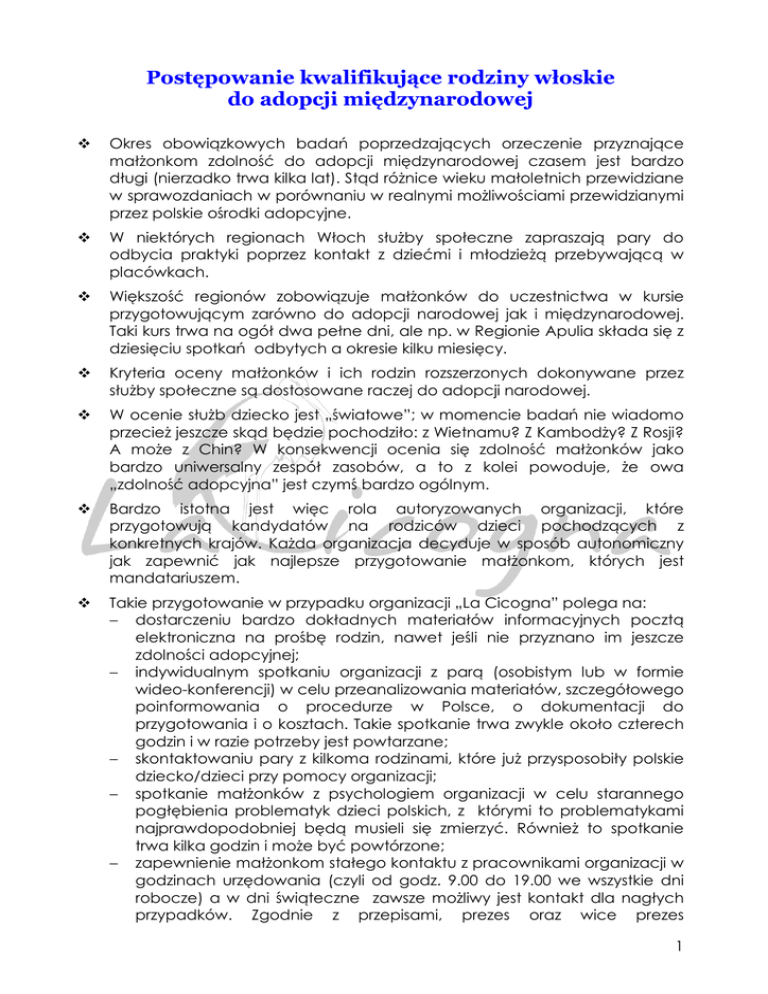Postępowanie kwalifikujące rodziny włoskie do adopcji międzynarodowej Okres obowiązkowych badań poprzedzających orzeczenie przyznające małżonkom zdolność do adopcji międzynarodowej czasem jest bardzo długi (nierzadko trwa kilka lat). Stąd różnice wieku małoletnich przewidziane w sprawozdaniach w porównaniu w realnymi możliwościami przewidzianymi przez polskie ośrodki adopcyjne. W niektórych regionach Włoch służby społeczne zapraszają pary do odbycia praktyki poprzez kontakt z dziećmi i młodzieżą przebywającą w placówkach. Większość regionów zobowiązuje małżonków do uczestnictwa w kursie przygotowującym zarówno do adopcji narodowej jak i międzynarodowej. Taki kurs trwa na ogół dwa pełne dni, ale np. w Regionie Apulia składa się z dziesięciu spotkań odbytych a okresie kilku miesięcy. Kryteria oceny małżonków i ich rodzin rozszerzonych dokonywane przez służby społeczne są dostosowane raczej do adopcji narodowej. W ocenie służb dziecko jest „światowe”; w momencie badań nie wiadomo przecież jeszcze skąd będzie pochodziło: z Wietnamu? Z Kambodży? Z Rosji? A może z Chin? W konsekwencji ocenia się zdolność małżonków jako bardzo uniwersalny zespół zasobów, a to z kolei powoduje, że owa „zdolność adopcyjna” jest czymś bardzo ogólnym. Bardzo istotna jest więc rola autoryzowanych organizacji, które przygotowują kandydatów na rodziców dzieci pochodzących z konkretnych krajów. Każda organizacja decyduje w sposób autonomiczny jak zapewnić jak najlepsze przygotowanie małżonkom, których jest mandatariuszem. Takie przygotowanie w przypadku organizacji „La Cicogna” polega na: − dostarczeniu bardzo dokładnych materiałów informacyjnych pocztą elektroniczna na prośbę rodzin, nawet jeśli nie przyznano im jeszcze zdolności adopcyjnej; − indywidualnym spotkaniu organizacji z parą (osobistym lub w formie wideo-konferencji) w celu przeanalizowania materiałów, szczegółowego poinformowania o procedurze w Polsce, o dokumentacji do przygotowania i o kosztach. Takie spotkanie trwa zwykle około czterech godzin i w razie potrzeby jest powtarzane; − skontaktowaniu pary z kilkoma rodzinami, które już przysposobiły polskie dziecko/dzieci przy pomocy organizacji; − spotkanie małżonków z psychologiem organizacji w celu starannego pogłębienia problematyk dzieci polskich, z którymi to problematykami najprawdopodobniej będą musieli się zmierzyć. Również to spotkanie trwa kilka godzin i może być powtórzone; − zapewnienie małżonkom stałego kontaktu z pracownikami organizacji w godzinach urzędowania (czyli od godz. 9.00 do 19.00 we wszystkie dni robocze) a w dni świąteczne zawsze możliwy jest kontakt dla nagłych przypadków. Zgodnie z przepisami, prezes oraz wice prezes 1 stowarzyszenia pozostają do stałej 24-godzinnej dyspozycji Komisji do Adopcji Międzynarodowych przy Radzie Ministrów oraz – ale tylko w wyjątkowych przypadkach – również i par, które udzieliły pełnomocnictwa naszej organizacji. Postępowanie kwalifikujące rodziny włoskie do adopcji konkretnego dziecka w Polsce Konwencja Haska z 29 maja 1993 roku o ochronie dzieci i współpracy w dziedzinie przysposobienia międzynarodowego zobowiązuje naszą organizację do bezpośredniej współpracy wyłącznie z trzema uprawnionymi polskimi Ośrodkami Adopcyjnymi: z Krajowym, Katolickim i Wojewódzkim Ośrodkiem przy Mazowieckim Centrum Polityki Społecznej. Tak więc skontaktowanie pary z dzieckiem ma swój początek w Warszawie. Gdy otrzymujemy od Ośrodków propozycję poszukiwania rodziny dla określonego dziecka natychmiast dokonujemy na podstawie załączonych dokumentów pierwszego sprawdzianu w naszym archiwum rodzin oczekujących na połączenie. Jeśli wydaje się nam, że mamy ewentualnych odpowiednich kandydatów na rodzinę dla zaproponowanego dziecka informujemy polski Ośrodek i prosimy o autoryzację na kontakt z dzieckiem, z jego opiekunem prawny i środowiskiem, w którym dziecko aktualnie przebywa. Chcemy stworzyć dla przyszłych rodziców jak najdokładniejszy profil dziecka gdyż do tego zobowiązuje nas Konwencja Haska, a poza tym uważamy, że im dokładniejsza jest informacja tym bardziej świadomą decyzję podejmą przyszli rodzice. Następnie cała dokumentacja dotycząca dziecka jest przez nas tłumaczona na język włoski i dostarczana rodzinie. Po zapoznaniu się z dokumentacją rodzina wchodzi w kontakt (osobisty lub przez Skype) z naszym psychologiem aby przedyskutować wszystkie otrzymane informacje. Jeśli rodzina wyraża zgodę na spotkanie dziecka, informujemy o tym polski Ośrodek z prośbą o wyrażenie opinii na temat proponowanej przez nas rodziny. Naturalnie, uprzednio dostarczamy Ośrodkowi cały komplet przetłumaczonej dokumentacji o rodzinie. Jeśli Ośrodek przychyla się do naszej propozycji, przesyła całą dokumentację do Ministerstwa Rodziny, Pracy i Polityki Społecznej – Departamentu Polityki Rodzinnej w celu otrzymania polskiej autoryzacji na dalsze postępowanie; jest to dokument przewidziany przez Konwencję Haską, którego wydanie leży w kompetencji organu centralnego każdego z zainteresowanych procedurą państw. Organ włoski czyli Komisja do Spraw adopcji Międzynarodowych przy Radzie Ministrów w Rzymie wydaje taki dokument dopiero po otrzymaniu polskiej autoryzacji od naszej organizacji wraz z innymi dokumentami. Po otrzymaniu zgody wyżej wymienionych organów polskich organizujemy spotkanie kandydatów na rodziców dzieckiem. Takie pierwsze spotkanie trwa 2 na ogół dwa dni; pozwala dorosłym na poznanie środowiska, w którym aktualnie żyje ich przyszłe dziecko, na kontakt fizyczny z dzieckiem, pozwala wszystkim trochę „oswoić się” z tym, że dziecko, do tej pory istniejące tylko w wyobraźni i w dokumentach, istnieje również w rzeczywistości. Również dziecko ma możność zobaczenia, że efektywnie istnieją dwie os
