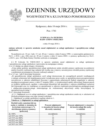 DZIENNIK URZĘDOWY WOJEWÓDZTWA KUJAWSKO-POMORSKIEGO Bydgoszcz, dnia 18 maja 2016 r. Elektronicznie podpisany przez: Agnieszka Makara Poz. 1741 Data: 2016-05-18 13:14:29 UCHWAŁA Nr III/28/2016 RADY GMINY OSIELSKO z dnia 10 maja 2016 r. zmiana uchwały w sprawie ustalenia zasad odpłatności za usługi opiekuńcze i specjalistyczne usługi opiekuńcze. Na podstawie art. 18 ust. 2 pkt. 15 i art. 40 ust. 1 ustawy z dnia 8 marca 1990 r. o samorządzie gminnym (t.j. Dz.U. z 2016 r. poz. 446) oraz art. 50 ust. 6 ustawy z dnia 12 marca 2004 r. o pomocy społecznej (t.j. Dz.U. z 2015 r. poz. 163) Rada Gminy Osielsko uchwala co następuje: § 1. W Uchwale Nr VIII/81/2015 w sprawie ustalenia zasad odpłatności za usługi opiekuńcze i specjalistyczne usługi opiekuńcze wprowadza się następujące zmiany: 1) w § 2 dodaje się zdanie drugie o brzmieniu: „Cenę jednej godziny specjalistycznej usługi opiekuńczej ustala ośrodek pomocy społecznej na podstawie analizy kosztów realizacji tego zadania lub wynika ona z umowy zawartej przez ośrodek pomocy społecznej z podmiotem przyjmującym zlecenie realizacji zadania.”; 2) w § 3 ust. 1 pkt 8 otrzymuje brzmienie: „8) specjalistyczne usługi opiekuńcze czyli usługi dostosowane do szczególnych potrzeb wynikających z rodzaju schorzenia lub niepełnosprawności świadczone przez osoby ze specjalistycznym przygotowaniem zawodowym w zakresie rehabilitacji fizycznej i usprawniania zaburzonych funkcji organizmu w zakresie nieobjętym przepisami ustawy z dnia 27 sierpnia 2004 r. o świadczeniach opieki zdrowotnej finansowanych ze środków publicznych, zgodnie z zaleceniami lekarskimi lub specjalisty z zakresu rehabilitacji ruchowej lub fizjoterapii oraz we współpracy ze specjalistami w zakresie wspierania psychologiczno-pedagogicznego i edukacyjno-terapeutycznego zmierzającego do wielostronnej aktywizacji osoby korzystającej ze specjalistycznych usług.”; 3) § 5 otrzymuje brzmienie: „§ 5.1. Odpłatność za w/w usługi opiekuńcze i specjalistyczne usługi opiekuńcze ustala się w zależności od dochodu podopiecznego oraz jego sytuacji rodzinnej. 2. Odpłatność za usługi opiekuńcze reguluje tabela nr 1. Tabela nr 1. Odpłatność za usługi opiekuńcze Dochód osoby samotnej lub na osobę w rodzinie w stosunku do kryterium ustawowego w % określonego ustawą o pomocy społecznej do 100% od 101% do 150% od 151% do 200% od 201% do 250% od 251% do 300% od 301% do 350% Procent odpłatności w stosunku do kosztu usługi dla osoby samotnej Procent odpłatności w stosunku do kosztu usługi dla osoby w rodzinie nieodpłatnie 5 10 15 20 50 nieodpłatnie 10 15 20 25 70 Dziennik Urzędowy Województwa Kujawsko-Pomorskiego –2– Poz. 1741 od 351% do 400% 80 100 powyżej 400% 100 100 3. Odpłatność za specjalistyczne usługi opiekuńcze reguluje tabela nr 2. Tabela nr 2 . Odpłatność za specjalistyczne usługi opiekuńcze Dochód osoby samotnej lub na osobę w rodzinie w stosunku do Procent odpłatności Procent odpłatności w stosunku kryterium ustawowego w % w stosunku do kosztu usługi do kosztu usługi dla osoby określonego ustawą o pomocy dla osoby samotnej w rodzinie społecznej do 300% nieodpłatnie nieodpłatnie od 301% do 350% 10 20 od 351% do 400% 20 30 od 401% do 450% 30 40 od 451% do 500% 50 70 powyżej 500% 100 100 § 2. Pozostałe zapisy uchwały nie ulegają zmianie. § 3. Wykonanie uchwały powierza się Wójtowi Gminy. § 4. Uchwała wchodzi w życie po upływie 14 dni od dnia ogłoszenia w Dzienniku Urzędowym Województwa Kujawsko-Pomorskiego. Przewodniczący Rady Gminy Benedykt Leszczyński