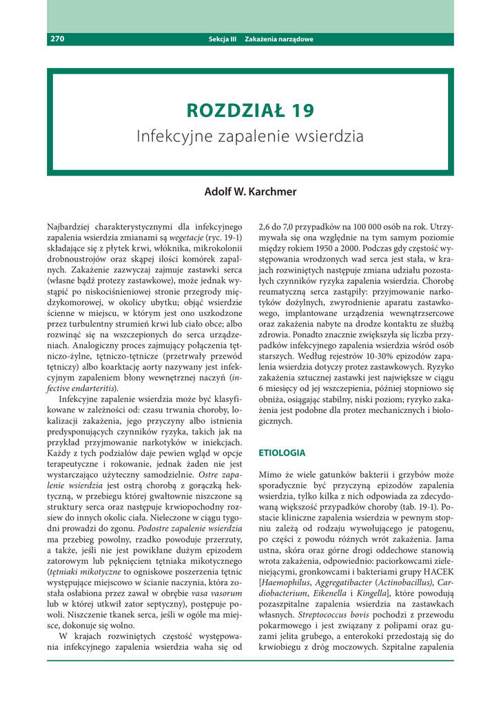 270 Sekcja III Zakażenia narządowe ROZDZIAŁ 19 Infekcyjne zapalenie wsierdzia Adolf W. Karchmer Najbardziej charakterystycznymi dla infekcyjnego zapalenia wsierdzia zmianami są wegetacje (ryc. 19-1) składające się z płytek krwi, włóknika, mikrokolonii drobnoustrojów oraz skąpej ilości komórek zapalnych. Zakażenie zazwyczaj zajmuje zastawki serca (własne bądź protezy zastawkowe), może jednak wystąpić po niskociśnieniowej stronie przegrody międzykomorowej, w okolicy ubytku; objąć wsierdzie ścienne w miejscu, w którym jest ono uszkodzone przez turbulentny strumień krwi lub ciało obce; albo rozwinąć się na wszczepionych do serca urządzeniach. Analogiczny proces zajmujący połączenia tętniczo-żylne, tętniczo-tętnicze (przetrwały przewód tętniczy) albo koarktację aorty nazywany jest infekcyjnym zapaleniem błony wewnętrznej naczyń (infective endarteritis). Infekcyjne zapalenie wsierdzia może być klasyfikowane w zależności od: czasu trwania choroby, lokalizacji zakażenia, jego przyczyny albo istnienia predysponujących czynników ryzyka, takich jak na przykład przyjmowanie narkotyków w iniekcjach. Każdy z tych podziałów daje pewien wgląd w opcje terapeutyczne i rokowanie, jednak żaden nie jest wystarczająco użyteczny samodzielnie. Ostre zapalenie wsierdzia jest ostrą chorobą z gorączką hektyczną, w przebiegu której gwałtownie niszczone są struktury serca oraz następuje krwiopochodny rozsiew do innych okolic ciała. Nieleczone w ciągu tygodni prowadzi do zgonu. Podostre zapalenie wsierdzia ma przebieg powolny, rzadko powoduje przerzuty, a także, jeśli nie jest powikłane dużym epizodem zatorowym lub pęknięciem tętniaka mikotycznego (tętniaki mikotyczne to ogniskowe poszerzenia tętnic występujące miejscowo w ścianie naczynia, która została osłabiona przez zawał w obrębie vasa vasorum lub w której utkwił zator septyczny), postępuje powoli. Niszczenie tkanek serca, jeśli w ogóle ma miejsce, dokonuje się wolno. W krajach rozwiniętych częstość występowania infekcyjnego zapalenia wsierdzia waha się od 2,6 do 7,0 przypadków na 100 000 osób na rok. Utrzymywała się ona względnie na tym samym poziomie między rokiem 1950 a 2000. Podczas gdy częstość występowania wrodzonych wad serca jest stała, w krajach rozwiniętych następuje zmiana udziału pozostałych czynników ryzyka zapalenia wsierdzia. Chorobę reumatyczną serca zastąpiły: przyjmowanie narkotyków dożylnych, zwyrodnienie aparatu zastawkowego, implantowane urządzenia wewnątrzsercowe oraz zakażenia nabyte na drodze kontaktu ze służbą zdrowia. Ponadto znacznie zwiększyła się liczba przypadków infekcyjnego zapalenia wsierdzia wśród osób starszych. Według rejestrów 10-30% epizodów zapalenia wsierdzia dotyczy protez zastawkowych. Ryzyko zakażenia sztucznej zastawki jest największe w ciągu 6 miesięcy od jej wszczepienia, później stopniowo się obniża, osiągając stabilny, niski poziom; ryzyko zakażenia jest podobne dla protez mechanicznych i biologicznych. ETIOLOGIA Mimo że wiele gatunków bakterii i grzybów może sporadycznie być przyczyną epizodów zapalenia wsierdzia, tylko kilka z nich odpowiada za zdecydowaną większość przypadków choroby (tab. 19-1). Postacie kliniczne zapalenia wsierdzia w pewnym stopniu zależą od rodzaju wywołującego je patogenu, po części z powodu różnych wrót zakażenia. Jama ustna, skóra oraz górne drogi oddechowe stanowią wrota zakażenia, odpowiednio: paciorkowcami zieleniejącymi, gronkowcami i bakteriami grupy HACEK [Haemophilus, Aggregatibacter (Actinobacillus), Cardiobacterium, Eikenella i Kingella], które powodują pozaszpitalne zapalenia wsierdzia na zastawkach własnych. Streptococcus bovis pochodzi z przewodu pokarmowego i jest związany z polipami oraz guzami jelita grubego, a enterokoki przedostają się do krwiobiegu z dróg moczowych. Szpitalne zapalenia Rozdział 19 RYCINA 19-1.* Wegetacje (strzałki) zajmujące zastawkę mitralną w przebiegu paciorkowcowego zapalenia wsierdzia. TABELA 19-1 271 Infekcyjne zapalenie wsierdzia wsierdzia na zastawkach własnych są konsekwencją bakteriemii powodowanej przez zakażenia cewników donaczyniowych, miejsca operowanego i dróg moczowych, a także przewlekłych powtarzalnych procedur inwazyjnych, takich jak hemodializa. Zapalenie wsierdzia wikła 6-25% epizodów bakteriemii wywoływanej przez Staphylococcus aureus, a związanej z utrzymywaniem cewnika w naczyniu, przy czym więcej takich przypadków ujawniają dokładne badania przesiewowe z użyciem echokardiografii przezprzełykowej (transesophageal echocardiography – TEE) (patrz: „Echokardiografia”; poniżej). Zakażenie protezy zastawkowej, rozwijające się w ciągu 2 miesięcy od operacji zastawki, najczęściej jest spowodowane śródoperacyjnym zakażeniem protezy lub pooperacyjnymi powikłaniami septycz- Drobnoustroje odpowiedzialne za najczęstsze postacie kliniczne zapalenia wsierdzia Odsetek przypadków Zapalenie wsierdzia na zastawce własnej Patogen Paciorkowceb Pneumokoki Enterokoki Staphylococcus aureus Gronkowce koagulazoujemne Gram-ujemne coccobacilli o zwiększonych wymaganiach odżywczych (grupa HACEK)d Pałeczki Gram-ujemne Candida spp. Wieloczynnikowe/ różne Maczugowce Ujemne posiewy Pozaszpitalne (n = 683) 32 1 8 35 Zapalenie wsierdzia na protezie zastawkowej w zależności od czasu ujawnienia się po zabiegu wymiany zastawki (w miesiącach) Związane z kontaktem ze służbą <2 zdrowia (n = 144) (n = 128) 8 1 — — 16 8 22 44c 33 Zapalenie wsierdzia związane z dożylnym przyjmowaniem narkotyków Lewa część Prawa Razem serca część serca (n = 204) (n = 675)a (n = 346) 5 15 12 — — — 2 24 9 77 23 57 2-12 (n = 31) 9 — 12 12 > 12 (n = 194) 31 — 11 18 32 11 — — — — 6 — — — 4 15 3 — 3 5 13 3 6 5 13 7 1 6 6 1 8 3 12 6 1 5 — 8 12 10 4 7 — 5 — 5 6 5 — 6 3 8 — 3 — 3 0,1 3 — a Całkowita liczba je