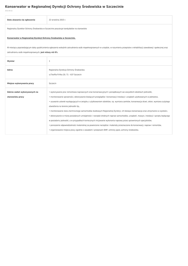 Konserwator w Regionalnej Dyrekcji Ochrony Środowiska w