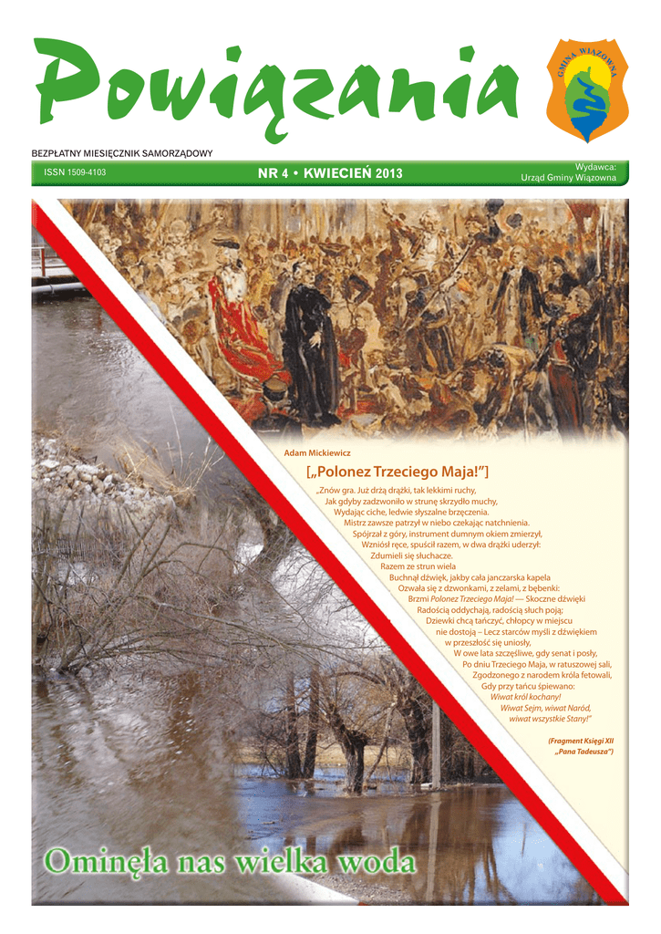 Powiązania BEZPŁATNY MIESIĘCZNIK SAMORZĄDOWY ISSN 1509-4103 NR 4 • KWIECIEŃ 2013 Wydawca: Urząd Gminy Wiązowna Adam Mickiewicz [„Polonez Trzeciego Maja!”] „Znów gra. Już drżą drążki, tak lekkimi ruchy, Jak gdyby zadzwoniło w strunę skrzydło muchy, Wydając ciche, ledwie słyszalne brzęczenia. Mistrz zawsze patrzył w niebo czekając natchnienia. Spójrzał z góry, instrument dumnym okiem zmierzył, Wzniósł ręce, spuścił razem, w dwa drążki uderzył: Zdumieli się słuchacze. Razem ze strun wiela Buchnął dźwięk, jakby cała janczarska kapela Ozwała się z dzwonkami, z zelami, z bębenki: Brzmi Polonez Trzeciego Maja! — Skoczne dźwięki Radością oddychają, radością słuch poją; Dziewki chcą tańczyć, chłopcy w miejscu nie dostoją – Lecz starców myśli z dźwiękiem w przeszłość się uniosły, W owe lata szczęśliwe, gdy senat i posły, Po dniu Trzeciego Maja, w ratuszowej sali, Zgodzonego z narodem króla fetowali, Gdy przy tańcu śpiewano: Wiwat król kochany! Wiwat Sejm, wiwat Naród, wiwat wszystkie Stany!” (Fragment Księgi XII „Pana Tadeusza”) AKTUALNOŚCI W dniu 4 kwietnia w Zespole Szkolno-Gimnazjalnym w Zakręcie odbyło się spotkanie z mieszkańcami tego oraz sąsiednich sołectw władz oraz przedstawicieli Urzędu Gminy, a także członków samorządu gminnego i sołeckiego. Przybyli: wójt Anna Bętkowska, wiceprzewodniczący Rady Gminy Piotr Łapiński, kierownik Referatu Podatków UG Elżbieta Cieślak, inspektor z Wydziału Ochrony Środowiska UG Przemysław Kaźmierczak, sołtys Zakrętu Jacek Buczyński. P ani wójt przedstawiła problemy dotyczące ustawy tzw. śmieciowej. Obszernie i dokładnie wyjaśniła zawiłości związane z opłatami, wywozem śmieci i odpadów oraz sposobami ich segregowania. Mówiła o przykrym i negatywnym zjawisku notorycznego zaśmiecania terenów w Gminie Wiązowna wyrażając nadzieję, że wejście w życie od 1 lipca br. przepisów nowej ustawy zahamuje te fatalne praktyki. – To co ludzie wyrabiają w naszej gminie jest po prostu szokiem! Jestem jednak optymistką i wierzę, że dając dobry przykład zdołamy ludzi wychować, chociaż zmienić ludzką mentalność jest najtrudniej – powiedziała Bętkowska, która zaznaczyła, że obowiązkiem – przykrym, ale koniecznym – jest sprawowanie przez Urząd Gminy kontroli nad tym, czy ilość wypełnionych śmieciami pojemników jest adekwatna do ilości osób zamieszkałych na danej posesji. – Opłata jest solidarna, podobnie jak w spółdzielniach mieszkaniowych, gdzie są lokatorzy, którzy nie płacą i wówczas ponoszonymi kosztami obciążani są pozostali mieszkańcy. Kiedy u nas któryś z sąsiadów zadeklaruje dwie zamieszkałe w swoim domu osoby, a w rzeczywistości będzie ich znacznie więcej, na przykład osiem, i śmieci będą wywożone od ośmiu osób, a nie od dwóch, to wówczas koszty tej różnicy będziemy ponosić my wszyscy – zabrał głos Piotr Łapiński. Sprawy związane z podatkami wyjaśniała Elżbieta Cieślak, która wspólnie z panią wójt rozwiała uporczywe plotki (nazwane eufemistycznie „mitem”) jakoby Gmina Wiązowna miała najwyższe podatki wśród okolicznych gmin. W rzeczywistości jest odwrotnie: w Wiązownie są jedne z najniższych stawek 2 Powiązania kwiecień 2013 fot. PK O śmieciach, podatkach i podtopieniach podatkowych o czym pisano w „Powiązaniach” i nie tylko, bo również w „Tygodniku Regionalnym”. Są jednak ciągle tacy, którzy wydają się wierzyć w ten „mit”. – Nie mówmy o mitach, mówmy o prawdzie – powiedziała z naciskiem wójt Bętkowska, która w bardzo aktywny sposób dyskutowała z osobami zadającymi pytania, wyjaśniając wątpliwości i udzielając rad oraz wskazówek. W porozumieniu z radnym Łapińskim oraz sołtysem Buczyńskim zaproponowała, żeby w wyznaczonym terminie w ZSG zorganizować dyżur pracownika Urzędu Gminy, który pomoże wypełnić deklarację podatkową. Kontrola klasyfikacji gruntów została zakończona i nastąpiły istotne zmiany. Dyżur taki odbył się w weekend 13-14 kwietnia w godzinach 10.00-14.00. Głos zabrał również Przemysław Kaźmierczak, który omówił problemy wodne Zakrętu, sołectwa, które w lecie 2011 roku zostało dotknięte poważnymi podtopieniami. Aby zminimalizować te zagrożenia, wskazał na konieczność stałej konserwacji urządzeń szczegółowych czyli rowów melioracyjnych oraz sieci drenarskiej, co powinno odbywać się poprzez założenie spółki wodnej. – Każdy mieszkaniec z osobna nie da rady tego zrobić w sposób kompleksowy i fachowy. Powołanie spółki wodnej wydaje się najlepszym rozwiązaniem, bo wówczas zajmie się tym specjalistyczna firma – powiedział Kaźmierczak. Po zakończeniu spotkania, wiele osób podchodziło do pani wójt oraz towarzyszących jej osób rozmawiając na interesujące ich szczegóły omawianych tematów. PK WSTĘP/AKTUALNOŚCI Drodzy Czytelnicy! W Gminie Wiązowna odbyła się debata dotycząca problemu bezpieczeństwa w tej lokalnej społeczności. Wzięli w niej udział przedstawiciele kilku instytucji (w tym policjanci, kuratorzy sądowi, dyrektorzy szkół, pracownicy GOPS), którzy wymieniali poglądy na temat patologicznych zjawisk wśród młodzieży szkolnej i w ogóle młodzieży między Mienią a Świdrem. Nie dzieje się pod tym względem najlepiej. Tragedii wprawdzie nie ma, ale zgodzono się, że trzeba działać interdyscyplinarnie, po to, aby do najgorszego nie doszło, bo zalążki zła czają się wszędzie. O przygotowanej przez Wójta debacie przeczytacie w materiale zatytułowanym „Wspólny problem”, a pedagodzy i terapeuci z Zespołu Szkolno-Gimnazjalnego w Wiązownie opowiadają jak wcielają w życie w swojej placówce zalecaną „interdyscyplinarność”. Do omawianych podczas debaty spraw i zjawisk nawiązuje Anna Bętkowska w felietonie z cieszącego się coraz większą poczytnością cyklu 