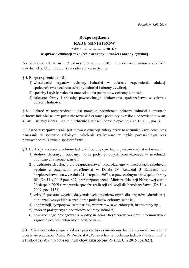 Projekt v. 8.09.2016 Rozporządzenie RADY MINISTRÓW z dnia ……………… 2016 r. w sprawie edukacji w zakresie ochrony ludności i obrony cywilnej Na podstawie art. 20 ust. 12 ustawy z dnia ……. 20.. r. o ochronie ludności i obronie cywilnej (Dz. U. …, poz. …) zarządza się, co następuje: § 1. Rozporządzenie określa: 1) właściwości organów ochrony ludności w zakresie zapewnienia edukacji społeczeństwa z zakresu ochrony ludności i obrony cywilnej, 2) sposoby i tryb kształcenia oraz szkolenia podmiotów ochrony ludności, 3) zalecane formy i sposoby powszechnego edukowania społeczeństwa w zakresie ochrony ludności. § 2.1. Ilekroć w rozporządzeniu jest mowa o podmiotach ochrony ludności i organach ochrony ludności należy przez nie rozumieć organy i podmioty określone odpowiednio w art. 4 i art. .. ustawy z dnia .. 20.. r. o ochronie ludności i obronie cywilnej (Dz. U. z …, poz. ). 2. Ilekroć w rozporządzeniu jest mowa o edukacji należy przez to rozumieć kształcenie oraz nauczanie w systemie szkolnym, szkolenia realizowane w trybie pozaszkolnym oraz powszechne edukowanie społeczeństwa. § 3. Edukacja w zakresie ochrony ludności i obrony cywilnej organizowana jest w formach: 1) studiów dziennych, zaocznych oraz podyplomowych prowadzonych w uczelniach publicznych i niepublicznych, 2) przedmiotu „Edukacja dla bezpieczeństwa” prowadzanego w placówkach szkolnych, zgodnie z przepisami określonymi w Dziale IV Rozdział 3 Edukacja dla bezpieczeństwa ustawy z dnia 21 listopada 1967 r. o powszechnym obowiązku obrony RP (Dz. U. z 2015 poz. 827) oraz rozporządzeniu Ministra Edukacji Narodowej z dnia 28 sierpnia 2009 r. w sprawie sposobu realizacji edukacji dla bezpieczeństwa (Dz. U. z 2009. poz. 1131), 3) szkoleń podstawowych i doskonalących organizowanych dla organów administracji publicznej wszystkich szczebli oraz podmiotów ochrony ludności, 4) konferencji, sympozjów, seminariów, warsztatów szkoleniowych, instruktarzy itp., 5) ćwiczeń praktycznych podmiotów ochrony ludności, 6) powszechnego propagowania wiedzy na temat bezpieczeństwa oraz informowania o zagrożeniach oraz właściwym postępowaniu. § 4. Działalność edukacyjna z zakresu powszechnej samoobrony ludności prowadzona jest na podstawie przepisów Działu IV Rozdział 4 „Powszechna samoobrona ludności” ustawy z dnia 21 listopada 1967 r. o powszechnym obowiązku obrony RP (Dz. U. z 2015 poz. 827). § 5. Szkolenia z zakresu ochrony ludności i obrony cywilnej zwane dalej „szkoleniami” organizowane są na szczeblu centralnym oraz terenowym (wojewódzkim, powiatowym, gminnym) oraz w zakładach pracy. § 6. Obowiązkowi szkoleń podlegają: 1) na szczeblu centralnym: a) wojewodowie i marszałkowie województw, b) dyrektorzy generalni i dyrektorzy wydziałów urzędów wojewódzkich, c) dyrektorzy lub kierownicy komórek organizacyjnych ministerstw i urzędów centralnych właściwych w sprawach obrony cywilnej, d) komendanci główni Policji, Państwowej Straży Pożarnej, Straży Granicznej oraz komendanci wojewódzcy Policji, Państwowej Straży Pożarnej, szefowie oddziałów Straży Granicznej oraz dyrektorzy biur komend głównych Policji, Państwowej Straży Pożarnej, Straży Granicznej właściwych do spraw obrony cywilnej, e) osoby zatrudnione na stanowiskach związanych z prowadzeniem spraw obrony cywilnej w urzędach administracji szczebla wojewódzkiego; 2) na szczeblu wojewódzkim: a) starostowie, b) wójtowie, burmistrzowie i prezydenci miast, c) osoby zatrudnione na stanowiskach związanych z prowadzeniem spraw obrony cywilnej w urzędach administracji szczebla powiatowego i gminnego, d) członkowie formacji obrony cywilnej szczebla wojewódzkiego, e) komendanci powiatowych formacji obrony cywilnej; 3) na szczeblu powiatowym: a) kierownicy powiatowych jednostek organizacyjnych, b) nauczyciele przedmiotu edukacji dla bezpieczeństwa, c) członkowie formacji obrony cywilnej szczebla powiatowego, d) komendanci gminnych formacji obrony cywilnej; 4) na szczeblu gminnym: a) kierownicy zakładów pracy, osoby zatrudnione w zakładach pracy wykonujące zadania z zakresu obrony cywilnej, b) nauczyciele przedmiotu edukacji dla bezpieczeństwa, c) członkowie formacji obrony cywilnej szczebla gminnego, 5) w zakładach pracy: a) komendanci zakładowych formacji obrony cywilnej, b) członkowie formacji obrony cywilnej szczebla zakładowego, c) kierownicy zakładów pracy, osoby zatrudnione w zakładach pracy wykonujące zadania z zakresu obrony cywilnej. § 7. Organizatorami szkoleń są: 1) na szczeblu centralnym – Szef Ochrony Ludności i Obrony Cywilnej Kraju, 2) na szczeblu wojewódzkim – szef ochrony ludności i obrony cywilnej województwa, 3) na szczeblu powiatowym – szef ochrony ludności i obrony cywilnej powiatu, 4) na szczeblu gminnym – szef ochrony ludności i obrony cywilnej gminy, 5) w zakładzie pracy – kierownik zakładu pracy. § 8. Szkolenia organizuje się na poziomie podstawowym i doskonalącym w formie zajęć teoretycznych i praktycznych. § 9.1. Szkolenia podstawowe organizowane są przez właściwych terytorialnie szefów obrony cywilnej oraz kierowników zakładów pracy na podstawie planów oraz programów szkoleń. 2. Szkolenia podstawowe mają na celu przekazanie wiedzy na temat potencjalnych zagrożeń, właściwości i odpowiedzialności podmiotów ochrony ludności w dziedzinie ochrony ludności i obrony cywilnej oraz opracowywania dokumentacji planistycznej dotyczącej ochrony ludności i obrony cywilnej. § 10.1. Szkolenia doskonalące mają na celu poszerzenie wiedzy i umiejętności zdobytych w czasie szkoleń podstawowych, niezbędnych do realizacji zadań z zakresu obrony cywilnej. 2. Formą szkolenia doskonalącego są szkolenia specjalistyczne organizowane i przeprowadzane przez podmioty ochrony ludności. § 11. Założenia programowe dla szkolenia podstawowego na szczeblu terenowym określa załącznik nr 1