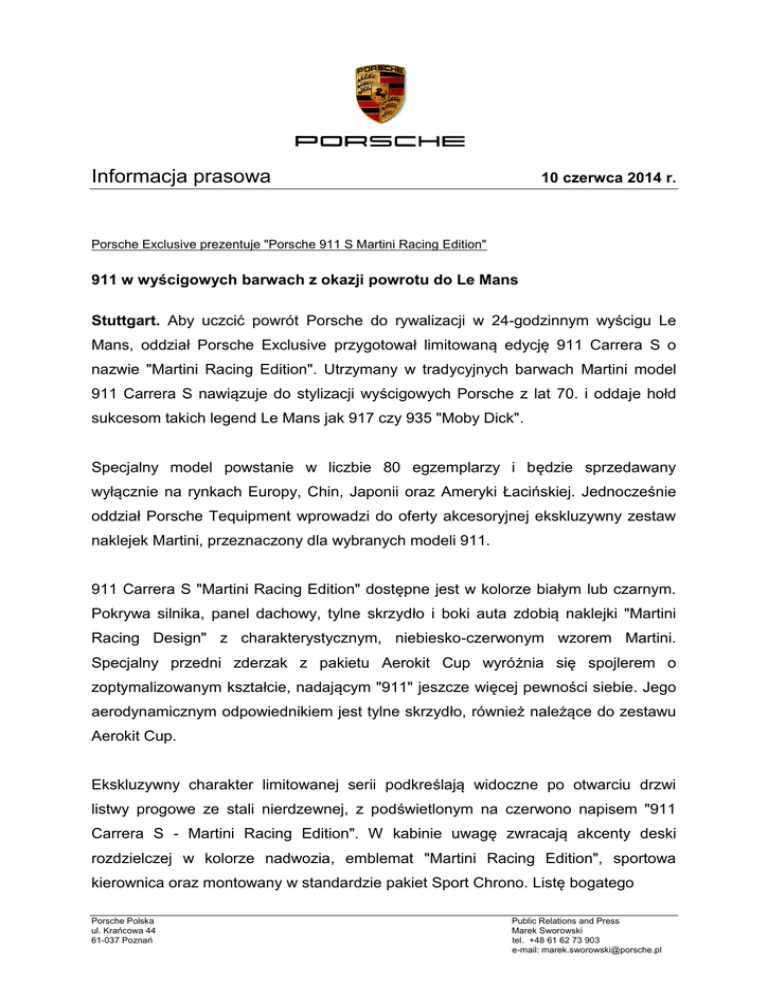 Informacja prasowa 10 czerwca 2014 r. Porsche Exclusive prezentuje "Porsche 911 S Martini Racing Edition" 911 w wyścigowych barwach z okazji powrotu do Le Mans Stuttgart. Aby uczcić powrót Porsche do rywalizacji w 24-godzinnym wyścigu Le Mans, oddział Porsche Exclusive przygotował limitowaną edycję 911 Carrera S o nazwie "Martini Racing Edition". Utrzymany w tradycyjnych barwach Martini model 911 Carrera S nawiązuje do stylizacji wyścigowych Porsche z lat 70. i oddaje hołd sukcesom takich legend Le Mans jak 917 czy 935 "Moby Dick". Specjalny model powstanie w liczbie 80 egzemplarzy i będzie sprzedawany wyłącznie na rynkach Europy, Chin, Japonii oraz Ameryki Łacińskiej. Jednocześnie oddział Porsche Tequipment wprowadzi do oferty akcesoryjnej ekskluzywny zestaw naklejek Martini, przeznaczony dla wybranych modeli 911. 911 Carrera S "Martini Racing Edition" dostępne jest w kolorze białym lub czarnym. Pokrywa silnika, panel dachowy, tylne skrzydło i boki auta zdobią naklejki "Martini Racing Design" z charakterystycznym, niebiesko-czerwonym wzorem Martini. Specjalny przedni zderzak z pakietu Aerokit Cup wyróżnia się spojlerem o zoptymalizowanym kształcie, nadającym "911" jeszcze więcej pewności siebie. Jego aerodynamicznym odpowiednikiem jest tylne skrzydło, również należące do zestawu Aerokit Cup. Ekskluzywny charakter limitowanej serii podkreślają widoczne po otwarciu drzwi listwy progowe ze stali nierdzewnej, z podświetlonym na czerwono napisem "911 Carrera S - Martini Racing Edition". W kabinie uwagę zwracają akcenty deski rozdzielczej w kolorze nadwozia, emblemat "Martini Racing Edition", sportowa kierownica oraz montowany w standardzie pakiet Sport Chrono. Listę bogatego Porsche Polska ul. Krańcowa 44 61-037 Poznań Public Relations and Press Marek Sworowski tel. +48 61 62 73 903 e-mail: [email protected] wyposażenia seryjnego uzupełniają takie elementy jak Porsche Communication Management (PCM) z modułem nawigacji, nagłośnienie Bose, obrotomierz z czarną tarczą oraz sterowane elektrycznie fotele obszyte czarną skórą. Sercem Porsche Martini jest 6-cylindrowy bokser o pojemności 3,8 litra i mocy 400 KM. Po aktywacji przycisku Sport Plus przyspieszenie od 0 do 100 km/h zajmuje mu zaledwie 4,1 s (wersja z przekładnią PDK). Z drugiej strony, średnie zużycie paliwa plasuje się na umiarkowanym poziomie - 8,7 l/100 km (emisja CO2: 202 g/km). Porsche 911 Carrera S "Martini Racing Edition" trafi do sprzedaży na rynkach europejskich (Holandia, Włochy, Hiszpania, Polska, Ukraina, Czechy, Cypr, Finlandia i Wielka Brytania) w czerwcu br. Od sierpnia specjalna edycja będzie dostępna w Chinach, a od października - w Japonii oraz w Ameryce Łacińskiej. Porsche Polska ul. Krańcowa 44 61-037 Poznań Public Relations and Press Marek Sworowski tel. +48 61 62 73 903 e-mail: [email protected]