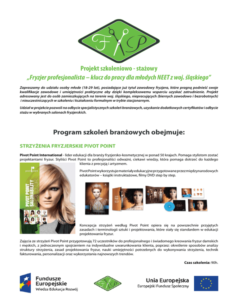 Projekt szkoleniowo - stażowy „Fryzjer profesjonalista – klucz do pracy dla młodych NEET z woj. śląskiego” Zapraszamy do udziału osoby młode (18-29 lat), posiadające już tytuł zawodowy fryzjera, które pragną podnieść swoje kwalifikacje zawodowe i umiejętności praktyczne aby dzięki kompleksowemu wsparciu uzyskać zatrudnienie. Projekt adresowany jest do osób zamieszkujących na terenie woj. śląskiego, niepracujących (biernych zawodowo i bezrobotnych) i nieuczestniczących w szkoleniu i kształceniu formalnym w trybie stacjonarnym. Udział w projekcie pozwoli na odbycie specjalistycznych szkoleń branżowych, uzyskanie dodatkowych certyfikatów i odbycie stażu w wybranych salonach fryzjerskich. Program szkoleń branżowych obejmuje: STRZYŻENIA FRYZJERSKIE PIVOT POINT Pivot Point International - lider edukacji dla branży fryzjersko-kosmetycznej w ponad 50 krajach. Pomaga stylistom zostać projektantami fryzur. Styliści Pivot Point to profesjonaliści odważni, ciekawi wiedzy, która pomaga dotrzeć do każdego klienta z precyzją i artyzmem. Pivot Point wykorzystuje materiały edukacyjne przygotowane przez międzynarodowych edukatorów – książki instruktażowe, filmy DVD step by step. Koncepcja strzyżeń według Pivot Point opiera się na powszechnie przyjętych zasadach i terminologii sztuki i projektowania, które stały się standardem w edukacji projektowania fryzur. Zajęcia ze strzyżeń Pivot Point przygotowują 72 uczestników do profesjonalnego i świadomego kreowania fryzur damskich i męskich, z jednoczesnym spojrzeniem na indywidualne uwarunkowania klienta, poprzez: określenie sposobów analizy struktury strzyżenia, zasad projektowania fryzur, nauki umiejętności potrzebnych do wykonywania strzyżenia, technik fakturowania, personalizacji oraz wykorzystania najnowszych trendów. Czas szkolenia: 90h. KREATYWNE TECHNIKI KOLORYZACJI WŁOSÓW Szkolenie przygotowujące 60 uczestników do wyboru odpowiedniej techniki koloryzacji, dostosowanej do indywidualnych potrzeb klienta, poprzez uzupełnienie wiedzy z zakresu teorii koloru i analizy kolorystycznej. Podczas szkolenia uczestnicy nauczą się posługiwać farbami tak aby wydobyć głębię każdego koloru czy pozbyć się niechcianego odcienia czy poprawić kolor. Nauczą się różnych technik koloryzacji niezbędnych do podkreślenia strzyżenia, kształtu twarzy czy typu urody klienta. Czas szkolenia: 90h. ODKSZTAŁCANIE WŁOSÓW Szkolenie przygotowujące 72 uczestników do nowych technologii odkształceń włosów, technik kręcenia i prostowania, a także strzyżenia i stylizacji włosów kręconych. Uczestnicy poznają nowe spojrzenie na różne typy odkształceń włosów z naciskiem na zwiększenie objętości i odbicia włosów od nasady a tym samym uzyskanie naturalnego efektu. Podczas szkolenia zostaną wykorzystane najnowsze technologie i produkty. Czas szkolenia: 80h. UPIĘCIA ART LIBRE ART LIBRE to francuski lider w branży profesjonalnych szkoleń fryzjerskich z upięć i koków. Art Libre uczy stylistów swojej metodologii upięć, a podczas szkoleń wykorzystuje profesjonalne materiały edukacyjne tj. książki, zeszyty i filmy step by step. Metoda Art Libre powstała w 1997 i jest dziś wykorzystywana przez wielu stylistów we Francji i służy jako program edukacyjny w szkołach fryzjerskich. Metoda opiera się na solidnych podstawach i szeregu praktycznych wskazówek dotyczących technik i akcesoriów stosowanych do upięć i koków. Nauka o objętości i przestrzeni 3D. Koki i upięcia klasyczne i nowoczesne jak również najnowsze trendy Haute Couture. Szkolenie uzupełnia wiedzę 60 uczestników z zakresu czesania upięć i koków, pozwala znacznie rozwinąć usługi w salonie z tego zakresu. Stylizacja długich włosów to bardzo ważna część usług, a szkolenie przygotuje do pracy z klientem. Czas szkolenia: 50h. PRZEDŁUŻANIE WŁOSÓW Szkolenie wyposażające 60 uczestników w dodatkowe umiejętności rozszerzające i uzupełniające usługi fryzjerskie poprzez przedstawienie technik przedłużania i zagęszczania włosów, naukę o treskach, dopinkach i perukach oraz o praktycznych zastosowaniu ww. elementów. Czas szkolenia: 50h. STYLIZACJA – KOMPUTEROWE PROJEKTOWANIE FRYZUR Szkolenie przygotowujące 84 uczestników do komputerowego projektowania fryzur. Szkolenie wykorzystuje komputerowy program projektowania fryzur w którym wszystkie fryzury zostały stworzone przez fryzjerów. Szkolenie wspomaga konsultacje z klientem poprzez wizualizację propozycji fryzur, co znacznie ułatwia podjęcie decyzji wyboru fryzury. Szkolenie przygotowuje uczestników do wykorzystanie profesjonalnej wiedzy w połączeniu z indywidualną konsultacją. Od projektu fryzury z wyborem formy strzyżenia, techniki koloryzacji do wykonania strzyżenia i personalizacji fryzury aby optymalnie dopasować się od indywidualnych potrzeb Klienta. Czas szkolenia: 30h. MAKIJAŻ SERWISOWY Szkolenie przygotowuje 60 uczestników do wyko-rzystania makijażu serwisowego jako uzupełnienia serwisu dla Klienta. Dzięki podstawowej wiedzy z za-kresu analizy kolorystycznej, kształtów twarzy i typów kolorystycznych, uczestnicy nauczą się podkreślić atrakcyjność każdej klientki po wykonanej usłudze fryzjerskiej. Uczestnicy staną się ekspertami do spraw urody, nauczą się podkreślać to co piękne i ukryć to co niepożądane. Uzupełnienie usługi fryzjerskiej makijażem serwisowym dodatkowym argumentem do przywiązania klientek do konkretnego salonu, a jednocześnie pozwoli osiągnąć dodatkowe korzyści. Czas szkolenia: 40h. PRZYGOTOWANIE MODELEK DO POKAZU Szkolenie przygotowujące 60 uczestników do profesjonalnej pracy z modelkami, polegającej na świadczeniu pełnego zakresu usług fryzjerskich w połączeniu z makijażem – wykonaniu pełnej stylizacji do pokazu. Celem zajęć jest możliwość prezentacji wszystkich nabytych umiejętności i przygotowanie pokazu dla potencjalnych
