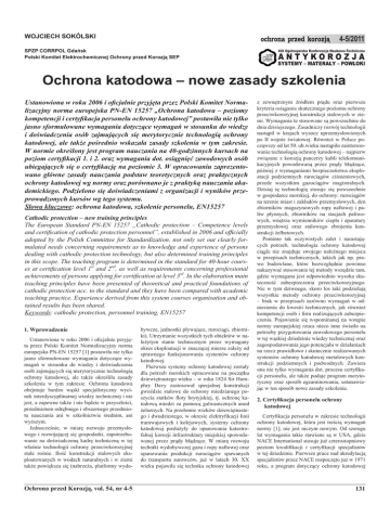 WOJCIECH SOKÓLSKI ochrona przed korozja SPZP CORRPOL Gdańsk Polski Komitet Elektrochemicznej Ochrony przed Korozją SEP 4-5/2011 XIX Ogólnopolska Konferencja Naukowo-Techniczna ANTYKOROZJA SYSTEMY – MATERAŁY – POWŁOKI Ochrona katodowa – nowe zasady szkolenia Ustanowiona w roku 2006 i oficjalnie przyjęta przez Polski Komitet Normalizacyjny norma europejska PN-EN 15257 „Ochrona katodowa – poziomy kompetencji i certyfikacja personelu ochrony katodowej” postawiła nie tylko jasno sformułowane wymagania dotyczące wymagań w stosunku do wiedzy i doświadczenia osób zajmujących się merytorycznie technologią ochrony katodowej, ale także pośrednio wskazała zasady szkolenia w tym zakresie. W normie określony jest program nauczania na 40-godzinnych kursach na poziom certyfikacji 1. i 2. oraz wymagania dot. osiągnięć zawodowych osób ubiegających się o certyfikację na poziomie 3. W opracowaniu zaprezentowano główne zasady nauczania podstaw teoretycznych oraz praktycznych ochrony katodowej wg normy oraz porównano je z praktyką nauczania akademickiego. Podzielono się doświadczeniami z organizacji i wyników przeprowadzonych kursów wg tego systemu. Słowa kluczowe: ochrona katodowa, szkolenie personelu, EN15257 Cathodic protection – new training principles The European Standard PN-EN 15257 „Cathodic protection – Competence levels and certification of cathodic protection personnel”, established in 2006 and officially adopted by the Polish Committee for Standardization, not only set out clearly formulated needs concerning requirements as to knowledge and experience of persons dealing with cathodic protection technology, but also determined training principles in this scope. The teaching program is determined in the standard for 40-hour coursst nd es at certification level 1 and 2 , as well as requirements concerning professional rd achievements of persons applying for certification at level 3 . In the elaboration main teaching principles have been presented of theoretical and practical foundations of cathodic protection acc. to the standard and they have been compared with academic teaching practice. Experience derived from this system courses organisation and obtained results has been shared. Keywords: cathodic protection, personnel training, EN15257 1. Wprowadzenie Ustanowiona w roku 2006 i oficjalnie przyjęta przez Polski Komitet Normalizacyjny norma europejska PN-EN 15257 [1] postawiła nie tylko jasno sformułowane wymagania dotyczące wymagań w stosunku do wiedzy i doświadczenia osób zajmujących się merytorycznie technologią ochrony katodowej, ale także określiła zasady szkolenia w tym zakresie. Ochrona katodowa obejmuje bardzo wąski specjalistyczny wycinek interdyscyplinarnej wiedzy technicznej i nie jest, a zapewne także i nie będzie w przyszłości, przedmiotem odrębnego i obszernego przedmiotu nauczania ani w szkolnictwie średnim, ani wyższym. Jednocześnie, w miarę rozwoju przemysłowego i rozwijającej się gospodarki, zapotrzebowanie na doświadczoną kadrę techniczną w tej właśnie technologii ochrony przeciwkorozyjnej stale rośnie. Ilość konstrukcji stalowych eksploatowanych w wodach naturalnych i w ziemi także powiększa się (nabrzeża, platformy wydo- Ochrona przed Korozją, vol. 54, nr 4-5 bywcze, jednostki pływające, rurociągi, zbiorniki). Utrzymanie wszystkich tych obiektów w należytym stanie technicznym przez wymagany okres eksploatacji w znaczącej mierze zależy od sprawnego funkcjonowania systemów ochrony katodowej. Pierwsze systemy ochrony katodowej zostały dla potrzeb morskich opracowane na początku dziewiętnastego wieku – w roku 1824 Sir Humphry Davy zastosował specjalnej konstrukcji gwoździe stalowe do ochrony miedzianego poszycia statków floty brytyjskiej, tj. ochronę katodową miedzi za pomocą galwanicznych anod żelaznych. Na przełomie wieków dziewiętnastego i dwudziestego, w okresie elektryfikacji linii tramwajowych i kolejowych, systemy ochrony katodowej posłużyły do opanowania katastrofalnej korozji infrastruktury miejskiej spowodowanej przez prądy błądzące. W miarę rozwoju techniki wydobywczej gazu i ropy naftowej oraz opanowania produkcji rurociągów spawanych do transportu surowców, już w latach 30. XX wieku pojawiła się technika ochrony katodowej z zewnętrznym źródłem prądu oraz pierwsze kryteria osiągania skutecznego poziomu ochrony przeciwkorozyjnej konstrukcji stalowych w ziemi. Wymagania te stosowane są powszechnie do dnia dzisiejszego. Zasadniczy rozwój technologii nastąpił w krajach wysoce uprzemysłowionych po II wojnie światowej. Również w Polsce począwszy od lat 50. ub.wieku nastąpiło zainteresowanie technologią ochrony katodowej – najpierw związane z korozją pancerzy kabli telekomunikacyjnych powodowaną przez prądy błądzące, później z wymaganiami bezpieczeństwa eksploatacji podziemnych rurociągów ciśnieniowych, przede wszystkim gazociągów magistralnych. Dzisiaj tę technologię stosuje się powszechnie w gospodarce morskiej, do ochrony: rurociągów na terenie miast i zakładów przemysłowych, den zbiorników magazynowych ropy naftowej i paliw płynnych, zbiorników na stacjach paliwowych, wnętrza wymienników ciepła i aparatury przemysłowej oraz stalowego zbrojenia konstrukcji żelbetowych. Pomimo tak oczywistych zalet i narastających potrzeb, technologia ochrony katodowej ciągle nie znajduje swojego należnego miejsca w przepisach technicznych, takich jak np. prawo budowlane, które bezwzględnie powinno nakazywać stosowanie tej metody wszędzie tam, gdzie wymagana jest odpowiednio wysoka skuteczność zabezpieczenia przeciwkorozyjnego. Nic w tym dziwnego, skoro los taki podzielają wszystkie metody ochrony przeciwkorozyjnej – brak w przepisach zarówno wymagań w odniesieniu do kwestii technicznych, jak również kompetencji osób i firm realizujących zabezpieczenia. Pojawienie się wspominanej na wstępie 