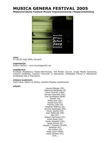 MUSICA GENERA FESTIVAL 2005 Międzynarodowy Festiwal Muzyki Improwizowanej i Eksperymentalnej czas: 27-28-29 maja 2005, Szczecin organizacja: Musica Genera – www.musicagenera.net współpraca: Fundacja Współpracy Polsko-Niemieckiej, The British Council, Urząd Miasta Szczecina, Instytut Goethego, Instytut Francuski w Warszawie, Ambasada Francji w Warszawie, Ambasada USA w Warszawie miejsca wydarzeń: Teatr Kana, Opera na Zamku, Rzeźnia Miejska (Łasztownia) artyści: Laurent Berger (FR) Johannes Bergmark (S) Kevin Drumm (USA) Myriam Gourfink (FR), Ivar Grydeland (NOR) Hecker (D) Philip Jeck (UK) Paweł Kula (PL) Thomas Lehn (D) Stephan Mathieu (D) Jerome Noetinger (FR) Xavier Quérel (FR) Jean Pallandre (FR) Pita (AT) Robert Piotrowicz (PL) Keith Rowe (UK) Janek Schaefer (UK) Ignaz Schick (D) Kasper T Toeplitz (PL/FR) Wolfram (PL) Ute Volker (D) Ingar Zach (NOR) Anna Zaradny (PL) i inni... Kolejna, czwarta już edycja Musica Genera Festival 2005 odbędzie się 27, 28 i 29 maja w Szczecinie. Wydarzenia festiwalowe zagoszczą – jak corocznie – w kilku przestrzeniach miasta. Tradycyjnie już główną sceną pozostaje Teatr Kana, niemniej po sukcesie zeszłorocznego nocnego koncertu na terenie byłej Rzeźni Miejskiej (wyspa Łasztownia), część wieczornych koncertów, projekcji i instalacji zaplanowana jest właśnie tam. Zupełnie nowym miejscem dla festiwalu jest Opera na Zamku w Szczecinie. Festiwal Musica Genera zaczynał swoje prezentacje od zjawisk wpisanych w nurt muzyki improwizowanej. Zapraszani goście występowali w specjalnie zaaranżowanych na festiwal składach. Stopniowo jednak festiwal zaczął rozszerzać horyzonty, poprzez coraz bardziej skrajne formy instrumentalistów, zahaczając o inne gatunki, muzykę konkretną czy noise. Edycja z roku 2004 poruszała problem kompozycji w konfrontacji z improwizacją. Tegoroczny festiwal zmieniając podtytuł na Międzynarodowy Festiwal Muzyki Improwizowanej i Eksperymentalnej – otwiera się szeroko na wszelkie zjawiska związane ze współczesnym eksperymentem. Muzyka improwizowana pozostaje naturalnym kręgosłupem festiwalu, niemniej już nie w tak dominującej formie określać będzie kształt festiwalu. MGF 2005 zaprezentuje szereg znakomitych postaci i często ikon w swoich specjalizacjach. Kevin Drumm, Peter Rehberg, Keith Rowe czy Jerome Noetinger to osobowości wyznaczające kierunki we współczesnej muzyce. Obok nich zobaczymy Kaspera T Toeplitza, Janka Schaefera, Philipa Jecka czy Stephana Mathieu reprezentujących kompozytorskie oblicze muzyki eksperymentalnej. Nie zabraknie oczywiście improwizatorów takich jak: Thomas Lehn, , Ingar Zach, Ignaz Schick, Ute Volker, Ivar Grydeland. Spektrum programu uzupełniają muzycy poruszający się na granicy gatunków – muzyka improwizowana, konkretna, noise itd. – Jean Pallandre, Wolfram, Anna Zaradny, Ignaz Schick, Robert Piotrowicz. Nowymi zjawiskami na festiwalu będą szerokie prezentacje z pogranicza eksperymentalnego filmu i muzyki. Francuska grupa w składzie Jerome Noetinger, Xavier Quérel i Laurent Berger (Noetinger i Quérel tworzą osławiony kolektyw Metamkine) zaprezentuje wielki audiowizualny spektakl na jednym z nocnych koncertów. Prócz tego odbędzie się kilka projekcji w mniejszym zakresie, m.in. prezentacja INDEX – wydawnictwa filmowego. Na festiwalu zobaczymy też szereg instalacji dźwiękowych i wizualnych ulokowanych na terenie byłej Rzeźni Miejskiej. Autorami prac będą Philip Jeck, Paweł Kula i Johannes Bergmark. program program program program program program program program piątek 27 maja 2005 20:00 - Teatr Kana, pl. św. Piotra i Pawła 4/5 IGNAZ SCHICK - WOLFRAM Ignaz Schick (D) – gramofony, elektronika Wolfram (PL)- laptop JEAN PALLANDRE - UTE VÖLKER - INGAR ZACH - ANNA ZARADNY Jean Pallandre (FR) – taśmy, elektronika Ute Völker (D) – akordeon Ingar Zach (NOR) – perkusja Anna Zaradny (PL) – saksofon altowy, laptop 24:00 – Rzeźnia Miejska, Łasztownia, ul. Władysława IV HECKER Hecker (D) - laptop KEVIN DRUMM Kevin Drumm (USA) - elektronika sobota 28 maja 2005 12:00-15:30 – instalacje, Rzeźnia Miejska, Łasztownia, ul. Władysława IV instalacje autorstwa Philipa Jecka (UK), Pawła Kuli (PL), Johannesa Bergmarka (S) 14:00 – Muzeum Narodowe, ul. Staromłyńska Isabelle Piechaczyk – spotkanie i prezentacja wydawnictwa filmowego INDEX 16:00 – Opera na Zamku, ul. Korsarzy 34 STEPHAN MATHIEU Stephan Mathieu (D) – laptop, projekcja 18:00 – Teatr Kana, pl. św. Piotra i Pawła 4/5 KASPER T TOEPLITZ Kasper T Toeplitz (PL/FR) – laptop, gitara basowa 20:00 - Teatr Kana, pl. św. Piotra i Pawła 4/5 IVAR GRYDELAND – THOMAS LEHN – INGAR ZACH Ivar Grydeland (NOR) – gitara Thomas Lehn (D) – syntezator analogowy Ingar Zach (NOR) – perkusja KEITH ROWE Keith Rowe (UK) – gitara, elektronika PHILIP JECK - JANEK SCHAEFER Philip Jeck (UK) – gramofony Janek Schaefer (UK) - gramofony 24:00 – Rzeźnia Miejska, Łasztownia, ul. Władysława IV ANNA ZARADNY Anna Zaradny (PL) – laptop PITA Pita (AT) - laptop LAURENT BERGER – JEROME NOETINGER – XAVIER QUEREL Laurent Berger (FR) - projekcja Jerome Noetinger (FR) – taśmy, elektronika Xavier Quérel (FR) – projekcja niedziela 29 maja 2005 12:00-15:30 – instalacje, Rzeźnia Miejska, Łasztownia, ul. Władysława IV instalacje autorstwa Philipa Jecka (UK), Pawła Kuli (Pl), Johannesa Bergmarka (S) 16:00 – Opera na Zamku, ul. Korsarzy 34 MARINE Myriam Gourfink (FR)– taniec Kasper T Toeplitz (PL/FR) – muzyka 18:00 – Teatr Kana, pl. św. Piotra i Pawła 4/5 STEPHAN MATHIEU - JANEK SCHAEFER Stephan Mathieu (D) – laptop Janek Schaefer (UK) – gramofony 20:00 - Teatr Kana, pl. św. Piotra i Pawła 4/5 IVAR GRYDELAND - UTE VÖLKER - IGNAZ SCHICK Ivar Grydeland (NOR) – gitara Ute Völker (D) – akordeon Ignaz Schick (D) – gramofony, elektronika THOMAS LEHN - JEAN PALLANDRE Thomas Lehn (D) – syntezator analogowy Jean Pallandre (FR) – 