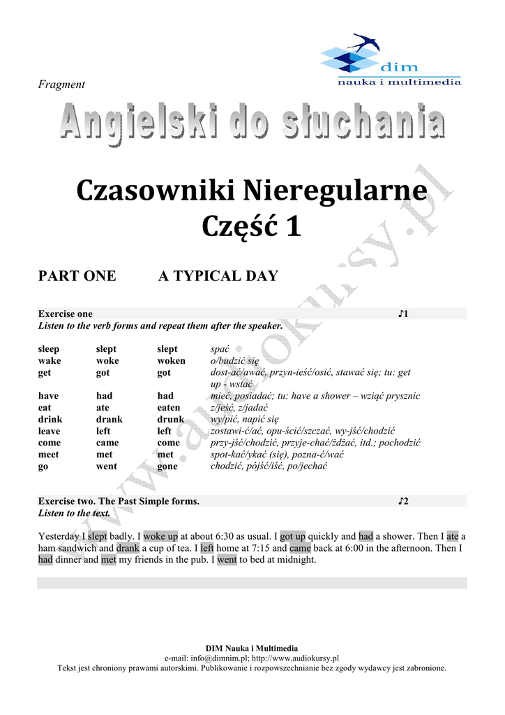 Fragment Czasowniki Nieregularne Część 1 PART ONE A TYPICAL DAY Exercise one Listen to the verb forms and repeat them after the speaker. sleep wake get slept woke got slept woken got have eat drink leave come meet go had ate drank left came met went had eaten drunk left come met gone Exercise two. The Past Simple forms. Listen to the text. ♪1 spać o/budzić się dost-ać/awać, przyn-ieść/osić, stawać się; tu: get up - wstać mieć, posiadać; tu: have a shower – wziąć prysznic z/jeść, z/jadać wy/pić, napić się zostawi-ć/ać, opu-ścić/szczać, wy-jść/chodzić przy-jść/chodzić, przyje-chać/żdżać, itd.; pochodzić spot-kać/ykać (się), pozna-ć/wać chodzić, pójść/iść, po/jechać ♪2 Yesterday I slept badly. I woke up at about 6:30 as usual. I got up quickly and had a shower. Then I ate a ham sandwich and drank a cup of tea. I left home at 7:15 and came back at 6:00 in the afternoon. Then I had dinner and met my friends in the pub. I went to bed at midnight. DIM Nauka i Multimedia e-mail: [email protected]; http://www.audiokursy.pl Tekst jest chroniony prawami autorskimi. Publikowanie i rozpowszechnianie bez zgody wydawcy jest zabronione.