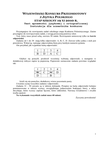 WOJEWÓDZKI KONKURS PRZEDMIOTOWY Z JĘZYKA POLSKIEGO ETAP SZKOLNY 19 XI 2010 R. Test sprawności językowej i ortograficznej Instrukcja dla uczestnika konkursu Przystępujesz do rozwiązania zadań szkolnego etapu Konkursu Polonistycznego. Zanim przystąpisz do rozwiązywania zadań, z uwagą przeczytaj poniższy tekst. Test, który masz przed sobą, zawiera 50 zadań. Rozwiązania umieszczaj tylko na karcie odpowiedzi. Zadania od 1 do 30 mają kilka odpowiedzi: A, B, C, D. Zawsze tylko jedna z nich jest prawdziwa. Wskaż ją, wpisując odpowiednią literę przy każdym numerze pytania. Oto przykład, jak wypełniać kartę odpowiedzi: 1 B 2 D 3 A 4 C Gdybyś się pomylił, przekreśl wcześniej wybraną odpowiedź, a następnie w dodatkowej rubryce zapisz tę poprawną. Poprawnie zaznaczone zadanie powinno wyglądać tak: 1 B D 2 C 3 A B 4 D Jeżeli się nie pomylisz, dodatkowy wiersz pozostanie pusty. Uważnie czytaj wszystkie zadania i odpowiedzi. Zadania 31 - 50 zawarte są w tekście dyktanda. Przepisz na kartę odpowiedzi kolejno ponumerowane w tekście wyrazy, uwzględniając jednocześnie brakujące litery, a także decydując, które wyrazy zapisać łącznie, które oddzielnie. Nawiasy kwadratowe i zwykłe trzeba opuścić. Na wykonanie wszystkich zadań masz 60 minut. Życzymy powodzenia! 1 1. Którą literą alfabetu jest „ć” ? A. czwartą B. piątą C. szóstą D. siódmą 2. W którym wyrazie liczba liter jest równa liczbie głosek? A. wyliczanka B. niespodzianka C. dysproporcja D. wspomnienie 3. Na którą sylabę pada akcent w wyrazie opera? A. pierwszą od końca B. drugą od końca C. trzecią od końca D. wyraz nieakceptowany 4. Niepoprawnie zaznaczono akcent w wyrazie: A. zrobiłbym. B. zrobiliby. C. zrobilibyśmy. D. zrobilibyście. 5. Który wyraz ma najmniej głosek? A. krzyżodziób B. czyżyk C. gżegżółka D. czeczotka 6. Fleksja to nauka o A. dźwiękach mowy ludzkiej. B. częściach mowy i ich odmianie. C. częściach zdania. D. budowie wyrazów. 7. Nazwij części mowy, jakimi są wyrazy w zdaniu: Kasia pięknie śpiewa i tańczy. A. rzeczownik, spójnik, przymiotnik, przysłówek, czasownik B. przymiotnik, rzeczownik, spójnik ,przysłówek, czasownik C. rzeczownik, przymiotnik, czasownik, spójnik, czasownik D. rzeczownik, przysłówek, czasownik, spójnik, czasownik 8. Ile nieodmiennych części mowy występuje w zdaniu W sobotni poranek Weronika niespodziewanie zapragnęła pójść do zoo? A. 6 B. 5 C. 4 D. 3 9. Nie jest rzeczownikiem wyraz A. pisanie. B. pismo. C. pisano. D. pisanka. 2 10. Najwięcej liczebników zawiera zestaw: A. ósemka, siedmioro, sześciokąt, dwa B. stonoga, ośmiokąt, trójząb, ośmiornica C. jedynka, szóstka, siódemka, dziesiąta D. podwójny, drugi, dwieście, dwusetny 11. Ile form tematów występuje w odmianie rzeczownika ród przez przypadki w liczbie poj. i mn.? A. 3 B. 4 C. 1 D. 2 12. Która z podanych form rzeczownika jest niepoprawna? A. Afrykańczykiem B. przyjacielami C. rękoma D. imionom 13. W jakich przypadkach zostały użyte rzeczowniki w zdaniu Krzysiowi nie podobał się klasowy pomysł związany z wyjazdem? A. celownik, mianownik, narzędnik B. dopełniacz, biernik narzędnik C. celownik, biernik, miejscownik D. celownik, dopełniacz, narzędnik 14. Która forma wyrazu w dopełniaczu liczby pojedynczej jest niepoprawna? A. hrabiego B. sędziego C. gdańszczanina D. chrześcijana 15. W którym z podanych zdań użyto trybu rozkazującego? A. Twój czas minął. B. Wiernie służcie królowi. C. Tutaj zasiądą najznakomitsi rycerze. D. Wiele was czeka przygód. 16. Wyraz "młodszy" jest wyrażony w stopniu A. równym. B. najwyższym. C. wyższym. D. ten wyraz nie podlega stopniowaniu. 17. Zaznacz równoważnik zdania. A. Nie płacz! B. Pada deszcz. C. Niech piszą. D. Burza na morzu. 18. Znajdź związek wyrazowy, który nie występuje w zdaniu Monika lubi spacery do pobliskiego parku. A. spacery do pobliskiego B. Monika lubi C. lubi spacery D. spacery do parku 3 19. Wskaż zdanie z podmiotem domyślnym. A. Zosia jedzie do domu. B. Ona jedzie do domu. C. Wróciłam z wakacji. D. Rysiu wrócił z wakacji wypoczęty. 20. W zdaniu Hania jest piękna orzecznik wyrażony jest: A. orzeczeniem imiennym. B. rzeczownikiem. C. czasownikiem. D. przymiotnikiem. 21. Jak należałoby zakończyć wypowiedzenie Jan kupił książkę, aby utworzyć zdanie współrzędnie złożone? A. którą poleciła mu mama. B. i wrócił do domu. C. dla szkolnej biblioteki. D. ponieważ chciał ją przeczytać. 22. Prawidłowo zastosowano interpunkcję w zdaniu: A. Cała klasa wybiera się na wycieczkę, a ja muszę zostać w domu. B. Widziałam plac zabaw na którym bawił się mój brat. C. Ani nie poszedł do kina ani nie wybrał się do teatru. D. Miałaś przyjść wczoraj a przychodzisz dopiero dzisiaj. 23. Prawidłowe zestawienie wyrazu podstawowego i pochodnego zawiera szereg: A. lis - listopad B. morze - marynarz C. bieżnia - biegacz D. puch – puszek 24. Który podział słowotwórczy wyrazu jest poprawny? A. kawiar - nia B. kawia – rnia C. kawiarni – a D. kawi - arnia 25. Wskaż szereg wyrazów nacechowanych emocjonalnie. A. ziółko, ananas, dziecko. B. gadał, recytował, mówił. C. pismak, grafoman, wierszokleta. D. kocisko, koteczek, kot. 26. Zaznacz rodzinę wyrazów: A. szlachcic, szlachetny, szlachectwo B. szlachetny, prawy, prawomyślny C. szlachetny, wzniosły, wspaniałomyślny D. szlachetny, szlak, szlam 27. Pary wyrazów ujemny – dodatni, diabeł - anioł to przykłady: A. synonimów. B. antonimów. C. homonimów. D. wyrazów pokrewnych. 4 28. W którym zdaniu nie popełniono błędu? A. Kolejka za chlebem była długa. B. Dzięki tobie odniosłem porażkę. C. W miesiącu październiku było ciepło. D. Nie lubię mleka z kakao. 29. Wskaż niepoprawny sposób zapisu nazwy własnej. A. Morze Bałtyckie B. morze Bałtyk C. jezioro Gopło D. Jezioro Gopło 30. Hasło wagabunda m, w lp odm. jak ż IV,