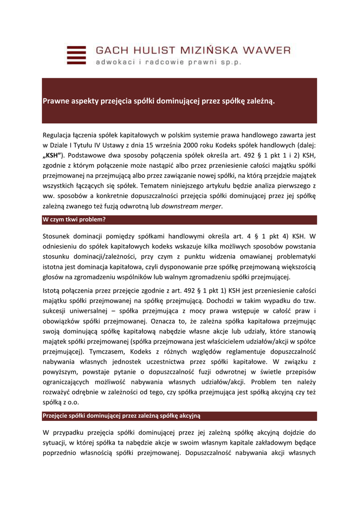 Prawne aspekty przejęcia spółki dominującej przez spółkę zależną. Regulacja łączenia spółek kapitałowych w polskim systemie prawa handlowego zawarta jest w Dziale I Tytułu IV Ustawy z dnia 15 września 2000 roku Kodeks spółek handlowych (dalej: „KSH”). Podstawowe dwa sposoby połączenia spółek określa art. 492 § 1 pkt 1 i 2) KSH, zgodnie z którym połączenie może nastąpić albo przez przeniesienie całości majątku spółki przejmowanej na przejmującą albo przez zawiązanie nowej spółki, na którą przejdzie majątek wszystkich łączących się spółek. Tematem niniejszego artykułu będzie analiza pierwszego z ww. sposobów a konkretnie dopuszczalności przejęcia spółki dominującej przez jej spółkę zależną zwanego też fuzją odwrotną lub downstream merger. W czym tkwi problem? Stosunek dominacji pomiędzy spółkami handlowymi określa art. 4 § 1 pkt 4) KSH. W odniesieniu do spółek kapitałowych kodeks wskazuje kilka możliwych sposobów powstania stosunku dominacji/zależności, przy czym z punktu widzenia omawianej problematyki istotna jest dominacja kapitałowa, czyli dysponowanie prze spółkę przejmowaną większością głosów na zgromadzeniu wspólników lub walnym zgromadzeniu spółki przejmującej. Istotą połączenia przez przejęcie zgodnie z art. 492 § 1 pkt 1) KSH jest przeniesienie całości majątku spółki przejmowanej na spółkę przejmującą. Dochodzi w takim wypadku do tzw. sukcesji uniwersalnej – spółka przejmująca z mocy prawa wstępuje w całość praw i obowiązków spółki przejmowanej. Oznacza to, że zależna spółka kapitałowa przejmując swoją dominującą spółkę kapitałową nabędzie własne akcje lub udziały, które stanowią majątek spółki przejmowanej (spółka przejmowana jest właścicielem udziałów/akcji w spółce przejmującej). Tymczasem, Kodeks z różnych względów reglamentuje dopuszczalność nabywania własnych jednostek uczestnictwa przez spółki kapitałowe. W związku z powyższym, powstaje pytanie o dopuszczalność fuzji odwrotnej w świetle przepisów ograniczających możliwość nabywania własnych udziałów/akcji. Problem ten należy rozważyć odrębnie w zależności od tego, czy spółka przejmująca jest spółką akcyjną czy też spółką z o.o. Przejęcie spółki dominującej przez zależną spółkę akcyjną W przypadku przejęcia spółki dominującej przez jej zależną spółkę akcyjną dojdzie do sytuacji, w której spółka ta nabędzie akcje w swoim własnym kapitale zakładowym będące poprzednio własnością spółki przejmowanej. Dopuszczalność nabywania akcji własnych GACH, HULIST, MIZIŃSKA, WAWER – ADWOKACI I RADCOWIE PRAWNI SP.P. określa art. 362 KSH, który w § 1 pkt 3) dopuszcza nabycie akcji własnych w drodze sukcesji uniwersalnej. Jako, że art. 494 KSH przesądza iż spółka przejmująca wstępuje w ogół praw i obowiązków spółki przejmowanej to nie ulega wątpliwości dopuszczalność przejęcia spółki dominującej przez jej zależną spółkę akcyjną. Należy jednak pamiętać o art. 364 § 2 KSH, zgodnie z którym „Spółka nie wykonuje praw udziałowych z własnych akcji, z wyjątkiem uprawnień do ich zbycia lub wykonywania czynności, które zmierzają do zachowania tych praw.” Oznacza to, że spółka po dokonaniu fuzji nie będzie mogła wykonywać jakichkolwiek praw udziałowych, w tym prawa do dywidendy oraz prawa głosu. W skrajnej sytuacji przejęcia spółki dominującej przez spółkę zależną, w której spółka dominująca posiada 100% akcji walne zgromadzenie przejmującej spółki akcyjnej nie będzie zatem mogło podjąć żadnej uchwały (w drodze przejęcia spółka uzyska bowiem 100% własnych akcji). Rozwiązaniem w takim wypadku jest pozbawienie spółki dominującej statusu 100% akcjonariusza przed dokonaniem fuzji. Przejęcie spółki dominującej przez zależną spółkę z o.o. Znacznie bardziej złożonym problemem jest dopuszczalność przeprowadzenia downstream merger w przypadku, gdy spółką przejmującą jest zależna spółka z o.o. Kontrowersja zasadza się na brzmieniu art. 200 § 1 KSH, zgodnie z którym „Spółka nie może obejmować lub nabywać ani przyjmować w zastaw własnych udziałów. Zakaz ten dotyczy również obejmowania lub nabywania udziałów bądź przyjmowania ich w zastaw przez spółkę albo spółdzielnię zależną. Wyjątek stanowi nabycie w drodze egzekucji na zaspokojenie roszczeń spółki, których nie można zaspokoić z innego majątku wspólnika, nabycie w celu umorzenia udziałów oraz nabycie albo objęcie udziałów w innych przypadkach przewidzianych w ustawie.” W przepisie tym nie ma zatem mowy o dopuszczalności nabywania udziałów własnych w drodze sukcesji generalnej w odróżnieniu od art. 362 § 1 pkt 3) KSH, który wprowadza taką możliwość w odniesieniu do spółki akcyjnej. Z tego względu, istnieje kontrowersja czy takie nabycie własnych udziałów w związku z fuzją odwrotną jest w ogóle dopuszczalne, a zatem czy w konsekwencji sama fuzja w ogóle może zostać przeprowadzona? W nauce prawa handlowego zarysowały się 2 stanowiska uzasadniające dopuszczalność przeprowadzenia takiego połączenia spółek. Pierwszy pogląd zakłada, że art. 200 § 1 KSH w ogóle nie ma zastosowania do sytuacji fuzji odwrotnej, gdyż odnosi się on do pojęcia „nabycia” rozumianego jako przejęcie konkretnego składnika majątkowego (sukcesja syngularna) w drodze konkretnej czynności nakierowanej na nabycie tego składnika majątkowego. Tymczasem, w przypadku fuzji mamy do czynienia nie tyle z nabyciem udziałów co z sukcesją uniwersalną, w drodze której następuje przejęcie całości majątku spółki przejmowanej, w skład którego wchodzą również udziały spółki przejmującej. Przy takiej wykładni nabycie własnych udziałów nie podlegało by żadnej reglamentacji a spółka mogłaby wykonywać wszystk