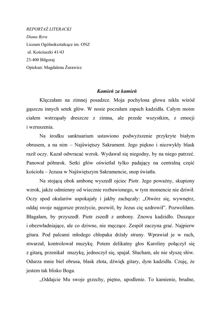 15. Byra Diana, LO im. ONZ w Biłgoraju, reportaż literacki