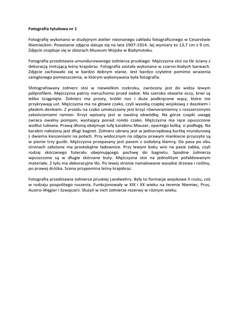 Fotografia tytułowa nr 1 Fotografię wykonano w studyjnym atelier nieznanego zakładu fotograficznego w Cesarstwie Niemieckim. Powstanie zdjęcia datuje się na lata 1907-1914. Jej wymiary to 13,7 cm x 9 cm. Zdjęcie znajduje się w zbiorach Muzeum Wojska w Białymstoku. Fotografia przedstawia umundurowanego żołnierza pruskiego. Mężczyzna stoi na tle ściany z dekoracją imitującą leśny krajobraz. Fotografia została wykonana w czarno-białych barwach. Zdjęcie zachowało się w bardzo dobrym stanie. Jest bardzo czytelne pomimo wrażenia zamglonego pomieszczenia, w którym wykonywana była fotografia. Sfotografowany żołnierz stoi w niewielkim rozkroku, zwrócony jest do widza lewym półprofilem. Mężczyzna patrzy nieruchomo przed siebie. Ma szeroko otwarte oczy, brwi są lekko ściągnięte. Żołnierz ma prosty, krótki nos i duże podkręcone wąsy, które nie przykrywają ust. Mężczyzna ma na głowie czako, czyli wysoką czapkę wojskową z daszkiem i płaskim denkiem. Z przodu na czako umieszczony jest krzyż równoramienny z rozszerzonymi zakończeniami ramion. Krzyż wpisany jest w owalną obwódkę. Na górze czapki uwagę zwraca owalny pompon, wystający ponad rondo czako. Mężczyzna ma ręce opuszczone wzdłuż tułowia. Prawą dłonią obejmuje lufę karabinu Mauser, opartego kolbą o podłogę. Na karabin nałożony jest długi bagnet. Żołnierz ubrany jest w jednorzędową kurtkę mundurową z dwiema kieszeniami na połach. Przy widocznym na zdjęciu prawym mankiecie przyszyte są w pionie trzy guziki. Mężczyzna przepasany jest pasem z ozdobną klamrą. Do pasa po obu stronach założone ma prostokątne ładownice. Przy lewym boku wisi na pasie żabka, czyli rodzaj skórzanego futerału obejmującego pochwę do bagnetu. Spodnie żołnierza wpuszczone są w długie skórzane buty. Mężczyzna stoi na jednolitym pofałdowanym materiale. Z tyłu ma dekoracyjne tło. Po lewej stronie namalowane wysokie drzewa i rośliny, po prawej dróżka. Scena przypomina leśny krajobraz. Fotografia przedstawia żołnierza pruskiej Landwehry. Były to formacje wojskowe II rzutu, coś w rodzaju pospolitego ruszenia. Funkcjonowały w XIX i XX wieku na terenie Niemiec, Prus, Austro-Węgier i Szwajcarii. Służyli w nich żołnierze rezerwy w różnym wieku.