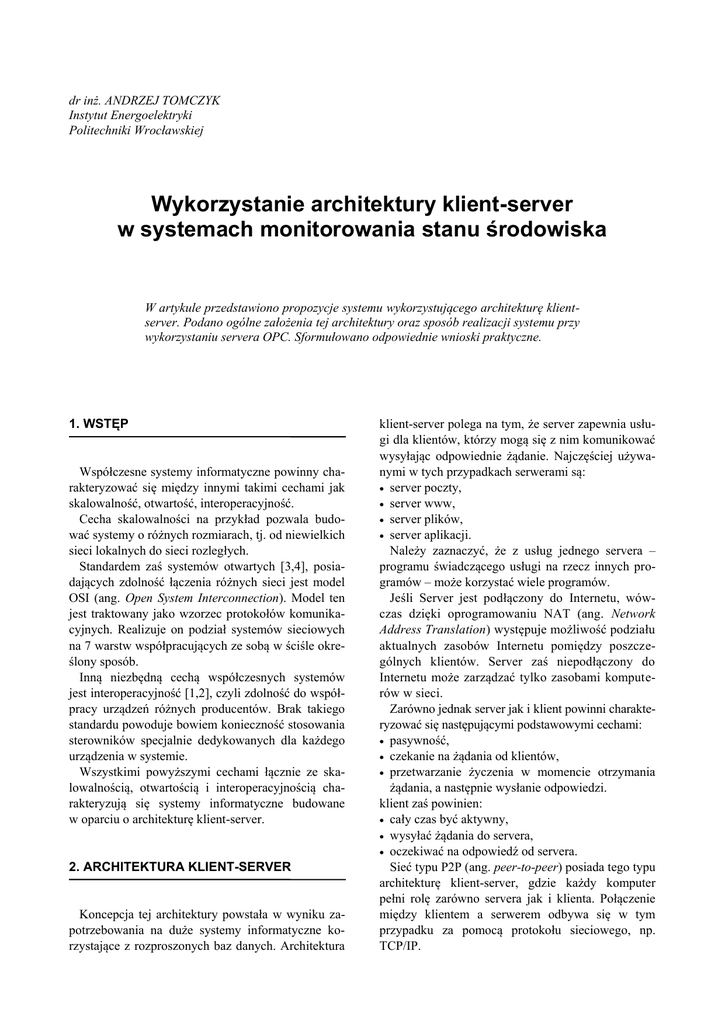 dr inż. ANDRZEJ TOMCZYK Instytut Energoelektryki Politechniki Wrocławskiej Wykorzystanie architektury klient-server w systemach monitorowania stanu środowiska W artykule przedstawiono propozycje systemu wykorzystującego architekturę klientserver. Podano ogólne założenia tej architektury oraz sposób realizacji systemu przy wykorzystaniu servera OPC. Sformułowano odpowiednie wnioski praktyczne. 1. WSTĘP Współczesne systemy informatyczne powinny charakteryzować się między innymi takimi cechami jak skalowalność, otwartość, interoperacyjność. Cecha skalowalności na przykład pozwala budować systemy o różnych rozmiarach, tj. od niewielkich sieci lokalnych do sieci rozległych. Standardem zaś systemów otwartych [3,4], posiadających zdolność łączenia różnych sieci jest model OSI (ang. Open System Interconnection). Model ten jest traktowany jako wzorzec protokołów komunikacyjnych. Realizuje on podział systemów sieciowych na 7 warstw współpracujących ze sobą w ściśle określony sposób. Inną niezbędną cechą współczesnych systemów jest interoperacyjność [1,2], czyli zdolność do współpracy urządzeń różnych producentów. Brak takiego standardu powoduje bowiem konieczność stosowania sterowników specjalnie dedykowanych dla każdego urządzenia w systemie. Wszystkimi powyższymi cechami łącznie ze skalowalnością, otwartością i interoperacyjnością charakteryzują się systemy informatyczne budowane w oparciu o architekturę klient-server. 2. ARCHITEKTURA KLIENT-SERVER Koncepcja tej architektury powstała w wyniku zapotrzebowania na duże systemy informatyczne korzystające z rozproszonych baz danych. Architektura klient-server polega na tym, że server zapewnia usługi dla klientów, którzy mogą się z nim komunikować wysyłając odpowiednie żądanie. Najczęściej używanymi w tych przypadkach serwerami są: server poczty, server www, server plików, server aplikacji. Należy zaznaczyć, że z usług jednego servera – programu świadczącego usługi na rzecz innych programów – może korzystać wiele programów. Jeśli Server jest podłączony do Internetu, wówczas dzięki oprogramowaniu NAT (ang. Network Address Translation) występuje możliwość podziału aktualnych zasobów Internetu pomiędzy poszczególnych klientów. Server zaś niepodłączony do Internetu może zarządzać tylko zasobami komputerów w sieci. Zarówno jednak server jak i klient powinni charakteryzować się następującymi podstawowymi cechami: pasywność, czekanie na żądania od klientów, przetwarzanie życzenia w momencie otrzymania żądania, a następnie wysłanie odpowiedzi. klient zaś powinien: cały czas być aktywny, wysyłać żądania do servera, oczekiwać na odpowiedź od servera. Sieć typu P2P (ang. peer-to-peer) posiada tego typu architekturę klient-server, gdzie każdy komputer pełni rolę zarówno servera jak i klienta. Połączenie między klientem a serwerem odbywa się w tym przypadku za pomocą protokołu sieciowego, np. TCP/IP. 134 MECHANIZACJA I AUTOMATYZACJA GÓRNICTWA Najczęściej jest tutaj realizowany taki schemat postępowania, w którym po nawiązaniu połączenia (pomiędzy klientem a serwerem), klient wysyła zapytanie w formacie servera i oczekuje na odpowiedź. Server natomiast cały czas oczekuje na żądania od klientów i w momencie jego otrzymania przetwarza je i odpowiada. Jedną z zalet architektury klient-server jest fakt przechowywania danych w serwerze, który można zabezpieczyć. Można również decydować o prawie do odczytu lub aktualizacji danych. Wadą natomiast systemów, o architekturze klientserver w przypadku zbyt dużej liczby klientów do jednego servera, są różne problemy z przepustowością łącza. Jeśli natomiast server nie działa, wówczas dostęp do danych jest niemożliwy. 3. WYKORZYSTANIE ARCHITEKTURY KLIENT-SERVER PRZY ZASTOSOWANIU SERVERA OPC Server OPC (ang. OLE[Object Linking and Embedding] for Process Controle) jest przemysłowym standardem komunikacji opracowanym przez producentów sprzętu i oprogramowania. Standard ten definiuje sposoby komunikacji pomiędzy urządzeniami. Pozwala to uniezależnić oprogramowanie użytkowe od producentów sprzętu. Do zalet tego typu rozwiązania można zaliczyć: standaryzację komunikacji i wymiany danych, spełnienie warunku skalowalności rozwiązań, obniżenie kosztów integracji dużych systemów. Server OPC został opracowany w oparciu o architekturę klient-server. Aplikacja ta, komunikuje się poprzez wbudowanego klienta OPC z serwerem OPC, który jest odpowiedzialny za bezpośrednią komunikację z danym urządzeniem. OPC oddziela warstwę klienta od warstwy urządzenia, w wymianie zaś danych między nimi uczestniczy Server OPC. Specyfikacja OPC stanowi zbiór interfejsów pogrupowanych w kategorie, z których każdy jest dedykowany określonej funkcji, a mianowicie: specyfikacja OPC Data Access (OPC DA) umożliwia dostęp do aktualnych danych tworzonych w czasie rzeczywistym, specyfikacja OPC Historical Data Access (OPC HDA ) , umożliwia przeglądanie i analizę zgromadzonych danych historycznych, specyfikacja OPC Alarms & Events (OPC A&E) służy do informowania o występujących w systemie zdarzeniach i zgłaszanych alarmach, specyfikacja OPC Security ma służyć zapewnieniu bezpiecznego dostępu do danych oferowanych przez Server OPC. Umożliwia ona również poprawną weryfikację klienta, który chce uzyskać dostęp, specyfikacja OPC Unifed Architecture (OPC UA, pozwala uniezależnić się od platformy systemowej. Powyższy standard pozwala na komunikację pomiędzy różnymi typami systemów i urządzeń poprzez wymianę informacji między klientem a serwerem. Potrzeba uniezależnienia się od dostawców sprzętu i oprogramowania wymaga zatem stosowania technologii standardów OPC. Standard OPC bowiem wykorzystuje model łączenia elementów: OLE, COM/DCOM (ang. Object Linking and Embedding, Component Object Mo