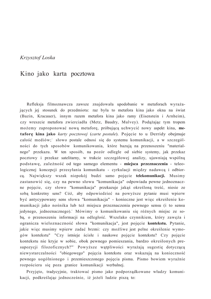 możemy zaproponować nową metaforę, próbującą uchwycić nowy aspekt kina, metaforę kina jako karty pocztowej (carte postale). Pojęcie to u Derridy obejmuje