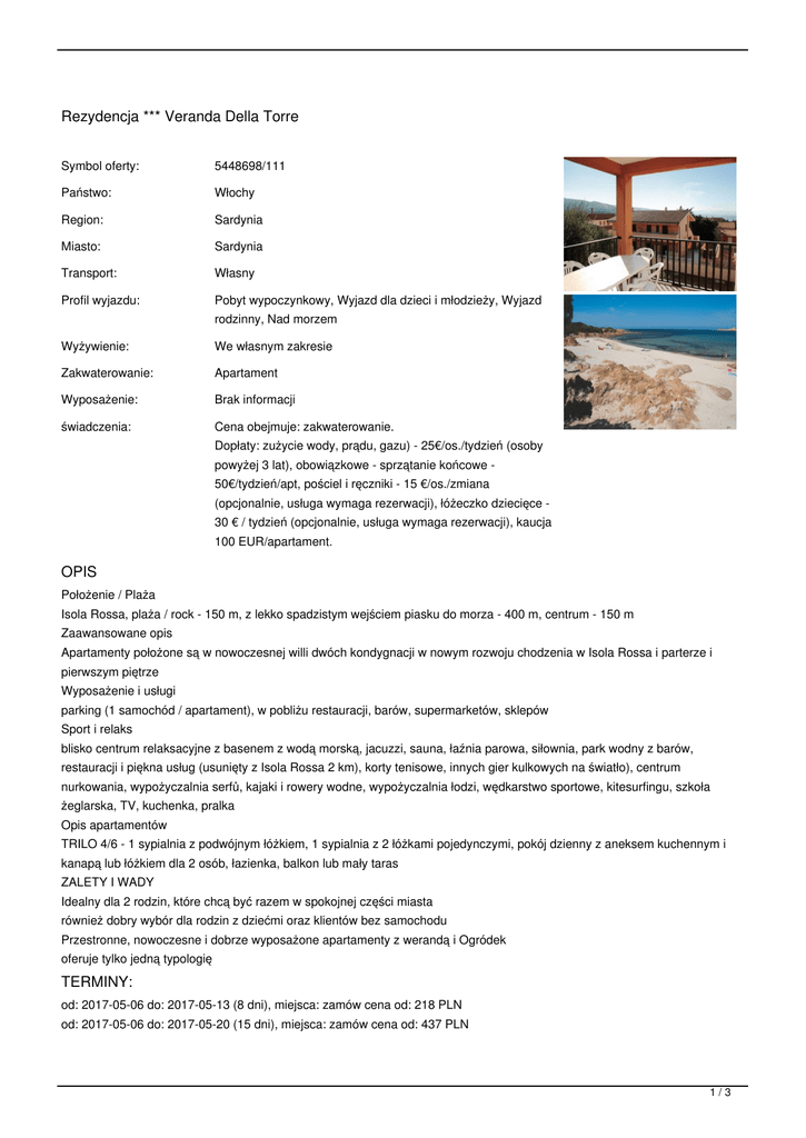 Rezydencja *** Veranda Della Torre Symbol oferty: 5448698/111 Państwo: Włochy Region: Sardynia Miasto: Sardynia Transport: Własny Profil wyjazdu: Pobyt wypoczynkowy, Wyjazd dla dzieci i młodzieży, Wyjazd Wyżywienie: We własnym zakresie Zakwaterowanie: Apartament Wyposażenie: Brak informacji świadczenia: Cena obejmuje: zakwaterowanie. rodzinny, Nad morzem Dopłaty: zużycie wody, prądu, gazu) - 25€/os./tydzień (osoby powyżej 3 lat), obowiązkowe - sprzątanie końcowe 50€/tydzień/apt, pościel i ręczniki - 15 €/os./zmiana (opcjonalnie, usługa wymaga rezerwacji), łóżeczko dziecięce - 30 € / tydzień (opcjonalnie, usługa wymaga rezerwacji), kaucja 100 EUR/apartament. OPIS Położenie / Plaża Isola Rossa, plaża / rock - 150 m, z lekko spadzistym wejściem piasku do morza - 400 m, centrum - 150 m Zaawansowane opis Apartamenty położone są w nowoczesnej willi dwóch kondygnacji w nowym rozwoju chodzenia w Isola Rossa i parterze i pierwszym piętrze Wyposażenie i usługi parking (1 samochód / apartament), w pobliżu restauracji, barów, supermarketów, sklepów Sport i relaks blisko centrum relaksacyjne z basenem z wodą morską, jacuzzi, sauna, łaźnia parowa, siłownia, park wodny z barów, restauracji i piękna usług (usunięty z Isola Rossa 2 km), korty tenisowe, innych gier kulkowych na światło), centrum nurkowania, wypożyczalnia serfů, kajaki i rowery wodne, wypożyczalnia łodzi, wędkarstwo sportowe, kitesurfingu, szkoła żeglarska, TV, kuchenka, pralka Opis apartamentów TRILO 4/6 - 1 sypialnia z podwójnym łóżkiem, 1 sypialnia z 2 łóżkami pojedynczymi, pokój dzienny z aneksem kuchennym i kanapą lub łóżkiem dla 2 osób, łazienka, balkon lub mały taras ZALETY I WADY Idealny dla 2 rodzin, które chcą być razem w spokojnej części miasta również dobry wybór dla rodzin z dziećmi oraz klientów bez samochodu Przestronne, nowoczesne i dobrze wyposażone apartamenty z werandą i Ogródek oferuje tylko jedną typologię TERMINY: od: 2017-05-06 do: 2017-05-13 (8 dni), miejsca: zamów cena od: 218 PLN od: 2017-05-06 do: 2017-05-20 (15 dni), miejsca: zamów cena od: 437 PLN 1/3 od: 2017-05-13 do: 2017-05-20 (8 dni), miejsca: zamów cena od: 218 PLN od: 2017-05-13 do: 2017-05-27 (15 dni), miejsca: zamów cena od: 560 PLN od: 2017-05-20 do: 2017-05-27 (8 dni), miejsca: zamów cena od: 342 PLN od: 2017-05-20 do: 2017-06-03 (15 dni), miejsca: zamów cena od: 684 PLN od: 2017-05-27 do: 2017-06-03 (8 dni), miejsca: zamów cena od: 342 PLN od: 2017-05-27 do: 2017-06-10 (15 dni), miejsca: zamów cena od: 782 PLN od: 2017-06-03 do: 2017-06-10 (8 dni), miejsca: zamów cena od: 440 PLN od: 2017-06-03 do: 2017-06-17 (15 dni), miejsca: zamów cena od: 880 PLN od: 2017-06-10 do: 2017-06-17 (8 dni), miejsca: zamów cena od: 440 PLN od: 2017-06-10 do: 2017-06-24 (15 dni), miejsca: zamów cena od: 988 PLN od: 2017-06-17 do: 2017-06-24 (8 dni), miejsca: zamów cena od: 548 PLN od: 2017-06-17 do: 2017-07-01 (15 dni), miejsca: zamów cena od: 1095 PLN od: 2017-06-24 do: 2017-07-01 (8 dni), miejsca: zamów cena od: 548 PLN od: 2017-06-24 do: 2017-07-08 (15 dni), miejsca: zamów cena od: 1133 PLN od: 2017-07-01 do: 2017-07-08 (8 dni), miejsca: zamów cena od: 586 PLN od: 2017-07-01 do: 2017-07-15 (15 dni), miejsca: zamów cena od: 1171 PLN od: 2017-07-08 do: 2017-07-15 (8 dni), miejsca: zamów cena od: 586 PLN od: 2017-07-08 do: 2017-07-22 (15 dni), miejsca: zamów cena od: 1171 PLN od: 2017-07-15 do: 2017-07-22 (8 dni), miejsca: zamów cena od: 586 PLN od: 2017-07-15 do: 2017-07-29 (15 dni), miejsca: zamów cena od: 1311 PLN od: 2017-07-22 do: 2017-07-29 (8 dni), miejsca: zamów cena od: 725 PLN od: 2017-07-22 do: 2017-08-05 (15 dni), miejsca: zamów cena od: 1653 PLN od: 2017-07-29 do: 2017-08-05 (8 dni), miejsca: zamów cena od: 928 PLN od: 2017-07-29 do: 2017-08-12 (15 dni), miejsca: zamów cena od: 1979 PLN od: 2017-08-05 do: 2017-08-12 (8 dni), miejsca: zamów cena od: 1051 PLN od: 2017-08-05 do: 2017-08-19 (15 dni), miejsca: zamów cena od: 1745 PLN od: 2017-08-12 do: 2017-08-19 (8 dni), miejsca: zamów cena od: 693 PLN od: 2017-08-12 do: 2017-08-26 (15 dni), miejsca: zamów cena od: 1190 PLN od: 2017-08-19 do: 2017-08-26 (8 dni), miejsca: zamów cena od: 497 PLN od: 2017-08-19 do: 2017-09-02 (15 dni), miejsca: zamów cena od: 864 PLN od: 2017-08-26 do: 2017-09-02 (8 dni), miejsca: zamów cena od: 367 PLN od: 2017-08-26 do: 2017-09-09 (15 dni), miejsca: zamów cena od: 715 PLN od: 2017-09-02 do: 2017-09-09 (8 dni), miejsca: zamów cena od: 348 PLN od: 2017-09-02 do: 2017-09-16 (15 dni), miejsca: zamów cena od: 598 PLN od: 2017-09-09 do: 2017-09-16 (8 dni), miejsca: zamów cena od: 250 PLN od: 2017-09-16 do: 2017-09-23 (8 dni), miejsca: zamów cena od: 250 PLN CENNIK: Długość pobytu: Grupa cenowa: 15 dni 8 dni 8 dni 15 dni 8 dni 15 dni 8 dni 15 dni15 dni 8 dni 15 dni 8 dni 15 dni 8 dni 8 dni 8 dni 15 dni15 dni 8 dni 8 dni F F Pobyt w obiekcie (do wyboru) A A J J K K E E B B H H M C C D D I (*) apartament 6-osobowy typu TRILO standardowo dla osób: 6 8280.24140.11100.12200.22772.15544.21993.13986.26608.23304.13682.21841.1 12194.2 6097.11290.12430.14860.26152.23076.13950.1 Ubezpieczenie (do wyboru) (*) ubezpieczenie NW KL 70 35 Ubezpieczenie (opcjonalne) 35 70 35 70 35 70 70 35 70 35 70 35 35 35 70 70 35 35 ubezpieczenie - od kosztów rezygnacji 2.4 % 2.4 % 2.4 % 2.4 % 2.4 % 2.4 % 2.4 % 2.4 % 2.4 % 2.4 % 2.4 % 2.4 % 2.4 % 2.4 % 2.4 % 2.4 % 2.4 % 2.4 % 2.4 % 2.4 % Waluta: PLN 2/3 Aktualne ceny z systemu S.A.R.T. (-) - cena usługi, podatku kalkulowana przy osobie lub gratis (*) - kwota wliczona w cenę standardową 3/3