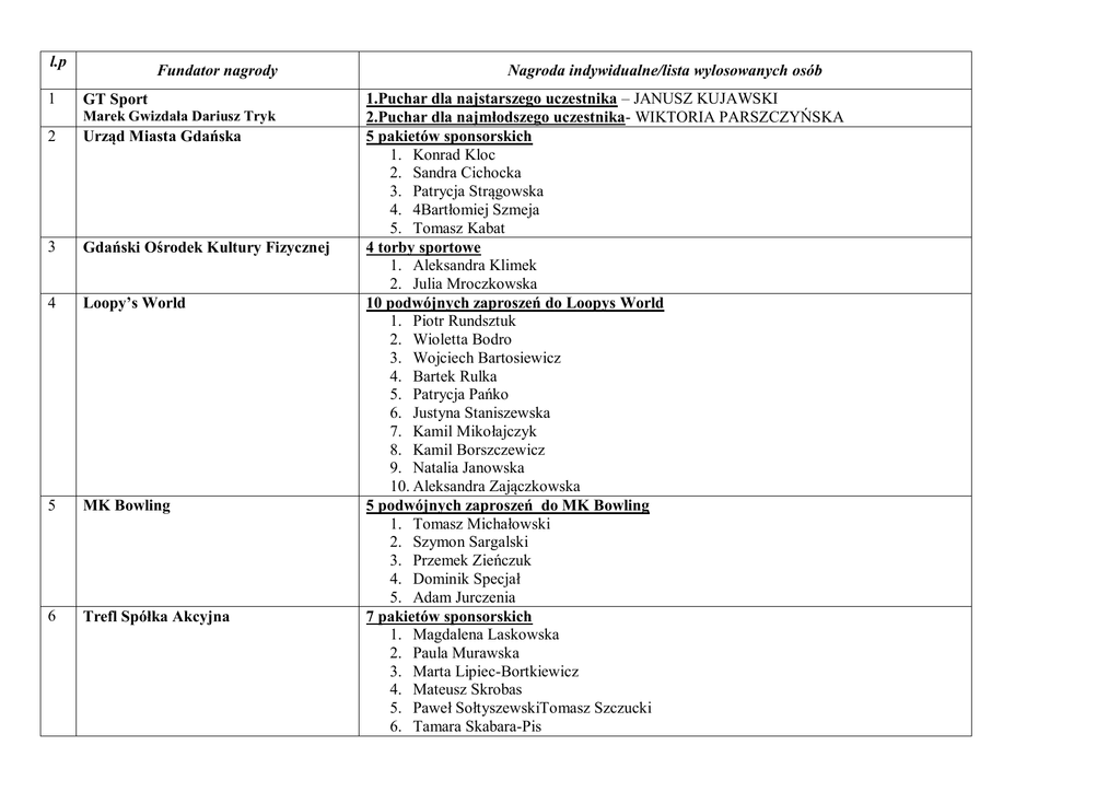 l.p 1 Fundator nagrody GT Sport Marek Gwizdała Dariusz Tryk 2 Urząd Miasta Gdańska 3 Gdański Ośrodek Kultury Fizycznej 4 Loopy’s World 5 MK Bowling 6 Trefl Spółka Akcyjna Nagroda indywidualne/lista wylosowanych osób 1.Puchar dla najstarszego uczestnika – JANUSZ KUJAWSKI 2.Puchar dla najmłodszego uczestnika- WIKTORIA PARSZCZYŃSKA 5 pakietów sponsorskich 1. Konrad Kloc 2. Sandra Cichocka 3. Patrycja Strągowska 4. 4Bartłomiej Szmeja 5. Tomasz Kabat 4 torby sportowe 1. Aleksandra Klimek 2. Julia Mroczkowska 10 podwójnych zaproszeń do Loopys World 1. Piotr Rundsztuk 2. Wioletta Bodro 3. Wojciech Bartosiewicz 4. Bartek Rulka 5. Patrycja Pańko 6. Justyna Staniszewska 7. Kamil Mikołajczyk 8. Kamil Borszczewicz 9. Natalia Janowska 10. Aleksandra Zajączkowska 5 podwójnych zaproszeń do MK Bowling 1. Tomasz Michałowski 2. Szymon Sargalski 3. Przemek Zieńczuk 4. Dominik Specjał 5. Adam Jurczenia 7 pakietów sponsorskich 1. Magdalena Laskowska 2. Paula Murawska 3. Marta Lipiec-Bortkiewicz 4. Mateusz Skrobas 5. Paweł SołtyszewskiTomasz Szczucki 6. Tamara Skabara-Pis 7 Ziaja LTD Zakład Produkcji Leków 8 Grupa Lotos S.A. 9 Elektrociepłownia Wybrzeże SA 10 PHU PORTAL Spółka z o.o. 11 Polskie Górnictwo Naftowe i Gazownictwo SA 12 Swissmed Centrum Zdrowia SA 10 pakietów sponsorskich 1. Łukasz Jasiński 2. Kewin Kamiński 3. Olaf Sojka 4. Natalia Kreft 5. Mateusz Talma 6. Klaudia Łapińska 7. Szymon Kuc 8. Marta Wyka 9. Marta Rychert 10. Patryk Neuman 10 pakietów sponsorskich 1. Ewa Czajka 2. Anna Formela 3. Kamila Oskwarek 4. Paweł Sidorczak 5. Grażyna Rolka 6. Alicja Kostrzewa 7. Julia Wójtowska 8. Klaudia Muczyńska 9. Michał Mroczka 10. Agnieszka Koszelak 4 pakiety sponsorskie 1. Anna Kropska 2. Krzysztof Domarecki 3. Nikola Miara 4. Weronika Mendyk 5 kompletów z akcesoriami komputerowymi 1. Waldemar Falkiewicz 2. Marta Begier 3. Michał Szews 4. Monika Socha 5. Joanna Federska 4 ramki cyfrowe 1. Klaudia Saldzień 2. Partyk Hoduń 3. Sebastian Kornecki 4. Karolina Milewska 2 aparaty fotograficzne 1. Karolina Szapar 13 MOSiR 14 Przedsiębiorstwo Robót Sanitarno - Porządkowych S.A. 15 Gdańskie Młyny 16 Centrum Handlowe Galeria Bałtycka 2. Anna Wojach 2 zaproszenia na badania i zabiegi lecznicze 1. Katarzyna Stankiewicz 2. Łukasz Papis 1 tablet 1. Artur Kosteczko 3 namioty 1. Jarosław Woźniak 2. Marcel Naklicki 3. Krzysztof Rygiert 3 rowery 1. Sandra Błaszczyk 2. Kryspin Wałucki 3. Kamil Zieliński 1 Kino domowe – Aleksandra Biskupska 1 laptop – Dariusz Mikołajczak