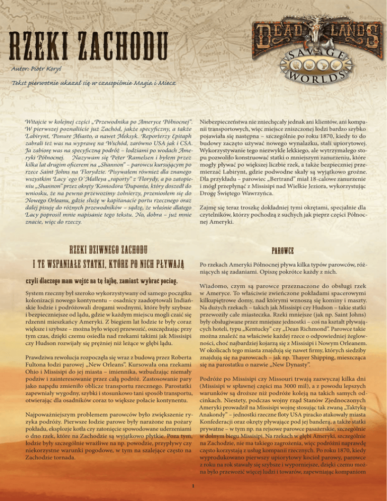 RZEKI ZACHODU Autor: Piotr Koryś Tekst pierwotnie ukazał się w czasopiśmie Magia i Miecz Witajcie w kolejnej części „Przewodnika po Ameryce Północnej”. W pierwszej poznaliście już Zachód, jakże specyficzny, a także Labirynt, Ponure Miasto, a nawet Meksyk. Reporterzy Epitaph zabrali też was na wyprawę na Wschód, zarówno USA jak i CSA. Ja zabiorę was na specyficzną podróż – łodziami po wodach Ameryki Północnej. Nazywam się Peter Ramelsen i byłem przez kilka lat drugim oficerem na „Shannon” – parowcu kursującym po rzece Saint Johns na Florydzie. Pisywałem również dla znanego wszystkim Lacy`ego O`Malleya „raporty” z Florydy, a po zatopieniu „Shannon” przez okręty Komodora Duponta, który doszedł do wniosku, że na pewno przewozimy żołnierzy, przeniosłem się do Nowego Orleanu, gdzie służę w kapitanacie portu rzecznego oraz dalej pisuję do różnych przewodników – sądzę, że właśnie dlatego Lacy poprosił mnie napisanie tego tekstu. No, dobra – już mnie znacie, więc do rzeczy. Niebezpieczeństwa nie zniechęcały jednak ani klientów, ani kompanii transportowych, więc miejsce zniszczonej łodzi bardzo szybko pojawiała się następna – szczególnie po roku 1870, kiedy to do budowy zaczęto używać nowego wynalazku, stali upiorytowej. Wykorzystywanie tego niezwykle lekkiego, ale wytrzymałego stopu pozwoliło konstruować statki o mniejszym zanurzeniu, które mogły pływać po większej liczbie rzek, a także bezpieczniej przemierzać Labirynt, gdzie podwodne skały są wyjątkowo groźne. Dla przykładu – parowiec „Bertrand” miał 18-calowe zanurzenie i mógł przepłynąć z Missisipi nad Wielkie Jeziora, wykorzystując Drogę Świętego Wawrzyńca. RZEKI DZIWNEGO ZACHODU I TE WSPANIAŁE STATKI, KTÓRE PO NICH PŁYWAJĄ PAROWCE Zajmę się teraz troszkę dokładniej tymi okrętami, specjalnie dla czytelników, którzy pochodzą z suchych jak pieprz części Północnej Ameryki. Po rzekach Ameryki Północnej pływa kilka typów parowców, różniących się zadaniami. Opiszę pokrótce każdy z nich. czyli dlaczego mam wejść na tę łajbę, zamiast wybrać pociag. System rzeczny był szeroko wykorzystywany od samego początku kolonizacji nowego kontynentu – osadnicy zaadoptowali Indiańskie łodzie i podróżowali drogami wodnymi, które były szybsze i bezpieczniejsze od lądu, gdzie w każdym miejscu mogli czaić się rdzenni mieszkańcy Ameryki. Z biegiem lat łodzie te były coraz większe i szybsze – można było więcej przewozić, oszczędzając przy tym czas, dzięki czemu osiedla nad rzekami takimi jak Missisipi czy Hudson rozwijały się prężniej niż leżące w głębi lądu. Prawdziwa rewolucja rozpoczęła się wraz z budową przez Roberta Fultona łodzi parowej „New Orleans”. Kursowała ona rzekami Ohio i Missisipi do jej miasta – imiennika, wzbudzając niemały podziw i zainteresowanie przez całą podróż. Zastosowanie pary jako napędu zmieniło oblicze transportu rzecznego. Parostatki zapewniały wygodny, szybki i stosunkowo tani sposób transportu, otwierając dla osadników coraz to większe połacie kontynentu. Wiadomo, czym są parowce przeznaczone do obsługi rzek w Ameryce. To właściwie zwieńczone pokładami spacerowymi kilkupiętrowe domy, nad którymi wznoszą się kominy i maszty. Na dużych rzekach – takich jak Missisipi czy Hudson – takie statki przewoziły całe miasteczka. Rzeki mniejsze (jak np. Saint Johns) były obsługiwane przez mniejsze jednostki – coś na kształt pływających hoteli, typu „Kentucky” czy „Dean Richmond”. Parowce takie można znaleźć na właściwie każdej rzece o odpowiedniej żeglowności, choć najbardziej kojarzą się z Missisipi i Nowym Orleanem. W okolicach tego miasta znajdują się nawet firmy, których siedziby znajdują się na parowcach – jak np. Thayer Shipping, mieszcząca się na parostatku o nazwie „New Dynasty”. Podróże po Missisipi czy Missouri trwają zazwyczaj kilka dni (Missisipi w spławnej części ma 3000 mil), a z powodu lepszych warunków są droższe niż podróże koleją na takich samych odcinkach. Niestety, podczas wojny rząd Stanów Zjednoczonych Ameryki prowadził na Missisipi wojnę stosując tak zwaną „Taktyką Najpoważniejszym problemem parowców było zwiększenie ry- Anakondy” – jednostki rzeczne floty USA piracko atakowały miasta zyka podróży. Pierwsze łodzie parowe były narażone na pożary Konfederacji oraz okręty pływające pod jej banderą, a także statki pokładu, eksplozje kotła czy zatonięcie spowodowane uderzeniami prywatne – w tym np. na rejsowe parowce pasażerskie, szczególnie o dno rzek, które na Zachodzie są wyjątkowo płytkie. Poza tym, w dolnym biegu Missisipi. Na rzekach w głębi Ameryki, szczególnie łodzie były szczególnie wrażliwe na np. powodzie, przypływy czy na Zachodzie, nie ma takiego zagrożenia, więc podróżni naprawdę niekorzystne warunki pogodowe, w tym na szalejące często na często korzystają z usług kompanii rzecznych. Po roku 1870, kiedy Zachodzie tornada. wyprodukowano pierwszy upiorytowy kocioł parowy, parowce z roku na rok stawały się szybsze i wyporniejsze, dzięki czemu można było przewozić więcej ludzi i towarów, zapewniając kompaniom 1 Mniejsze parowce przewożą od 50 pasażerów na krótkich trasach. Bardziej luksusowe i większe jednostki przemierzające Missisipi mieszczą około 400 ludzi i prawie czterdziestoosobową załogę wraz z obsługą. Podróżni mają do dyspozycji kabiny w czterech kategoriach – od luksusowych apartamentów do koi w salach wspólnych (do 10 ludzi w kabinie). Na pokładach znajdują się kasyna (w związku z prawem, zakazującym hazardu na amerykańskiej ziemi), restauracje, tarasy widokowe oraz sale balowe. Cena biletu wahała się od 5 do 500 $ Oto opis przykładowego „pływającego hotelu”, kursującego po Missisipi, Rio Grande czy innych większych rzeka