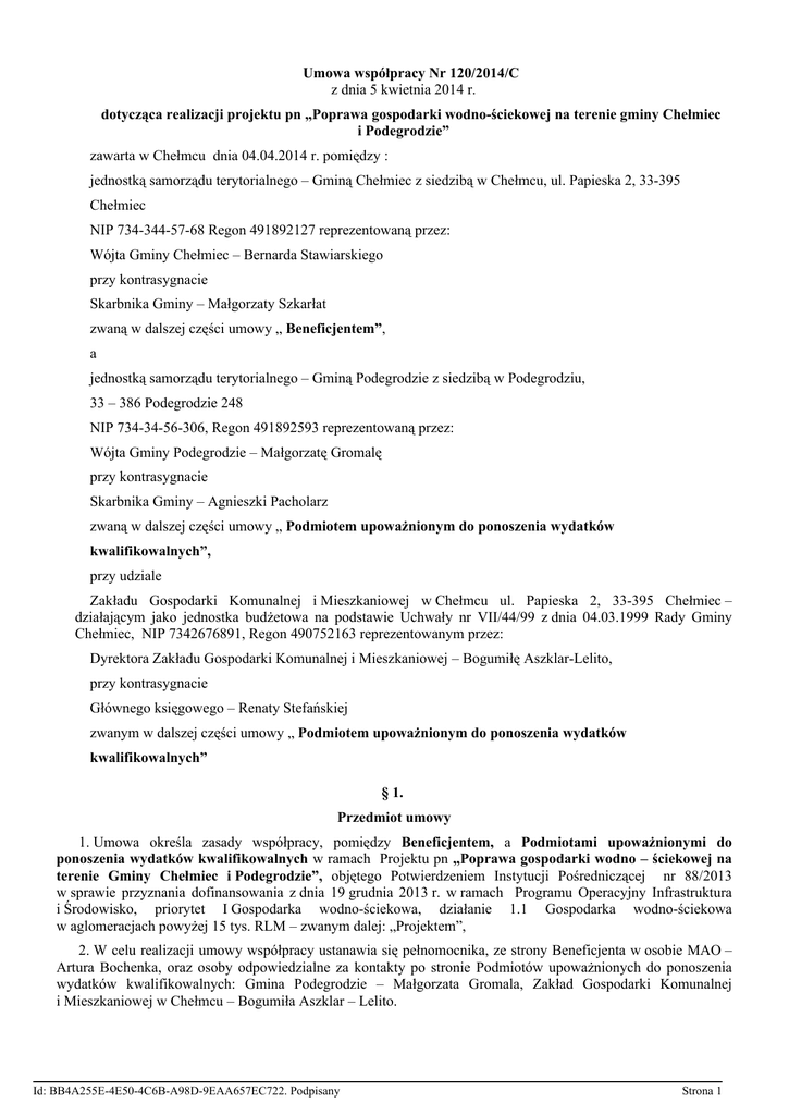 Umowa współpracy Nr 120/2014/C z dnia 5 kwietnia 2014 r. dotycząca realizacji projektu pn „Poprawa gospodarki wodno-ściekowej na terenie gminy Chełmiec i Podegrodzie” zawarta w Chełmcu dnia 04.04.2014 r. pomiędzy : jednostką samorządu terytorialnego – Gminą Chełmiec z siedzibą w Chełmcu, ul. Papieska 2, 33-395 Chełmiec NIP 734-344-57-68 Regon 491892127 reprezentowaną przez: Wójta Gminy Chełmiec – Bernarda Stawiarskiego przy kontrasygnacie Skarbnika Gminy – Małgorzaty Szkarłat zwaną w dalszej części umowy „ Beneficjentem”, a jednostką samorządu terytorialnego – Gminą Podegrodzie z siedzibą w Podegrodziu, 33 – 386 Podegrodzie 248 NIP 734-34-56-306, Regon 491892593 reprezentowaną przez: Wójta Gminy Podegrodzie – Małgorzatę Gromalę przy kontrasygnacie Skarbnika Gminy – Agnieszki Pacholarz zwaną w dalszej części umowy „ Podmiotem upoważnionym do ponoszenia wydatków kwalifikowalnych”, przy udziale Zakładu Gospodarki Komunalnej i Mieszkaniowej w Chełmcu ul. Papieska 2, 33-395 Chełmiec – działającym jako jednostka budżetowa na podstawie Uchwały nr VII/44/99 z dnia 04.03.1999 Rady Gminy Chełmiec, NIP 7342676891, Regon 490752163 reprezentowanym przez: Dyrektora Zakładu Gospodarki Komunalnej i Mieszkaniowej – Bogumiłę Aszklar-Lelito, przy kontrasygnacie Głównego księgowego – Renaty Stefańskiej zwanym w dalszej części umowy „ Podmiotem upoważnionym do ponoszenia wydatków kwalifikowalnych” § 1. Przedmiot umowy 1. Umowa określa zasady współpracy, pomiędzy Beneficjentem, a Podmiotami upoważnionymi do ponoszenia wydatków kwalifikowalnych w ramach Projektu pn „Poprawa gospodarki wodno – ściekowej na terenie Gminy Chełmiec i Podegrodzie”, objętego Potwierdzeniem Instytucji Pośredniczącej nr 88/2013 w sprawie przyznania dofinansowania z dnia 19 grudnia 2013 r. w ramach Programu Operacyjny Infrastruktura i Środowisko, priorytet I Gospodarka wodno-ściekowa, działanie 1.1 Gospodarka wodno-ściekowa w aglomeracjach powyżej 15 tys. RLM – zwanym dalej: „Projektem”, 2. W celu realizacji umowy współpracy ustanawia się pełnomocnika, ze strony Beneficjenta w osobie MAO – Artura Bochenka, oraz osoby odpowiedzialne za kontakty po stronie Podmiotów upoważnionych do ponoszenia wydatków kwalifikowalnych: Gmina Podegrodzie – Małgorzata Gromala, Zakład Gospodarki Komunalnej i Mieszkaniowej w Chełmcu – Bogumiła Aszklar – Lelito. Id: BB4A255E-4E50-4C6B-A98D-9EAA657EC722. Podpisany Strona 1 § 2. Zakres umowy współpracy 1. Umowa współpracy określa zasady realizacji Projektu pn „Poprawa gospodarki wodno – ściekowej na terenie Gminy Chełmiec i Podegrodzie” objętego Potwierdzeniem Instytucji Pośredniczącej nr 88/2013 w sprawie przyznania dofinansowania z dnia 19.12.2013r. oraz określa prawa i obowiązki stron umowy związane z realizacją Projektu. 2. Wszystkie postanowienia zawarte w umowie o dofinansowanie pomiędzy Beneficjentem, a Instytucją Wdrażającą, której wzór stanowi załącznik nr 1 do niniejszej umowy, zwanej dalej „umową o dofinansowanie”, są wiążące dla Podmiotów upoważnionych do ponoszenia wydatków kwalifikowalnych w czasie realizacji Projektu, a w szczególności postanowienia zawarte w: 1) §4 Zasady realizacji projektu 2) §4a Wymogi związane z ochroną środowiska, 3) §5 Wartość Projektu i źródła finansowania, 4) §6 Wysokość dofinansowania, 5) §7 Kwalifikowalność wydatków, 6) §9 Monitorowanie i sprawozdawczość, 7) §10 Ewaluacja, 8) §12 Procedura zawierania umów w ramach wydatków kwalifikowanych dla zadań objętych Projektem, 9) §13 Kontrola procedury zawierania umów dla zadań objętych Projektem, 10) §14 Ewidencja księgowa i archiwizacja danych, 11) §15 Kontrola, 12) §16 Trwałość Projektu, 13) §18 Informacja i promocja tej umowy. § 3. Okres obowiązywania umowy współpracy 1. Umowa współpracy jest zawarta na czas wypełniania wszystkich zobowiązań wynikających z umowy o dofinansowanie (min. 5 lat od zakończenia realizacji Projektu). 2. Okres obowiązywania umowy współpracy obejmuje: okres realizacji Projektu określony w umowie o dofinansowanie (min. 5 lat od zakończenia realizacji Projektu) oraz okres przechowywania dokumentacji z uwzględnieniem terminu 3 lat od zamknięcia Programu Operacyjnego Infrastruktura i Środowisko. 3. W okresie realizacji projektu oraz trwałości projektu Podmioty upoważnione do ponoszenia wydatków kwalifikowanych zobowiązane są do zachowania trwałości Projektu określonego we wniosku o dofinansowanie i w umowie o dofinansowanie. § 4. Zakres obowiązków Beneficjenta i Podmiotów upoważnionych do ponoszenia wydatków kwalifikowalnych 1. Beneficjent pełni funkcje podmiotu właściwego do kontaktu z właściwymi instytucjami w systemie realizacji PO IiŚ i uprawniony jest do sprawowania nadzoru nad Projektem w części realizowanej przez Podmioty upoważnione do ponoszenia wydatków kwalifikowalnych. 2. Gmina Chełmiec oraz Gmina Podegrodzie ponoszą odpowiedzialność wobec osób trzecich za szkody powstałe w związku z realizacją projektu, na terenie swoich gmin. Id: BB4A255E-4E50-4C6B-A98D-9EAA657EC722. Podpisany Strona 2 3. W przypadku wystąpienia po stronie jednej z Gmin określonych w ustępie 2 szkody wynikłej z działania (zaniechania) drugiej Gminy - wynikającej w szczególności z odpowiedzialności wobec Instytucji Wdrażającej Gmina, która poniosła szkodę, ma prawo żądać od Gminy odpowiedzialnej za powstałą szkodę odszkodowania pokrywającego wysokość poniesionej szkody. 4. Na terenie każdej z Gmin określonych w ustępie 2 odpowiednia część przedsięwzięcia realizowana będzie zgodnie z zakresem realizacji opisanym we wniosku o dofinansowanie Projektu. 5. Każda z Gmin określonych w ustępie 2 będzie odpowiadać z własnych środków tylko za finansowanie realizacji zadania na terenie danej Gminy, w szczególności nie będz