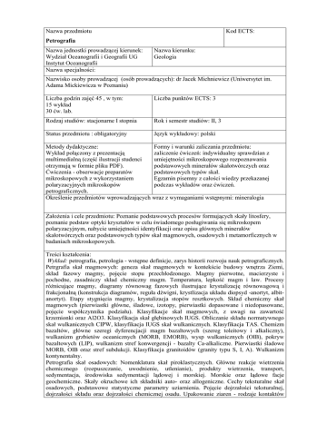 Nazwa przedmiotu Kod ECTS: Petrografia Nazwa jednostki prowadzącej kierunek: Wydział Oceanografii i Geografii UG Instytut Oceanografii Nazwa specjalności: Nazwa kierunku: Geologia Nazwisko osoby prowadzącej (osób prowadzących): dr Jacek Michniewicz (Uniwersytet im. Adama Mickiewicza w Poznaniu) Liczba godzin zajęć 45 , w tym: 15 wykład 30 ćw. lab. Liczba punktów ECTS: 3 Rodzaj studiów: stacjonarne I stopnia Rok i semestr studiów: II, 3 Status przedmiotu : obligatoryjny Język wykładowy: polski Metody dydaktyczne: Formy i warunki zaliczania przedmiotu: Wykład połączony z prezentacją zaliczenie ćwiczeń: indywidualny sprawdzian z multimedialną (część ilustracji studenci umiejętności mikroskopowego rozpoznawania otrzymują w formie pliku PDF). podstawowych minerałów skałotwórczych oraz Ćwiczenia - obserwacje preparatów podstawowych typów skał. mikroskopowych z wykorzystaniem Egzamin pisemny z całości wiedzy przekazanej polaryzacyjnych mikroskopów podczas wykładów oraz ćwiczeń. petrograficznych. Określenie przedmiotów wprowadzających wraz z wymaganiami wstępnymi: mineralogia ZałoŜenia i cele przedmiotu: Poznanie podstawowych procesów formujących skały litosfery, poznanie podstaw optyki kryształów w celu świadomego posługiwania się mikroskopem polaryzacyjnym, nabycie umiejętności identyfikacji oraz opisu głównych minerałów skałotwórczych oraz podstawowych typów skał magmowych, osadowych i metamorficznych w badaniach mikroskopowych. Treści kształcenia: Wykład: petrografia, petrologia - wstępne definicje, zarys historii rozwoju nauk petrograficznych. Petrgrafia skał magmowych: geneza skał magmowych w kontekście budowy wnętrza Ziemi, skład fazowy magmy, pojęcie stopu przechłodzonego. Magmy pierwotne, macierzyste i pochodne, zasadniczy skład chemiczny magm. Temperatura, lepkość magm i law. Procesy róŜnicujące magmy, diagramy równowag fazowych ilustrujące krystalizację równowagową i frakcjonalną (konstrukcja diagramów, reguła dźwigni, krystlizacja układu diopsyd -anortyt, albitanortyt). Etapy stygnięcia magmy, krystalizacja stopów resztkowych. Skład chemiczny skał magmowych (pierwiastki główne, śladowe, izotopy, pierwiastki dopasowane i niedopasowane, pojęcie współczynnika podziału). Klasyfikacje skał magmowych, z uwagi na zawartość krzemionki oraz Al2O3. Klasyfikacja skał głębinowych IUGS. Obliczanie składu normatywnego skał wulkanicznych CIPW, klasyfikacja IUGS skał wulkanicznych. Klasyfikacja TAS. Chemizm bazaltów, główne szeregi dyferencjacji magm bazaltowych (szereg toleitowy i alkaliczny), wulkanizm grzbietów oceanicznych (MORB, EMORB), wysp wulkanicznych (OIB), pokryw bazaltowych (LIP), wulkanizm stref konwergencji - bazalty Ca-alkaliczne. Pierwiastki śladowe MORB, OIB oraz stref subdukcji. Klasyfikacja granitoidów (granity typu S, I, A). Wulkanizm kontynentalny. Petrografia skał osadowych: Nomenklatura skał piroklastycznych. Główne reakcje wietrzenia chemicznego (rozpuszczanie, uwodnienie, utlenianie), produkty wietrzenia, transport, sedymentacja, środowiska sedymentacji lądowej i morskiej. Morskie oraz lądowe facje geochemiczne. Skały okruchowe ich składniki auto- oraz allogeniczne. Cechy teksturalne skał osadowych, podstawowe statystyczne parametry uziarnienia. Pojęcie dojrzałości teksturalnej, dojrzałości składu oraz dojrzałości chemicznej osadu. Upakowanie ziaren - rodzaje kontaktów międzyziarnowych. Spoiwo skał osadowych, jego rodzaje, geneza i forma wykształcenia. Pojęcie porowatości absolutnej i efektywnej oraz pierwotnej i wtórnej. Systematyka skał grubo-, średnioi dronookruchowych. Geneza osadów kwarcowych, arkozowych i szarogłazowych. Charakterystyka petrograficzna lessów. Minerały autogeniczne skał osadowych, grupa krzemionki, skalenie, minerały ilaste. Klasyfikacja skał ilastych. Skały węglanowe, "orto-" i "allochemy". Cementacja osadu węglanowego, typy cementu w skałach węglanowych. Systematyka wapieni wg Folka (1959, 1962) oraz Dunhama (1962). Procesy dolomityzacji. Ewaporaty. Skały krzemionkowe, środowiska ich sedymentacji, klasyfikacja. Petrografia skał metamorficznych: rodzaje metamorfizmu (metamorfizm lokalny, regionalny oraz morskiego dna), czynniki metamorfizmu, termodynamiczny sens przemian metamorficznych zachowanie się faz mineralnych w warunkach metamorfizmu progresywnego i regresywnego, struktury i tekstury skał metamorficznych, mineralne termometry i barometry metamorfizmu, facje metamorficzne. Ultrametamorfizm, anateksis, migmatyty. Ćwiczenia: Podstawy optyki kryształów: współczynnik załamania światła, polaryzacja światła, podwójne załamanie, modele dwu i jednopowłokowe cech optycznych kryształów, interferencja światła w kryształach, budowa mikroskopu polaryzacyjnego, badania ortoskopowe (metoda Beckego, reliefu, wygaszanie światła, pleochroizm, barwy interferencyjne, dwójłomność), główne minerały skałotwórcze skał magmowych. Struktury i tekstury skał magmowych. Obserwacje i rozpoznawanie podstawowych typów skał magmowych. Minerały skałotwórcze skał osadowych, obserwacje i rozpoznawanie skał okruchowych, węglanowych, krzemionkowych oraz ewaporatów. Minerały skałotwórcze, struktury i tekstury, identyfikacja skał metamorficznych. Umiejętności i kompetencje: Po ukończeniu kursu słuchacz powinien znać podstawy wiedzy dotyczącej genezy poszczególnych typów skał oraz nabyć umiejętność ich rozpoznawania, klasyfikacji oraz opisu. Wykaz literatury (wykład) : - podstawowej: Manecki A., Muszyński M (red.) 2008: Przewodnik do petrografii. Uczelniane Wydawnictwa Naukowo-Dydaktyczne AGH. Kraków. Ryka W. Maliszewska A., 1991: Słownik petrograficzny. Wydawnictwa Geologiczne. Warszawa Kozłowski i in. 1986: Petrologia skał metamorficznych. Uniwersytet Śląski, Katowice Majerowicz A. Wierzchołowski B. 1990. Petrologia skał magmowych. Wyd. Geologiczne, Warszaw
