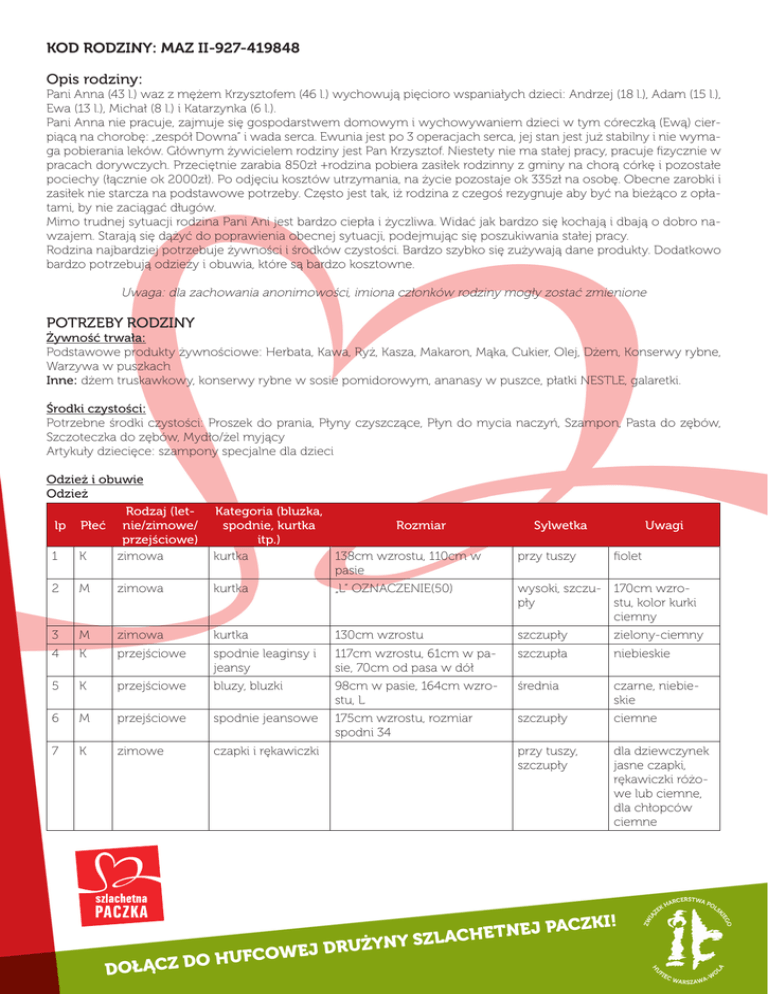 KOD RODZINY: MAZ II-927-419848 Opis rodziny: Pani Anna (43 l.) waz z mężem Krzysztofem (46 l.) wychowują pięcioro wspaniałych dzieci: Andrzej (18 l.), Adam (15 l.), Ewa (13 l.), Michał (8 l.) i Katarzynka (6 l.). Pani Anna nie pracuje, zajmuje się gospodarstwem domowym i wychowywaniem dzieci w tym córeczką (Ewą) cierpiącą na chorobę: „zespół Downa” i wada serca. Ewunia jest po 3 operacjach serca, jej stan jest już stabilny i nie wymaga pobierania leków. Głównym żywicielem rodziny jest Pan Krzysztof. Niestety nie ma stałej pracy, pracuje fizycznie w pracach dorywczych. Przeciętnie zarabia 850zł +rodzina pobiera zasiłek rodzinny z gminy na chorą córkę i pozostałe pociechy (łącznie ok 2000zł). Po odjęciu kosztów utrzymania, na życie pozostaje ok 335zł na osobę. Obecne zarobki i zasiłek nie starcza na podstawowe potrzeby. Często jest tak, iż rodzina z czegoś rezygnuje aby być na bieżąco z opłatami, by nie zaciągać długów. Mimo trudnej sytuacji rodzina Pani Ani jest bardzo ciepła i życzliwa. Widać jak bardzo się kochają i dbają o dobro nawzajem. Starają się dążyć do poprawienia obecnej sytuacji, podejmując się poszukiwania stałej pracy. Rodzina najbardziej potrzebuje żywności i środków czystości. Bardzo szybko się zużywają dane produkty. Dodatkowo bardzo potrzebują odzieży i obuwia, które są bardzo kosztowne. Uwaga: dla zachowania anonimowości, imiona członków rodziny mogły zostać zmienione POTRZEBY RODZINY Żywność trwała: Podstawowe produkty żywnościowe: Herbata, Kawa, Ryż, Kasza, Makaron, Mąka, Cukier, Olej, Dżem, Konserwy rybne, Warzywa w puszkach Inne: dżem truskawkowy, konserwy rybne w sosie pomidorowym, ananasy w puszce, płatki NESTLE, galaretki. Środki czystości: Potrzebne środki czystości: Proszek do prania, Płyny czyszczące, Płyn do mycia naczyń, Szampon, Pasta do zębów, Szczoteczka do zębów, Mydło/żel myjący Artykuły dziecięce: szampony specjalne dla dzieci Odzież i obuwie Odzież Rodzaj (letlp Płeć nie/zimowe/ przejściowe) 1 K zimowa Kategoria (bluzka, spodnie, kurtka Rozmiar itp.) kurtka 138cm wzrostu, 110cm w pasie Sylwetka przy tuszy Uwagi fiolet 2 M zimowa kurtka „L” OZNACZENIE(50) wysoki, szczu- 170cm wzropły stu, kolor kurki ciemny 3 M zimowa kurtka 130cm wzrostu szczupły zielony-ciemny 4 K przejściowe spodnie leaginsy i jeansy 117cm wzrostu, 61cm w pasie, 70cm od pasa w dół szczupła niebieskie 5 K przejściowe bluzy, bluzki 98cm w pasie, 164cm wzrostu, L średnia czarne, niebieskie 6 M przejściowe spodnie jeansowe 175cm wzrostu, rozmiar spodni 34 szczupły ciemne 7 K zimowe czapki i rękawiczki przy tuszy, szczupły dla dziewczynek jasne czapki, rękawiczki różowe lub ciemne, dla chłopców ciemne OWEJ DR C F U H O D DOŁĄCZ ! EJ PACZKI ACHETN UŻYNY SZL Obuwie 1 M Rodzaj (letnie / zimowe / przejściowe) przejściowe 44 kolor czarny 2 K zimowe kozaczki 29 (19cm stopa) krótkie, beżowy kolor i na suwak 3 K zimowe kozaczki 35 (22cm stopa) krótkie, czarne 4 M zimowe kamaszy, trapery 42 czarne, krótkie 5 M zimowe trapery 42 ciemne 6 M zimowe trapery 21cm stopa ciemne Lp Płeć Kategoria (klapki, tenisówki, kozaki itp.) adidasy i trampki Rozmiar Uwagi Pomoce szkolne: Zeszyty, Bloki, Kredki, Farbki, Papier kolorowy, Klej, Piórnik, Przybory do pisania Inne: 2 piórniki - jeden dla dziewczynki, 2 dla chłopca Wyposażenie mieszkania: Koc, Pościel, Ręczniki Inne: koc 3x, pościel 7x, ręczniki duże Brakujące sprzęty gospodarstwa domowego: 1x fotel do biurka, krzesła do stołu jadalnego z oparciem 4x, INNE POTRZEBY: komoda z szufladami - ciemne drewno SZCZEGÓLNE UPOMINKI: Ewa - długopisy kolorowe, kredki do malowania. Anna- kosmetyki do ciała, perfumy kwiatowe. Michał- samochód z przyczepą na baterię. Katarzyna- lalka księżniczka i konik (lub kucyk). Andrzej- kosmetyki, perfumy „pumy”. Adam- gry komputerowe i telewizyjne. Krzysztof- kosmetyki. NAJWAŻNIEJSZE POTRZEBY: Żywność bardzo dużo pieniędzy rodzina wydaje na żywność Środki czystości przy czystym utrzymaniu domu szybko się zużywają Odzież i obuwie najdroższe rzeczy, na które nas nie stać.