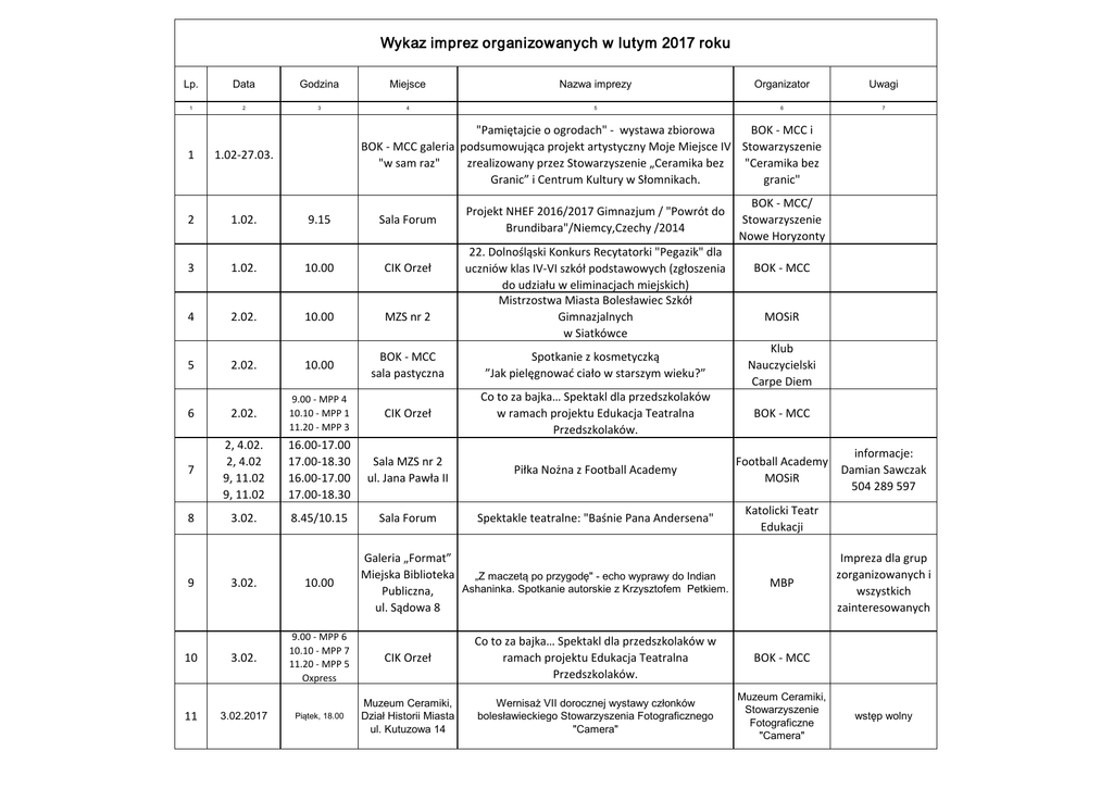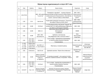 Wykaz imprez organizowanych w lutym 2017 roku Lp. Data Godzina Miejsce Nazwa imprezy Organizator Uwagi 1 2 3 4 5 6 7 "Pamiętajcie o ogrodach" - wystawa zbiorowa BOK - MCC i BOK - MCC galeria podsumowująca projekt artystyczny Moje Miejsce IV Stowarzyszenie zrealizowany przez Stowarzyszenie „Ceramika bez "w sam raz" "Ceramika bez Granic” i Centrum Kultury w Słomnikach. granic" 1 1.02-27.03. 2 1.02. 9.15 Sala Forum 3 1.02. 10.00 CIK Orzeł 4 2.02. 10.00 MZS nr 2 5 2.02. 10.00 BOK - MCC sala pastyczna Spotkanie z kosmetyczką ”Jak pielęgnować ciało w starszym wieku?” 6 2.02. 9.00 - MPP 4 10.10 - MPP 1 11.20 - MPP 3 CIK Orzeł 7 2, 4.02. 2, 4.02 9, 11.02 9, 11.02 16.00-17.00 17.00-18.30 16.00-17.00 17.00-18.30 Co to za bajka… Spektakl dla przedszkolaków w ramach projektu Edukacja Teatralna Przedszkolaków. Sala MZS nr 2 ul. Jana Pawła II Piłka Nożna z Football Academy Football Academy MOSiR 8 3.02. 8.45/10.15 Sala Forum Spektakle teatralne: "Baśnie Pana Andersena" Katolicki Teatr Edukacji 9 10 11 3.02. 10.00 3.02. 9.00 - MPP 6 10.10 - MPP 7 11.20 - MPP 5 Oxpress 3.02.2017 Piątek, 18.00 Projekt NHEF 2016/2017 Gimnazjum / "Powrót do Brundibara"/Niemcy,Czechy /2014 22. Dolnośląski Konkurs Recytatorki "Pegazik" dla uczniów klas IV-VI szkół podstawowych (zgłoszenia do udziału w eliminacjach miejskich) Mistrzostwa Miasta Bolesławiec Szkół Gimnazjalnych w Siatkówce Galeria „Format” Miejska Biblioteka „Z maczetą po przygodę" - echo wyprawy do Indian Ashaninka. Spotkanie autorskie z Krzysztofem Petkiem. Publiczna, ul. Sądowa 8 BOK - MCC/ Stowarzyszenie Nowe Horyzonty BOK - MCC MOSiR Klub Nauczycielski Carpe Diem BOK - MCC MBP CIK Orzeł Co to za bajka… Spektakl dla przedszkolaków w ramach projektu Edukacja Teatralna Przedszkolaków. BOK - MCC Muzeum Ceramiki, Dział Historii Miasta ul. Kutuzowa 14 Wernisaż VII dorocznej wystawy członków bolesławieckiego Stowarzyszenia Fotograficznego "Camera" Muzeum Ceramiki, Stowarzyszenie Fotograficzne "Camera" informacje: Damian Sawczak 504 289 597 Impreza dla grup zorganizowanych i wszystkich zainteresowanych wstęp wolny Sala MZS nr 2 ul. Jana Pawła II Sala sportowa GS nr 2, ul. Bielska Automatyka BKS Bolesławiec - Alba Wrocław II Liga Dolnośląska Futsalu BKS Bobrzanie Bolesławiec Mecz tenisa stołowego o Mistrzostwo III Ligi tenisa stołówego TOP Bolesławiec 14.00-23.00 i 11.00-17.00 BOK - MCC sala taneczna „Tango Bolesławiec” - warsztaty tańca argentyńskiego Stowarzyszenie "Tango Bolesławiec" Wtorek-sobota 10.00-16.00 niedziela 11.00-16.00 Muzeum Ceramiki, Dział Historii Miasta ul. Kutuzowa 14 12 04.02 15.00 13 4.02 16.00 14 4-5.02. 15 4.02.-28.02. Rynek 16 17 18 19 5.02. 6.02. 6.02. 14.02. 10.00-17.00 Plac Marszałka Józefa Piłsudskiego 9.30 Sala Forum 11.30 Filia Nr 1, Miejska Biblioteka Publiczna, ul. Staroszkolna 6 VII doroczna wystawa członków bolesławieckiego Stowarzyszenia Fotograficznego "Camera" PIKNIK WOJSKOWY „BEZPIECZNA POLSKA” W BOLESŁAWCU Plac Marszałka Józefa Piłsudskiego 11.00 – 11.50 - uroczysty apel - powitanie żołnierzy amerykańskich w Bolesławcu Bolesławiecki Rynek 10.00 – 17.00 - pokazy sprzętu wojskowego - koncerty i występy wokalne: orkiestra, ZPIT Mały Bolesławiec, zespół Obstawa Prezydenta, Break Dance, M. Kuc, - konkurencje sportowe - wojskowa grochówka termin i godzina mogą ulec zmianie Bilet normalny 4 zł, Muzeum Ceramiki, bilet ulgowy 2 zł, dla Stowarzyszenie dzieci i młodzieży Fotograficzne wstęp 1 zł, w "Camera" czwartek wstęp bezpłatny Dowódca 23 Śląskiego Pułk Artylerii Prezydent Miasta Bolesławiec BOK - MCC/ Projekt NHEF 2016/2017 SP 1-3/ "Ptyś i Bill"/ Belgia/ Stowarzyszenie 2013 Nowe Horyzonty „Maciej Zembaty nie tylko tłumacz Cohena". Spotkanie Dyskusyjnego Klubu Miłośników Poezji MBP „Płaskorzeźby w roli głównej" - zapraszamy na Czytelnia warsztaty sztukaterii gipsowej. Samodzielnie Oddziału dla wykonamy ciekawy prezent na przykład dla mamy Dzieci, Mediateka lub niebanalną ozdobę swojego pokoju. Zajęcia 12.00 - 14.00 Miejska Biblioteka feryjne pod wspólnym tytułem "Hokus-pokus", ze Publiczna, zwykłych materiałów niezwykłe przedmioty - czyli ul. Sądowa 8 kreatywne zajęcia rozwijające talenty artystyczne i nie tylko ... MBP Spotkanie otwarte – zapraszamy wszystkich zainteresowanych 20 Dyskusyjny Klub Filmowy dkfbok "Lion. Droga do domu" /dramat/ Australia, USA,Wielka Brytania/2016 Co to za bajka… Spektakl dla przedszkolaków w ramach projektu Edukacja Teatralna Przedszkolaków. 6.02. 19.00 Sala Forum 21 7.02. 9.00 Jacek i Agatka Nibylandia 10.30 - MPP 2 CIK Orzeł 22 7.02. 9.30 Sala Forum Projekt NHEF 2016/2017 Przedszkola / "Zestaw filmów krótkich : Kim jestem ?" BOK-MCC/ Stowarzyszenie Nowe Horyzonty 23 8.02 9.00-13.00 Muzeum Ceramiki, Dział Historii Miasta ul. Kutuzowa 14 Warsztaty karnawałowe dla przedszkolaków Muzeum Ceramiki 24 9.02. 10.00 CIK Orzeł 25 9.02. 8.40/10.00/ 11.20 Sala Forum 26 9.02. 9.30 / 11.30 CIK Orzeł 27 10.02. 10.00 11.00 12.00 CIK Orzeł 28 10.02. 12.00 Sala Forum Projekt NHEF 2016/2017 Szkoła Ponadgimnazjalna/"Amator"/ Polska /2013 29 10.02. 18.00 CIK Orzeł Pechowiec - spektakl w wykonaniu uczestników Pracowni Teatralnej BOK - MCC. 30 11.02 12.00 31 11.02 12.00 Sala sportowa GS nr 2, ul. Bielska Sala sportowa GS nr 2, ul. Bielska 62. Dolnosląski Konkurs Recytatorski dla uczniów szkół gimnazjalnych (zgłoszenia do udziału w eliminacjach miejskich) Spektakle teatralne: "Baśnie Pana Andersena"/ "Sposób na szkołę " Pechowiec - spektakl w wykonaniu uczestników Pracowni Teatralnej BOK - MCC dla uczniów ze szkół podstawowych BOK-MCC BOK - MCC Warsztaty płatne BOK-MCC Katolicki Teatr Edukacji BOK - MCC „ABY BYĆ” – ABSOLWENCI DLA SZKOŁY, z okazji 6. rocznicy nadania Gimnazjum Samorządowemu nr 2 GS 2, BOK - MCC imienia Polaków Zesłanych na Sybir. BOK - MCC/ Stowarzyszenie Nowe Horyzonty BOK - MCC Mecz tenisa stołowego o Mistrzostwo V Li