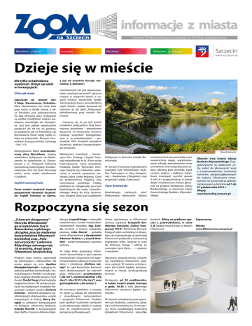 nr 9/wrzesień 2015 Wydawca©UM Szczecin pl. Armii Krajowej 1 tel. 91 424 56 00 e-mail: [email protected] Aktualności_co słychać? Ecozmiany Mieszkania Wydarzenia_co się dzieje? Dzieje się w mieście Nie tylko w kalendarzu wydarzeń. Dzieje się wiele w inwestycjach. Ulice jak nowe Zakończył się remont ulic: 3 Maja, Narutowicza, Potulicka. Ulica Narutowicza ma teraz dwa pasy ruchu w każdą stronę, a ulica Potulicka jest jednopasmowa Po obu stronach ulicy, wytyczone są wzdłuż chodników miejsca postojowe równolegle do krawężnika. Jest tam jednak ograniczenie prędkości do 40 km na godzinę, bo podobnie jak na Potulickiej czy Narutowicza trwać będą nadal roboty na poboczach. Nowym torowiskiem kursują również tramwaje – linii 1 i 9. Udostępniono także wyremontowaną ulicę Warcisława, między wiaduktem kolejowym na Niebuszewie (w sąsiedztwie ul. Orzeszkowej) a ul. Przyjaciół Żołnierza (obwodnicą śródmiejską). Zmodernizowana ulica ma teraz dwa pasy ruchu, nowe zatoki autobusowe i chodniki. Szybki tramwaj hula Przez ostatni weekend sierpnia pasażerowie testowali Szczeciński Szybki Tramwaj za darmo, a już od września kursuje normalnie, z „biletami”. Uruchomienie SST jest ukoronowaniem „rewolucji na torach”, jaka ma miejsce w ostatnich latach w naszym mieście. Szczeciński Szybki Tramwaj łączy lewo i prawobrzeżną część miasta i będzie kursował od centrum aż do pętli „Turkusowa” zlokalizowanej przy osiedlu Słoneczne. – Cieszymy się, że po tylu latach oczekiwań połączyliśmy linią tramwajową lewobrzeże i prawobrzeże Szczecina. To historyczny moment. Dziękuję wszystkim zaangażowanym w to przedsięwzięcie – powiedział Piotr Krzystek prezydent Szczecina, podczas inauguracyjnego przejazdu. Wykonawca inwestycji – konsorcjum firm Strabag i Szybki Tramwaj wybudowało m.in. 8 km torów tramwajowych, nowe przystanki, estakady, kładki. Torowisko tramwaju biegnie po estakadzie wykonanej w ramach przeprawy mostowej przez rzekę Regalicę. Dalej po przekroczeniu Regalicy linia tramwajowa przebiega między jezdniami ul. Hangarowej, po czym bezkolizyjnie dla ruchu samochodowego skręca do ulicy Jaśminowej i biegnie dalej pod wiaduktem Staw Brodowski kolejowym w kierunku osiedla Słonecznego. W ramach inwestycji wybudowano wiadukty nad Szczecińskim Szybkim Tramwajem w ulicy Hangarowej i Batalionów Chłopskich oraz przystanki i pętlę „Turkusowa”. Staw Brodowski Rewitalizacja „zielonych płuc” Niebuszewa ukończona. Oprócz oczyszczenia stawu, powstały nowe nawierzchnie alejek, wyremontowano schody, zamontowano nowe oświetlenie. Jest tutaj także plac zabaw, siłownia pod chmurką, kącik seniora, piękna i zadbana zieleń. Koszt inwestycji wyniósł ponad 4 mln zł i przypomnijmy, iż postał dzięki mieszkańcom, którzy głosowali na projekt rewitalizacji Stawu Brodowskiego w pierwszej edycji Szczecińskiego Budżetu Obywatelskiego. Obecnie trwa trzecia edycja Budżetu Obywatelskiego. Przygotowywane są ostateczne „Listy zadań do głosowania” wraz z przeprowadzeniem losowania numerów przyporządkowanych do zadania. Głosowanie mieszkańców na ponad 200 projektów zaplanowano w terminie od 1 do 21 października 2015 r. Więcej: www.konsultuj.szczecin.pl Rozpoczyna się sezon „II koncert skrzypcowy” Henryka Wieniawskiego w wykonaniu Guy’a Braunsteina, wybitnego skrzypka, jeszcze niedawno koncertmistrza filharmonii berlińskiej oraz „Polonez uroczysty” Ludomira Różyckiego zainauguruje, 18 września, drugi sezon Filharmonii Szczecińskiej. Program tego sezonu zapowiada się interesująco i różnorodnie. Na scenie pojawi się m.in. Apollon Musagète Quartett – najlepsza wizytówka polskiej kameralistyki, laureat „Paszportu Polityki” oraz brytyjskiej nagrody Borletti-Buitoni Trust Award. Xuefei Yang, którą brytyjska rozgłośnia Classic FM uznała za jedną ze stu najlepszych muzyków klasycznych naszych czasów, Sinfonia luventus – orkiestra skupiająca najzdolniejszych absolwentów uczelni muzycznych w Polsce, Barry Douglas w solowych kompozycjach na fortepian Johannesa Brahmsa, Isabelle Moretti w kompozycjach Karol Beffy i François-Adriena Boïel- dieugo, Leopold Hager – niezwykle utalentowany i znany interpretator wiedeńskich klasyków, Aga Zaryan, ceniona w świecie wokalistka jazzowa, Julia Marcel – gwiazda sceny alternatywnej z dyrygentem Adamem Sztabą czy Leszek Możdżer – polski kompozytor i pianista jazzowy. To tylko kilka propozycji Filharmonii Szczecińskiej w tym sezonie artystycznym. Oczywiście nie zapomniano także o edukacji muzycznej dzieci i młodzieży. „DoNuta taktuje” to cykl koncertów kameralnych dostosowanych do czterech grup wiekowych: przedszkolnej („Na raz”), wczesnoszkolnej („Na dwa”), klas IV-VI („Na trzy”) oraz gimnazjalistów („Na cztery”). 50-minutowe spotkania z muzyką na żywo są okazją do obcowania z prawdziwymi instrumentami i muzykami Filharmonii. Podczas tych spotkań uczniowie zachęcani są do aktywnego udziału w audycji oraz do współtworzenia nowych kompozycji dźwiękowych. Sezon wystawowy w Filharmonii otwiera wystawa fotografii Bartłomieja Barczyka „Kulisy inauguracji 2014”. Bartłomiej Barczyk, fotograf ludzi, architektury i dźwięków, do lodowej bryły szczecińskiej Filharmonii podszedł z ciekawością tropiącego wilka. Spojrzał w oczy tej Królowej Śniegu i odkrył, że wewnątrz tętni Życie…. – czytamy o wystawie. Ogromną popularnością cieszyło się zwiedzanie Filharmonii podczas wakacji. W sezonie artystycznym 2015/2016 będzie kontynuowane w nowej, atrakcyjniejszej formule. Począwszy od 30 października, w każdy ostatni piątek miesiąca o godz. 16.30 z holu głównego Filharmonii startować będzie wycieczka. W ramach zwiedzania, poza spacerem po budynku, uczestnicy zasiądą w sali kameralnej na 10-minutowy seans przybliżający kulturalną działalność Filharmonii i specyfik