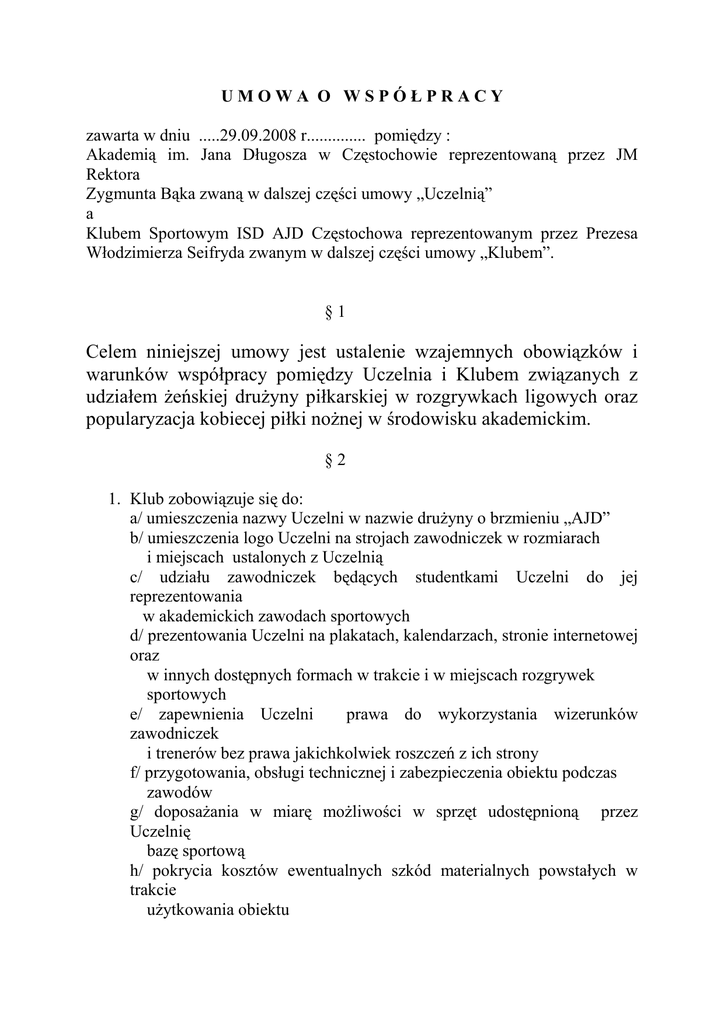 UMOWA O WSPÓŁPRACY zawarta w dniu .....29.09.2008 r.............. pomiędzy : Akademią im. Jana Długosza w Częstochowie reprezentowaną przez JM Rektora Zygmunta Bąka zwaną w dalszej części umowy „Uczelnią” a Klubem Sportowym ISD AJD Częstochowa reprezentowanym przez Prezesa Włodzimierza Seifryda zwanym w dalszej części umowy „Klubem”. §1 Celem niniejszej umowy jest ustalenie wzajemnych obowiązków i warunków współpracy pomiędzy Uczelnia i Klubem związanych z udziałem Ŝeńskiej druŜyny piłkarskiej w rozgrywkach ligowych oraz popularyzacja kobiecej piłki noŜnej w środowisku akademickim. §2 1. Klub zobowiązuje się do: a/ umieszczenia nazwy Uczelni w nazwie druŜyny o brzmieniu „AJD” b/ umieszczenia logo Uczelni na strojach zawodniczek w rozmiarach i miejscach ustalonych z Uczelnią c/ udziału zawodniczek będących studentkami Uczelni do jej reprezentowania w akademickich zawodach sportowych d/ prezentowania Uczelni na plakatach, kalendarzach, stronie internetowej oraz w innych dostępnych formach w trakcie i w miejscach rozgrywek sportowych e/ zapewnienia Uczelni prawa do wykorzystania wizerunków zawodniczek i trenerów bez prawa jakichkolwiek roszczeń z ich strony f/ przygotowania, obsługi technicznej i zabezpieczenia obiektu podczas zawodów g/ doposaŜania w miarę moŜliwości w sprzęt udostępnioną przez Uczelnię bazę sportową h/ pokrycia kosztów ewentualnych szkód materialnych powstałych w trakcie uŜytkowania obiektu 2. Uczelnia zobowiązuje się w miarę moŜliwości do: a/ nieodpłatnego udostępniania na czas treningu lub rozgrywania meczów hali sportowej oraz sali do ćwiczeń siłowych Akademickiego Centrum Sportowego wraz z niezbędnym zapleczem socjalno-technicznym w wymiarze czterech godz. tygodniowo w moŜliwie najkrótszym terminie od daty oddania obiektu do uŜytkowania b/ udostępnienia dwóch miejsc noclegowych w hotelu wchodzącym w skład Akademickiego Centrum Sportowego od momentu uruchomienia części Hotelowej c/ udzielenia pomocy socjalnej dla studentek-zawodniczek zgodnie z Regulaminem świadczeń pomocy materialnej dla studentów AJD d/ pokrycia kosztów udziału druŜyny reprezentującej Uczelnię w rozgrywkach akademickich składających się wyłącznie ze studentów AJD. §3 1. Strony niniejszej umowy zobowiązują się do poszanowania swoich interesów i udzielania sobie wszelkich informacji niezbędnych do prawidłowego wykonania umowy. 2. Strony zobowiązują się w trakcie obowiązywania umowy do powstrzymywania się od wszelkich działań, które mogłyby narazić dobre imię i dotychczasową renomę podmiotów tej Umowy. §4 W przypadku raŜących naruszeń umowy strony mogą odstąpić od współpracy. §5 Umowę zawarto na sezon rozgrywkowy w roku akademickim 2008/2009 (sezon rozgrywkowy pokrywa się z rokiem akademickim). §6 Umowę spisano w dwóch jednobrzmiących egzemplarzach, po jednej dla kaŜdej ze stron. A n e k s do umowy zawartej w dniu 29.09.2008 r. Realizując zapis umowy o współpracy pomiędzy Akademią im. J.Długosza a Klubem Sportowym ISD AJD Częstochowa dotyczący udostępnienia dwóch miejsc hotelowych w Akademickim Centrum Sportu AJD w roku akad. 2008/2009 Uczelnia zobowiązuje Klub do: • wytypowania dwóch zawodniczek – studentek AJD do zamieszkania w części hotelowej ACS • po akceptacji kandydatur przez Studium WFiSportu wpłaty kaucji w kasie uczelni w wysokości 500,- od osoby, której wyraŜono zgodę na zakwaterowanie w ACS, • zapoznanie osób zainteresowanych z Regulaminem części hotelowej Akademickiego Centrum Sportowego AJD (załącznik do Aneksu), • dokonania ww. czynności w terminie do 15.X.2008 r. Stroną nadzorującą poprawność wykonania powyŜszych zaleceń jest Prorektor ds. Nauczania i Wychowania oraz Studium Wychowania Fizycznego AJD.