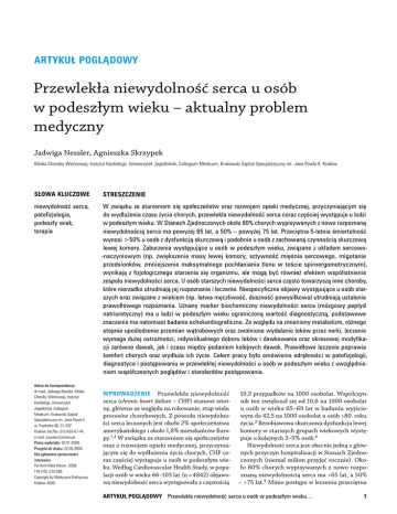 ARTYKUŁ POGLĄDOWY Przewlekła niewydolność serca u osób w podeszłym wieku – aktualny problem medyczny Jadwiga Nessler, Agnieszka Skrzypek Klinika Choroby Wieńcowej, Instytut Kardiologii, Uniwersytet Jagielloński, Collegium Medicum, Krakowski Szpital Specjalistyczny im. Jana Pawła II, Kraków słowa kluczowe streszczenie niewydolność serca, patofizjologia, podeszły wiek, terapia W związku ze starzeniem się społeczeństw oraz rozwojem opieki medycznej, przyczyniającym się do wydłużenia czasu życia chorych, przewlekła niewydolność serca coraz częściej występuje u ludzi w podeszłym wieku. W Stanach Zjednoczonych około 80% chorych wypisywanych z nowo rozpoznaną niewydolnością serca ma powyżej 65 lat, a 50% – powyżej 75 lat. Przeciętna 5‑letnia śmiertelność wynosi >50% u osób z dysfunkcją skurczową i podobnie u osób z zachowaną czynnością skurczową lewej komory. Zaburzenia występujące u osób w podeszłym wieku, związane z układem sercowo ‑naczyniowym (np. zwiększenie masy lewej komory, sztywność mięśnia sercowego, migotanie przedsionków, zmniejszenie maksymalnego pochłaniania tlenu w teście spiroergometrycznym), wynikają z fizjologicznego starzenia się organizmu, ale mogą być również efektem współistnienia zespołu niewydolności serca. U osób starszych niewydolności serca często towarzyszą inne choroby, które nierzadko utrudniają jej rozpoznanie i leczenie. Niespecyficzne objawy występujące u osób star‑ szych oraz związane z wiekiem (np. łatwa męczliwość, duszność powysiłkowa) utrudniają ustalenie prawidłowego rozpoznania. Uznany marker biochemiczny niewydolności serca (mózgowy peptyd natriuretyczny) ma u ludzi w podeszłym wieku ograniczoną wartość diagnostyczną, podstawowe znaczenie ma natomiast badanie echokardiograficzne. Ze względu na zmieniony metabolizm, różnego stopnia upośledzenie przemian wątrobowych oraz zwolnione wydalanie leków przez nerki, leczenie wymaga dużej ostrożności, indywidualnego doboru leków i dawkowania oraz okresowej modyfika‑ cji zarówno dawek, jak i czasu między podaniem kolejnych dawek. Prawidłowe leczenie poprawia komfort chorych oraz wydłuża ich życie. Celem pracy było omówienie odrębności w patofizjologii, diagnostyce i postępowaniu w przewlekłej niewydolności u osób w podeszłym wieku z uwzględnie‑ niem współczesnych poglądów i standardów postępowania. Adres do korespondencji: dr med. Jadwiga Nessler, Klinika Choroby Wieńcowej, Instytut Kardiologii, Uniwersytet Jagielloński, Collegium Medicum, Krakowski Szpital Specjalistyczny im. Jana Pawła II, ul. Prądnicka 80, 31-202 Kraków, tel./fax: 012‑633‑67‑44, e‑mail: [email protected] Praca wpłynęła: 20.01.2008. Przyjęta do druku: 22.05.2008. Nie zgłoszono sprzeczności interesów. Pol Arch Med Wewn. 2008; 118 (10): 572‑580 Copyright by Medycyna Praktyczna, Kraków 2008 WPROWADZENIE Przewlekła niewydolność serca (chronic heart failure – CHF) stanowi istot‑ ny, głównie ze względu na rokowanie, etap wielu procesów chorobowych. Z powodu niewydolno‑ ści serca leczonych jest około 2% społeczeństwa amerykańskiego i około 1,8% mieszkańców Euro‑ py.1,2 W związku ze starzeniem się społeczeństw oraz z rozwojem opieki medycznej, przyczynia‑ jącym się do wydłużenia życia chorych, CHF co‑ raz częściej występuje u osób w podeszłym wie‑ ku. Według Cardiovascular Health Study, w popu‑ lacji osób w wieku 66–103 lat (n = 4842) objawo‑ wa niewydolność serca występowała z częstością 19,3 przypadków na 1000 osobolat. Współczyn‑ nik ten zwiększał się od 10,6 na 1000 osobolat u osób w wieku 65–69 lat w badaniu wyjścio‑ wym do 42,5 na 1000 osobolat u osób >80. roku życia.3 Bezobjawowa skurczowa dysfunkcja lewej komory w starszych grupach wiekowych wystę‑ puje u kolejnych 3–5% osób.4 Niewydolność serca jest obecnie jedną z głów‑ nych przyczyn hospitalizacji w Stanach Zjedno‑ czonych (niemal milion przyjęć rocznie). Oko‑ ło 80% chorych wypisywanych z nowo rozpo‑ znaną niewydolnością serca ma >65 lat, a 50% – >75 lat.5 Mimo postępu w leczeniu przeciętna ARTYKUŁ POGLĄDOWY Przewlekła niewydolność serca u osób w podeszłym wieku… 1 5‑letnia śmiertelność wynosi około 50% u osób z dysfunkcją skurczową i podobnie u osób z za‑ chowaną czynnością skurczową lewej komory.6 Średni czas przeżycia od rozpoznania niewydol‑ ności serca jest uzależniony od płci i wynosi 1,7 roku u mężczyzn i 3,2 roku u kobiet.7 W badaniu DIAMOND u pacjentów hospitalizowanych z po‑ wodu CHF płeć męska była niezależnym czynni‑ kiem ryzyka zgonu.8 U osób w podeszłym wieku niewydolności serca często towarzyszą inne choroby i zmiany zacho‑ dzące w organizmie w następstwie procesu sta‑ rzenia się, dlatego też diagnostyka CHF w tej gru‑ pie wiekowej jest często utrudniona. Ze względu na zmieniony metabolizm, różnego stopnia upo‑ śledzenie przemian wątrobowych oraz zwolnio‑ ne wydalanie leków przez nerki, leczenie wymaga dużej ostrożności, indywidualnego doboru leków i okresowego ich modyfikowania. Prawidłowe le‑ czenie zwiększa komfort i wydłuża życie chorych. Celem niniejszej pracy jest omówienie odrębno‑ ści w patofizjologii, diagnostyce i postępowaniu w CHF u osób w wieku podeszłym z uwzględ‑ nieniem współczesnych poglądów i standardów postępowania. Definicja starości Nie ma uniwersalnej definicji starości. Zmiany fizjologiczne związane z upły‑ wem lat nie pojawiają się w ściśle określonym cza‑ sie ani nie mają jednakowego nasilenia u wszyst‑ kich ludzi. Większość definicji starości bazuje na wieku kalendarzowym. Światowa Organiza‑ cja Zdrowia określa starość jako wiek >60 lat; we‑ dług większości klasyfikacji amerykańskich grani‑ cę między wiekiem dojrzałym i podeszłym stano‑ wi 65. rok ży