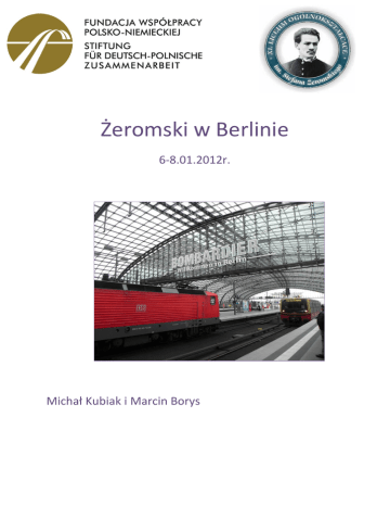 Żeromski w Berlinie 6-8.01.2012r. Michał Kubiak i Marcin Borys BERLIN? ZDOBYTY! DZIEO 1 Grupa uczniów z naszego XL Liceum z Oddziałami Dwujęzycznymi imienia Stefana Żeromskiego pod opieką pani Dyrektor Anny Szczepaoskiej-Filipp i pani Katarzyny Manowieckiej, nauczycielki języka niemieckiego w dniach 6-8.01.12r. odwiedziła stolicę Niemiec. Głównym punktem naszej wyprawy była wystawa „Obok. Polska-Niemcy. 1000 lat historii w sztuce”. Należy wspomnied, iż wycieczka nie mogłaby odbyd się, gdyby nie finansowe wsparcie Fundacji Współpracy Polsko-Niemieckiej. Naszą wyprawę rozpoczęliśmy w piątek z samego rana. Zaraz po wejściu do pociągu spotkała nas miła niespodzianka. We wszystkich przedziałach wisiały plakaty promujące polsko-niemiecką wystawę. Podróż pociągiem minęła nam niezwykle szybko i pełni entuzjazmu zobaczyliśmy przez okna naszego pociągu napis: Berlin Hauptbahnhof. Tu zaczęła się nasza berlioska przygoda bogata w różne dodatki okolicznościowe i lokalne. Podczas całego wyjazdu uczniowie otrzymywali zadania językowe i czas na ich wykonanie. Pierwsze zadanie polegało na doprowadzeniu grupy z dworca głównego do naszego hostelu „Happy Bed”. Uczeo musiał skorzystad z map i wskazówek w języku niemieckim, a także poprosid o pomoc miejscowych ludzi. Spisał się znakomicie. Mieliśmy jeszcze miłe spotkanie z… Trzema Królami i księdzem, którzy udzielili nam wszelkich błogosławieostw na cały pobyt i życzyli powodzenia w zamierzeniach. Mieszkaliśmy bowiem w najstarszej dzielnicy Berlina i nie dziwi więc przywiązanie do tradycji religijnych. Po rozpakowaniu się i szybkim serwisie osobistym wyruszyliśmy ponownie w miasto, aby jak najbardziej efektywnie wykorzystad dany nam czas i jak najszybciej poczud niezwykłą atmosferę tego multikulturowego miejsca. Wspólnie udaliśmy się na Alexander Platz - centrum dawnego Berlina Wschodniego, a dzisiejszy punkt spotkao młodych berlioczyków. Tam natknęliśmy się na kolejną osobliwośd niemieckiej stolicy. Na środku placu stał wielki pawilon, w którym berlioczycy wspólnie świętowali Wieczór Trzech Króli pijąc Gluhwein i jedząc narodowe przysmaki. Osoby o sportowych zainteresowaniach mogły spróbowad jazdy na łyżwach, a po ewentualnym upadku ogrzad się przy rozstawionych dookoła lodowiska koksownikach. Właśnie tego wieczoru mieliśmy okazję spróbowad prawdziwych berlioskich Currywurst. Dowiedzieliśmy się, że tak naprawdę nie są one typowo niemieckim daniem. Podobno Niemcy nauczyli się jeśd kiełbaski z ketchupem i z curry od Amerykanów stacjonujących w Berlinie Zachodnim. Później udaliśmy się w stronę Potsdamer Platz, położonego w najnowocześniejszej części miasta. Spacerowiczów ze wszystkich stron otaczają tam wysokie, przeszklone budynki. To właśnie na Potsdamer Platz odkryliśmy kawiarnię sieci Dunkin’ Donuts, w której sprzedawano wspaniałe pączki w różnych smakach, które towarzyszyły nam już do kooca naszego wyjazdu. Wróciliśmy do hostelu zmęczeni, ale bogatsi o nowe wrażenia, doświadczenia oraz odkrycie nowego oblicza znanego z podręczników i historii miasta. Wieczorem znaleźliśmy czas na wspólne sprawdzenie zadao językowych i wyłonienie zwycięzców. Zwycięzcom gratulujemy! Były tez zaskakujące nagrody w postaci … kompletu pieczątek zezwalających na przekroczenie Muru czy kartki-wizy, jaka niegdyś obowiązywała i oczywiście zdjęcia Bramy Brandenburskiej z Murem na pierwszym planie… DZIEO 2 Drugiego dnia pobytu w Berlinie z samego rana udaliśmy się na wystawę „Obok. Polska-Niemcy. 1000 lat historii w sztuce”, która prezentowana była w centrum wystawienniczym Martin-Gropius-Bau. Warto wspomnied, że ekspozycja ta jest niezwykle popularna zarówno wśród Niemców, jak i odwiedzających ją Polaków. To cieszy! W całym mieście, na przystankach autobusowych i budynkach wisiały plakaty i banery reklamujące wystawę. Było to dla nas wielkie, ale budujące zaskoczenie. „Obok. Polska-Niemcy. 1000 lat historii w sztuce” to próba - naszym zdaniem udana pokazania wspólnej historii Polski i Niemiec. Eksponaty przedstawiają przełomowe wydarzenia sąsiedzkich stosunków. W jednym miejscu zostały zgromadzone dzieła malarskie, rzeźbiarskie i instalacje artystyczne. Kuratorzy wystawy sięgnęli nie tylko po arcydzieła dawnych twórców, ale także korzystali z dorobku i pomocy współczesnych artystów, którzy przedstawiają stosunki dwóch krajów w dzisiejszych czasach. Wystawa składa się z 19 sal, w których pokazywane są różne momenty z polsko-niemieckiej historii. Do Berlina przyjechały dzieła wielu sławnych artystów. Wiele obrazów pokazywanych na wystawie widzieliśmy już wcześniej na kartach naszych podręczników do języka polskiego, czy historii. W jednym miejscu mogliśmy obejrzed prace m.in.: Brunona Schulza, Witkacego, Wita Stwosza, Aleksandra Gierymskiego, czy Artura Grottgera, nie zapominając o Matejce. Autorzy wystawy podzieli tematycznie zebrane materiały na 22 zagadnienia z zakresu polsko-niemieckich relacji. W sali otwierającej wystawę cofnęliśmy się o 1000 lat w czasie. Mogliśmy tu zobaczyd dzieła związane z takimi postaciami jak św. Wojciech, czy Rycheza – żona Mieszka II, królowa Polski. W kolejnych salach przekonaliśmy się jak ściśle związane były ze sobą dynastie polskie i niemieckie, a także jak rodził się i funkcjonował zakon krzyżackich w bliskim sąsiedztwie Polski. Jednym z najważniejszych dzieł, które zostały sprowadzone na wystawę, jest wypożyczony z Muzeum Narodowego w Krakowie „Hołd pruski” autorstwa Jana Matejki. Obraz ten został zestawiony z szokującą pracą Edwarda Dwurnika „Bitwa pod Grunwaldem”. Przy tej okazji wspomnied należy o jeszcze jednej pracy, zaskakującej rozmiarami, bo bliźniaczej wobec Matejkowskiej Bitwy pod Grunwaldem. Jednakże prezentowana na Wystawie Bitwa była ogromn