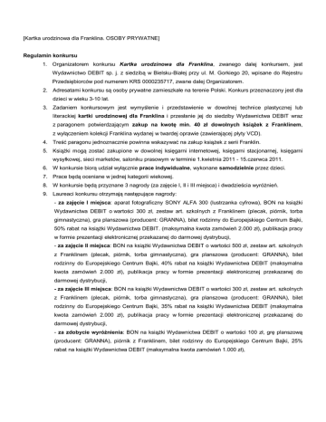 [Kartka urodzinowa dla Franklina. OSOBY PRYWATNE] Regulamin konkursu 1. Organizatorem konkursu Kartka urodzinowa dla Franklina, zwanego dalej konkursem, jest Wydawnictwo DEBIT sp. j. z siedzibą w Bielsku-Białej przy ul. M. Gorkiego 20, wpisane do Rejestru Przedsiębiorców pod numerem KRS 0000235717, zwane dalej Organizatorem. 2. Adresatami konkursu są osoby prywatne zamieszkałe na terenie Polski. Konkurs przeznaczony jest dla dzieci w wieku 3-10 lat. 3. Zadaniem konkursowym jest wymyślenie i przedstawienie w dowolnej technice plastycznej lub literackiej kartki urodzinowej dla Franklina i przesłanie jej do siedziby Wydawnictwa DEBIT wraz z paragonem potwierdzającym zakup na kwotę min. 40 zł dowolnych książek z Franklinem, z wyłączeniem kolekcji Franklina wydanej w twardej oprawie (zawierającej płyty VCD). 4. Treść paragonu jednoznacznie powinna wskazywać na zakup książek z serii Franklin. 5. Książki mogą zostać zakupione w dowolnej księgarni internetowej, księgarni stacjonarnej, księgarni wysyłkowej, sieci marketów, saloniku prasowym w terminie 1.kwietnia 2011 - 15.czerwca 2011. 6. W konkursie biorą udział wyłącznie prace indywidualne, wykonane samodzielnie przez dzieci. 7. Prace będą oceniane w jednej kategorii wiekowej. 8. W konkursie będą przyznane 3 nagrody (za zajęcie I, II i III miejsca) i dwadzieścia wyróżnień. 9. Laureaci konkursu otrzymają następujące nagrody: - za zajęcie I miejsca: aparat fotograficzny SONY ALFA 300 (lustrzanka cyfrowa), BON na książki Wydawnictwa DEBIT o wartości 300 zł, zestaw art. szkolnych z Franklinem (plecak, piórnik, torba gimnastyczna), gra planszowa (producent: GRANNA), bilet rodzinny do Europejskiego Centrum Bajki, 50% rabat na książki Wydawnictwa DEBIT. (maksymalna kwota zamówień 2.000 zł), publikacja pracy w formie prezentacji elektronicznej przekazanej do darmowej dystrybucji, - za zajęcie II miejsca: BON na książki Wydawnictwa DEBIT o wartości 500 zł, zestaw art. szkolnych z Franklinem (plecak, piórnik, torba gimnastyczna), gra planszowa (producent: GRANNA), bilet rodzinny do Europejskiego Centrum Bajki, 40% rabat na książki Wydawnictwa DEBIT (maksymalna kwota zamówień 2.000 zł), publikacja pracy w formie prezentacji elektronicznej przekazanej do darmowej dystrybucji, - za zajęcie III miejsca: BON na książki Wydawnictwa DEBIT o wartości 300 zł, zestaw art. szkolnych z Franklinem (plecak, piórnik, torba gimnastyczna), gra planszowa (producent: GRANNA), bilet rodzinny do Europejskiego Centrum Bajki, 35% rabat na książki Wydawnictwa DEBIT (maksymalna kwota zamówień 2.000 zł), publikacja pracy w formie prezentacji elektronicznej przekazanej do darmowej dystrybucji, - za zdobycie wyróżnienia: BON na książki Wydawnictwa DEBIT o wartości 100 zł, grę planszową (producent: GRANNA), piórnik z Franklinem, bilet rodzinny do Europejskiego Centrum Bajki, 25% rabat na książki Wydawnictwa DEBIT (maksymalna kwota zamówień 1.000 zł), 10. BONY wyszczególnione w pkt.9 Regulaminu można realizować w siedzibie Organizatora lub za pośrednictwem sklepu internetowego Wydawnictwa w terminie do 31.12.2011r. 11. Rabat obowiązuje przy zakupach dokonywanych w siedzibie Organizatora lub za pośrednictwem sklepu internetowego Organizatora www.wydawnictwo-debit.pl w terminie do 31.12.2011r. 12. Każda osoba może przesłać dowolną ilość zgłoszeń, przy czym nadesłanie większej ilości prac wymaga przedstawienia paragonu (paragonów) będącego wielokrotnością kwoty 40 zł, tj. nadesłanie 2 prac wymaga paragonu (paragonów) na kwotę min. 80zł, 3 prac wymaga nadesłania paragonu (paragonów) na kwotę min 120 zł itd. 13. Nadesłane prace, winny zawierać odpowiednie metryczki z następującymi danymi: nazwisko i imię, wiek autora, dane adresowe i telefon kontaktowy (ewentualnie adres mailowy) oraz zgodę na przetwarzanie danych osobowych oraz zgodę na brzmienie niniejszego Regulaminu – wzór dostępny w pkt. 26 Regulaminu. 14. Prace nadesłane na konkurs muszą być pracami własnymi, nigdzie wcześniej niepublikowanymi i nieprzedstawianymi na innych konkursach. 15. Uczestnictwo w konkursie oznacza udzielenie zgody na publikację imienia i nazwiska uczestnika. Nadesłanie prac do konkursu oznacza udzielenie zgody w tym zakresie. 16. Termin nadsyłania prac: do 15 czerwca 2011 r. (decyduje data wpływu prac do Wydawnictwa). 17. Prace należy przesyłać na adres: Wydawnictwo DEBIT ul. Gorkiego 20 43-300 Bielsko-Biała. Z dopiskiem: „Kartka urodzinowa dla Franklina” Dopuszczalne jest nadesłanie pracy w formie elektronicznej na adres [email protected] Prace plastyczne powinny być przesłane w formacie JPG (np. fotografia pracy), prace literackie powinny być przesłane w pliku edytora tekstowego .doc (MICROSOFT WORD). Dopuszczalne jest również nadesłanie paragonu i zgody na przetwarzanie danych osobowych w formie elektronicznej (skan lub zdjęcie), ale w przypadku, gdy nadesłana praca zostanie nagrodzona, konieczne jest przesłanie oryginałów dokumentów w formie papierowej. 18. Nadesłanie pracy oznacza, że uczestnicy konkursu przenoszą na Organizatora nieodpłatnie, w zakresie nieograniczonym terytorialnie oraz na czas nieoznaczony - autorskie prawa majątkowe do prac, na następujących polach eksploatacji: w zakresie utrwalania i zwielokrotniania prac - wytwarzanie egzemplarzy techniką drukarską, reprograficzną, zapisu magnetycznego oraz techniką cyfrową, w zakresie obrotu oryginałem albo egzemplarzami prac - wprowadzanie do obrotu, użyczenie lub najem oryginału albo egzemplarzy, publiczne udostępnianie prac, w taki sposób, aby każdy mógł mieć do niego dostęp w miejscu i w czasie przez siebie wybranym. 19. Uczestnicy konkursu upoważniają Organizatora do: decydowania w ich imieniu o pierwszym publicznym rozpowszechnieniu zgłoszonych do udziału w konkursie prac, przeprowadzenia w ich imieniu nadzoru autorskiego przed rozpowszechnieniem zg