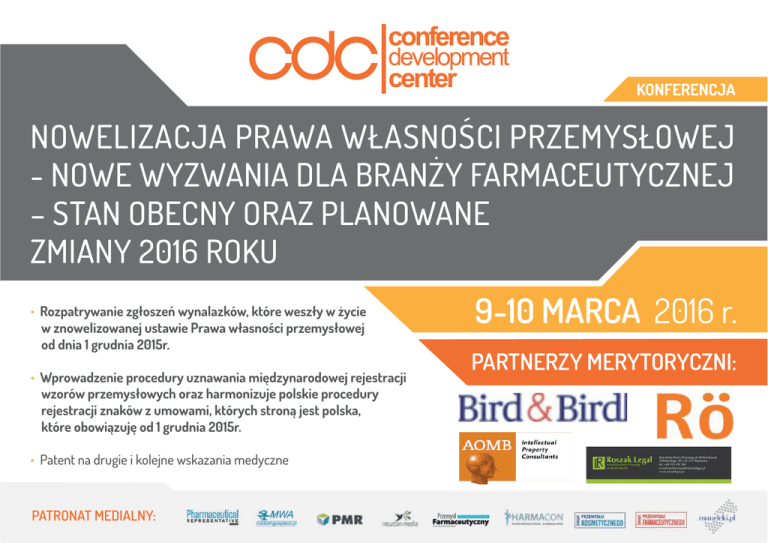 KONFERENCJA EJt>/:ŬWYtŬtC]EJ^/ŬWYDz]CJt: öŬEJtŬtztE/Ŭ>ŬYEzŬ&YDhczE: ÐŬ]cEŬJEzŬJYŬW>EJtE D/EzŬŻƟĭŨŬYJ<hŬ • Rozpatrywanie zgłoszeń wynalazków, które weszły w życie w znowelizowanej ustawie Prawa własności przemysłowej od dnia 1 grudnia 2015r. 9-10 MARCA 2016 r. PARTNERZY MERYTORYCZNI: • Wprowadzenie procedury uznawania międzynarodowej rejestracji wzorów przemysłowych oraz harmonizuje polskie procedury rejestracji znaków z umowami, których stroną jest polska, które obowiązuję od 1 grudnia 2015r. • Patent na drugie i kolejne wskazania medyczne PATRONAT MEDIALNY: ]ƛĘģƏĘ÷ŬWĚśůƏģ² zapraszamy do udziału w konferencji „Nowelizacja Prawa własności przemysłowej - nowe wyzwania dla branży farmaceutycznej – stan obecny oraz planowane zmiany 2016 roku”, która odbędzie się w dniach 9-10 marca 2016 roku w Hotelu Regent Warsaw ul Belwederska 23 w Warszawie. Pani Edyta Demby – Siwek Dyrektor Departamentu Znaków Towarowych organu nadzoru omówi tematy związane z nowelizacją ustawy w Prawie własności przemysłowej m.in.: • Zmiany dotyczące znaków towarowych, które weszły w życie 1 grudnia 2015r. w zakresie listów zgody oraz przesłanek bezwzględnych m.in. użycia w znaku nazwy i symboli Rzeczpospolitej Polskiej. • Zmiany proceduralne związane ze zmianą systemu rozpatrywania zgłoszeń znaków towarowych tj. z przejściem z systemu badawczego na sprzeciwowy – wejdą w życie 15 kwietnia 2016r. • Zmiany w zakresie prawa materialnego – również wejdą w życie dnia 15 kwietnia 2016r. • Zmiany nowelizacji w systemie rejestracji znaków towarowych, które wejdą w życie 1 kwietnia 2016 roku. Pani Edyta Demby – Siwek omowi również temat dotyczący przyjęcia przez Parlament Europejski dnia 16 grudnia 2015r. dwóch aktów prawnych mających zasadnicze znaczenie dla dalszego rozwoju i utrwalenia systemu ochrony znaków towarowych na poziome wspólnotowym: • rozporządzenie Parlamentu Europejskiego i Rady (UE) zmieniające rozporządzenie Rady (WE) nr 207/2009 w sprawie wspólnotowego znaku towarowego • rozporządzenie Komisji (WE) nr 2868/95 wykonujące rozporządzenie Rady (WE) nr 40/94 w sprawie wspólnotowego znaku towarowego. Mają one na celu: • Współistnienie systemów znaków towarowych na poziomie krajowym i unijnym • Równowagę między nimi, który stanowi fundament unijnej polityki odnośnie ochrony własności intelektualnej. Oba akty prawne oczekują obecnie na publikację w Dzienniku Urzędowym UE, zaś przewidywany czas ich wejścia w życie to marzec lub kwiecień 2016r. Konferencja jest doskonałą okazją na uzyskanie odpowiedzi na najbardziej nurtujące Państwa pytania. Wysoką jakość merytoryczną wydarzenia gwarantują zaproszeni prelegenci. ¶ăŬĺƕůĘ÷ÂŬÂąśĺœůģĒÖŬ<ƞ¶ƕŬſ¦ƛÂśůĘ÷ąŬĒŬĒģƞĈ÷ƏģŜ§ŬſƛƕśąĘ÷Ŭśƛ¦ƛÂäĤđģƏÂăŬģ¶ĺģƏ÷¶ƛ÷ŬƏŬůœą¦÷ÂŬąģĘØÂœÂʦă÷ŀ WœƛÂŜĈ÷ăŬśƏģăÂŬĺƕůĘ÷ÂŬĘŬ¶œÂś±Ŭ÷ƨ즶¦śƛąģĈÂĘ÷ŀĺĈ ŬŬŬŬŬŬŬŬŬŬŬŬŬŬŬĈÂĒÂĘůÂĒŬƏƕœĤƞĘ÷ă¦ƕĒŬąģĘØÂœÂʦăÒŬăÂśůŬĒģƞĈ÷ƏģŜ§Ŭƛ¶Ę÷ŬĺƕůĚŬƏƕąđ¶ģƏ¦ģĒŬŬůœĒ÷Ę÷ÂŬŤŬ¶Ę÷Ŭģ¶Ŭ¶ůƕŬƛąģ̦ƛÂĘ÷ ŬŬŬŬŬŬŬŬŬŬŬŬŬŬŬĘŬ¶œÂśŬĒ÷ĈģƏƕ±Ŭ÷ƨ즶¦śƛąģĈÂĘ÷ŀĺĈŀŬŬJ¶ĺģƏ÷¶ƜŬſƛƕśąăŬWĚśůƏģŬœĤƏĘ÷ÂƞŬƏŬůœĒ÷Ę÷ÂŬŤŬ¶Ę÷Ŭģ¶Ŭ¶ůƕŬĺœƛÂśđĘ÷ŬƛĺƕůĘ÷ŀ ĺœśƛĒŬ¶ģŬſ¶ƛ÷đſ ]ƕĈƏ÷ŬEģƏ÷Ěśą CEO CONFERENCE DEVELOPMENT CENTER AGENDA KONFERENCJI ĝŬĒœ¦ ĝŀŴƟŬÐŬĭƟŀƟƟŬŬ <ƏŬĺģƏ÷ůĈĘŬģœƛŬœÂăÂśůœ¦ăŬſ¦ƛÂśůĘ÷ąĤƏ ĭƟŀƟƟŬÐŬĭĭŀƟƟŬŬ tƕąđ¶ ĭĭŀƟƟŬÐŬĭĭŀĭÚŬŬ WœƛœƏŬĘŬąƏÒ ĭĭŀĭÚŬÐŬĭŻŀŴƟŬŬ tƕąđ¶ ĭŻŀŴƟŬÐŬĭŴŀĭÚŬŬ >ſʦò ĭŴŀĭÚŬÐŬĭÚŀĭÚŬŬ tƕąđ¶ ĭÚŀĭÚŬÐŬĭÚŀŴƟŬŬ WœƛœƏŬĘŬąƏÒ ĭÚŀŴƟŬÐŬĭŨŀŴƟŬŬ tƕąđ¶ ĭŨŀŴƟŬÐŬŬ Ŭ ąģ̦ƛÂĘ÷ÂŬĺ÷œƏśƛÂäģŬ¶Ę÷ŬąģĘØÂœÂʦă÷ PROGRAM 9.30 – 10.00 Kawa powitalna oraz rejestracja uczestników 10.00 – 11.00 Udzielanie patentów na substancje lecznicze w praktyce Urzędu Patentowego RP • Zmiany w zakresie rozpatrywania zgłoszeń wynalazków, które weszły w życie w znowelizowanej ustawie Prawa własności przemysłowej od dnia 1 grudnia 2015r. • Pojęcia podstawowe z zakresu Prawa Własności Przemysłowej • Dodatkowe Prawo Ochronne (DPO) dla produktów medycznych oraz środków ochrony roślin • Substancje lecznicze – kryteria zdolności patentowej w świetle ustawy prawo własności przemysłowej • Kategorie wynalazków dla substancji leczniczych – praktyczne aspekty • Zdolność patentowa wynalazków biotechnologicznych • Procedura przed UPRP • Strategia ochrony patentowej Prelegent: Piotr Czaplicki – Dyrektor Departamentu Badań Patentowych UPRP 11.00 – 11.15 Przerwa na kawę 11.15 – 12.30 1) Nowelizacja Prawa własności przemysłowej: • Zmiany nowelizacji w systemie rejestracji znaków towarowych. • Zmiany dotyczące znaków towarowych, które weszły w życie dnia 1 grudnia 2015r. w zakresie listów zgody oraz przesłanek bezwzględnych m.in. użycia w znaku nazwy i symboli Rzeczpospolitej Polskiej. • Zmiany proceduralne związane ze zmianą systemu rozpatrywania zgłoszeń znaków towarowych tj. z przejściem z systemu badawczego na sprzeciwowy – wejdą w życie • Zmiany w zakresie prawa materialnego – również wejdą w życie dnia 15 kwietnia 2016r. • Zmiany nowelizacji w systemie rejestracji znaków towarowych, które wejdą w życie 1 kwietnia 2016 roku. 2) Zmiany w prawie unijnym: dyrektywa i rozporządzenie o znakach towarowych: zmiany rozporządzenia 207/2009 w sprawie wspólnotowego znaku towarowego oraz nowa dyrektywa mająca na celu zbliżenie ustawodawstwa pa