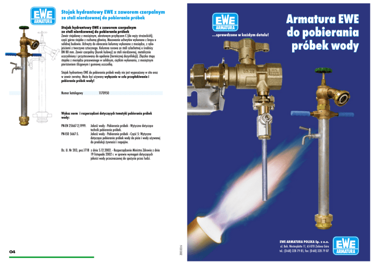 Stojak hydrantowy EWE z zaworem czerpalnym ze stali nierdzewnej do pobierania próbek Stojak hydrantowy EWE z zaworem czerpalnym ze stali nierdzewnej do pobierania próbek Zawór stojakowy z mosiężnym, obrotowym przyłączem C (do węży strażackich), część górna stojaka z ruchomą głowicą. Mocowanie uchwytów wykonane z brązu o solidnej budowie. Uchwyty do obracania kolumny wykonane z mosiądzu, z rękojeściami z tworzywa sztucznego. Kolumna rurowa ze stali szlachetnej o średnicy DN 80 mm. Zawór czerpalny (kurek kulowy) ze stali nierdzewnej, metalicznie uszczelniony i przystosowany do opalania (termicznej dezynfekcji). Złączka stopy stojaka z mosiądzu prasowanego w solidnym, ciężkim wykonaniu, z mosiężnym pierścieniem ślizgowym i gumową uszczelką. ...sprawdzone w każdym detalu! Armatura EWE do pobierania próbek wody Stojak hydrantowy EWE do pobierania próbek wody nie jest wyposażony w sito oraz w zawór zwrotny. Może być używany wyłącznie w celu przepłukiwania i pobierania próbek wody! Numer katalogowy 1170950 Wykaz norm i rozporządzeń dotyczących tematyki pobierania próbek wody: PN-EN 25667-2;1999. PN-ISO 5667-5. Jakość wody - Pobieranie próbek - Wytyczne dotyczące technik pobierania próbek. Jakość wody - Pobieranie próbek –Część 5: Wytyczne dotyczące pobierania próbek wody do picia i wody używanej do produkcji żywności i napojów. 04 2003.03/si Dz. U. Nr 203, poz.1718 z dnia 5.12.2002. - Rozporządzenie Ministra Zdrowia z dnia 19 listopada 2002 r. w sprawie wymagań dotyczących jakości wody przeznaczonej do spożycia przez ludzi. EWE ARMATURA POLSKA Sp. z o.o. ul. Boh. Westerplatte 11, 65-078 Zielona Góra tel.: (0-68) 328 79 85, fax: (0-68) 328 79 87 Opalany zawór spustowy EWE Opalany kurek kulowy EWE Zestawy wodomierzowe EWE Opalany zawór spustowy EWE Umożliwia termiczną dezynfekcję (przed pobraniem próbek wody) zaworu spustowego z gwintem zewnętrznym G 1/4“ lub G 3/8“ poprzez opalanie przedłużającej rurki ze stali nierdzewnej (o średnicy Ø 10 mm i długości ok. 100 mm). Rozporządzenie Ministra Zdrowia z dnia19.11.2002 (Dz. U. Nr 203, poz. 1718 z dnia 5.12.2002) dotyczące jakości wody przeznaczonej do spożycia przez ludzi reguluje sposób i częstotliwość badań wody. W wyniku tego rozporządzenia wzrastać będzie ilość pobieranych próbek i coraz bardziej istotnym będzie miejsce dokonywania poboru próbki. Od lat sprawdzony zestaw wodomierzowy EWE - Qn 2,5 z przyłączami 1’’ w połączeniu z kompensatorem wzdłużnym oraz z kurkiem czerpalnym ze stali nierdzewnej tworzy niezawodną i trwałą armaturę do pobierania próbek wody. Gwint zewnętrzny G 1/4“ G 3/8“ Numer katalogowy 3372448 3372449 Opalany kurek kulowy EWE Umożliwia pobieranie próbek wody na zaworach posiadających odwodnienie (spust). Termicznej dezynfekcji dokonuje się przez opalanie rurki ze stali nierdzewnej (o średnicy Ø 10 mm i długości ok. 100 mm), która jest przedłużeniem tzw. kurka kontrolnego. Numer katalogowy Przykład zastosowania: z kurkiem ze stali nierdzewnej do pobierania próbek wody Zalety: - zawór czerpalny (kurek) ze stali nierdzewnej - metalicznie uszczelniony i przystosowany do opalania - konsola ze stali nierdzewnej z otworem na umocowanie plomby - zestaw wodomierzony dostarczany w różnych wersjach armatury odcinającej Zestaw wodomierzowy EWE PN 10, 90°C w komplecie z kurkiem ze stali nierdzewnej do pobierania próbek wody, z kulowym zaworem odcinającym oraz z zaworem skośnym z wbudowanym zaworem zwrotnym. 3372447 Poziomy montaż wodomierza Wymiary wodomierza Przyłącza gwintowe Rp Qn mm Wejście Wyjście 2,5 190 1 1 2,5 190 1 1/4 1 2,5 190 1 1/4 1 1/4 Konsola niebieska Numer katalogowy 3239613 3239616 3239617 Konsola nierdzewna Numer katalogowy 3839613 3839616 3839617 Zestaw wodomierzowy EWE PN 10, 90°C w komplecie z kurkiem ze stali nierdzewnej do pobierania próbek wody, z zaworem skośnym EWE wg. normy DIN 3502 oraz zaworem skośnym z wbudowanym zaworem zwrotnym. Poziomy montaż wodomierza Wymiary wodomierza Przyłącza gwintowe Rp Qn mm Wejście Wyjście 2,5 190 1 1 1 1 2,5 190 1 /4 2,5 190 1 1/4 1 1/4 02 Konsola niebieska Numer katalogowy 3139613 3139616 3139617 Konsola nierdzewna Numer katalogowy 3739613 3739616 3739617 03