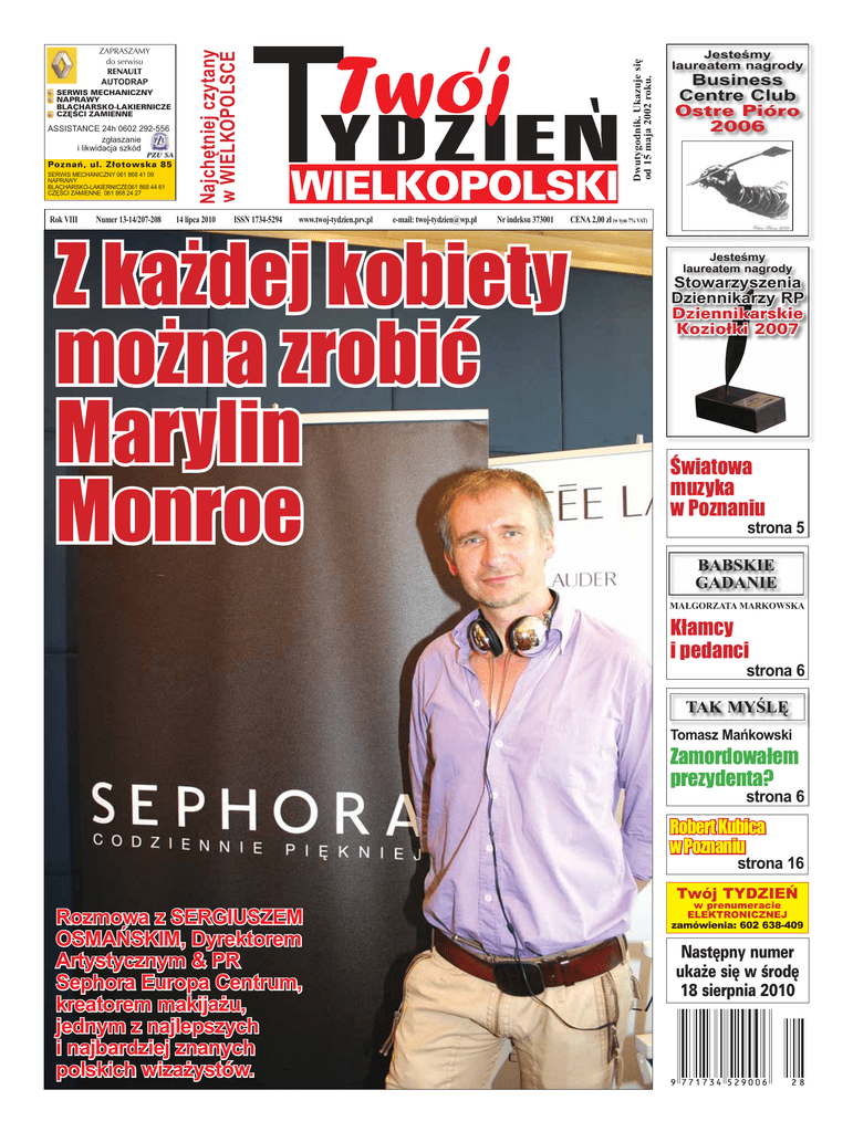 ASSISTANCE 24h 0602 292-556 zgłaszanie i likwidacja szkód Poznań, ul. Złotowska 85 SERWIS MECHANICZNY 061 868 41 09 NAPRAWY BLACHARSKO-LAKIERNICZE061 868 44 61 CZĘŚCI ZAMIENNE 061 868 24 27 Rok VIII Numer 13-14/207-208 14 lipca 2010 ISSN 1734-5294 Dwutygodnik. Ukazuje się od 15 maja 2002 roku. SERWIS MECHANICZNY NAPRAWY BLACHARSKO-LAKIERNICZE CZĘŚCI ZAMIENNE Najchętniej czytany w WIELKOPOLSCE ZAPRASZAMY do serwisu RENAULT AUTODRAP www.twoj-tydzien.prv.pl e-mail: [email protected] Nr indeksu 373001 Jesteśmy laureatem nagrody Business Centre Club Ostre Pióro 2006 CENA 2,00 zł (w tym 7% VAT) Z każ każdej kobiety możżna zrobić mo zrobić Marylin Monroe Jesteśmy laureatem nagrody Stowarzyszenia Dziennikarzy RP Dziennikarskie Koziołki 2007 Światowa muzyka w Poznaniu strona 5 BABSKIE GADANIE MAŁGORZATA MARKOWSKA Kłamcy i pedanci strona 6 TAK MYŚLĘ Tomasz Mańkowski Zamordowałem prezydenta? strona 6 Robert Kubica w Poznaniu strona 16 Twój TYDZIEŃ Rozmowa z SERGIUSZEM OSMAŃ OSMA ŃSKIM, Dyrektorem Artystycznym & PR Sephora Europa Centrum, kreatorem makijaż makijażu, jednym z najlepszych i najbardziej znanych polskich wiza wizażżyst ystó ów. w prenumeracie ELEKTRONICZNEJ zamówienia: 602 638-409 Następny numer ukaże się w środę 18 sierpnia 2010 strona 3 i 9 2 środa 14 lipca 2010 Włosy proste i lśnią CIEKAWOSTKI KOSMETYCZNE Najlepsza ochrona Suche stopy Emulsja ochronna SPF 50+ Iwostin Solecrin to hypoalergiczny preparat zapewniający bardzo wysoką ochronę przed promieniowaniem UVA i UVB. Zawiera kompozycję filtrów organicznych i mineralnych oraz Antileukine 6® - substancję, która chroni komórki od wewnątrz wzmacniając naturalny system przeciwsłonecznej obrony skóry. Preparat jest odporny na wodę i pot. Chroni skórę przed powstawaniem stanów zapalnych, oparzeń skóry (rumienia) oraz nadmierną pigmentacją. Emulsja ochronna SPF 50+ Iwostin Solecrin otrzymała pozytywną opinię Centrum Zdrowia Dziecka. Jest polecana od 6. miesiąca życia. Cena: 47 zł (100 ml) Przed zabiegiem Po zabiegu W iele Pań chce mieć włosy bardziej gładkie, proste, lśniące, łatwiejsze do ułożenia. Rozwiązaniem jest nowy zabieg Keratin Complex Smoothing Therapy by Coppola dostępny w wybranych salonach fryzjerskich. Eliminuje puszenie i kręcenie się włosów. Dla wielu klientek jest to zupełnie nowe doświadczenie, ponieważ zabieg odmładza włosy nadając i miękkość i gładkość. A przy tym jest to pielęgnacja, która w odróżnieniu od innych kuracji prostujących, nie zawiera substancji chemicznych odpowiedzialnych za zmianę struktury włosów. Dzięki temu prostowanie włosów uzdrawia je, a nie szkodzi im. Remigia Blandzi ul. Nałęczowska 125 60-472 Poznań Tel. 061 842 96 39 tel. kom. 606 344 717 NOWY ZABIEG Prostowanie włosów ZAPRASZAM od poniedziałku do piątku 9.00 – 20.00 soboty 8.00 – 14.00 - Kurację Keratin Complex Smoothing Therapy by Coppola można stosować do każdego rodzaju włosów, ponieważ jest naprawdę łagodna, chociaż skuteczna – wyjaśnia Remigia Blandzi, stylistka fryzur, właścicielka Studia Fryzur Blandzi przy ulicy Nałęczowskiej w Poznaniu. – Można, a nawet warto tak prostować również włosy farbowane, które stają się gładkie, mają zdrowy wygląd, a przy tym kolor jest zachowany na dłużej. Ta kuracja jest dostępna tylko w wybranych salonach fryzjerskich i musi być przeprowadzona przez specjalnie wyszkolonych stylistów. Po myciu włosów (1, 2 lub 3 razy w za- leżności od rodzaju włosów - naturalne czy farbowane) i częściowym wysuszeniu stylista nakłada pędzelkiem keratynę na każde pasmo włosów. Klientka musi teraz odczekać z włosami pod przykryciem, a następnie fryzjerka wyczesuje nadmiar keratyny, a potem prostuje każde pasemko dwanaście razy, co trwa około 3 godzin. Wówczas fryzura wygląda już na gotową, włosy są proste, ale to nie jest koniec. Przez 72 godziny nie można myć, moczyć ani spinać włosów (odkształcać ich), aby kuracja dobrze zadziałała. Jeśli włosy się lekko zmoczą, lub pokręcą, trzeba je wysuszyć i wyprostować. Po trzech dniach podczas kolejnej wizyty w salonie fryzjerskim stylistka zmywa keratynę, nakłada specjalną odżywkę, spłukuje, i potem już tylko następuje suszenie prostych gładkich włosów, które się pięknie układają. Aby efekt się utrzymywał, trzeba stosować specjalny szampon i odżywkę, które klientka otrzymuje w salonie. Produkty pielęgnacyjne w dużych opakowaniach są dołączone w cenie zabiegu. Zabieg Keratin Complex Smoothing Therapy by Coppola przetestowany w Studio Fryzur Blandzi przez naszą dziennikarkę udał się wspaniale. Po kilku myciach włosy ma niezmiennie gładkie i proste, nie puszą się ani trochę. Szampon i odżywka są przyjemne w stosowaniu, a włosy się szybko i łatwo układa, a właściwie wystarczy wysuszyć, więc klientka jest bardzo zadowolona. MONIKA MAŃKOWSKA MARTA WOJCIECHOWSKA Codzienny spray ochronny do stóp Propodia likwiduje wydzielanie potu – zawiera sól aluminium. Dodatkowo opatentowany składnik Hydagen® C.A.T. redukuje aktywność bakterii, co zmniejsza ryzyko pojawiania się odcisków i odparzeń. Pochodzący z olejku drzewa herbacianego Origanol® ogranicza rozwój bakterii i grzybów na powierzchni skóry i zapobiega powstawaniu przykrego zapachu. Dzięki innowacyjnej formule suchego sprayu preparat szybko się wchłania, nie pozostawiając na skórze uczucia wilgotności. Cena 21,50 zł (150 ml). FOT. - PROPODIA Łagodna depilacja ORIFLAME pomaga uzyskać gładką, wydepilowaną skórę bez podrażnień. Żel do depilacji Silk & Smooth z jedwabiem i bawełną, nawilża i chroni przed podrażnieniami. Ultra cienka warstwa pokrywa skórę, dzięki czemu maszynka do golenia przesuwa się wyjątkowo gładko. Cena 14,90 zł (150 ml). Kojący balsam po depilacji łagodzi podrażnienia po depilacji i intensywnie nawilża skórę. Alantoina zapobiega z