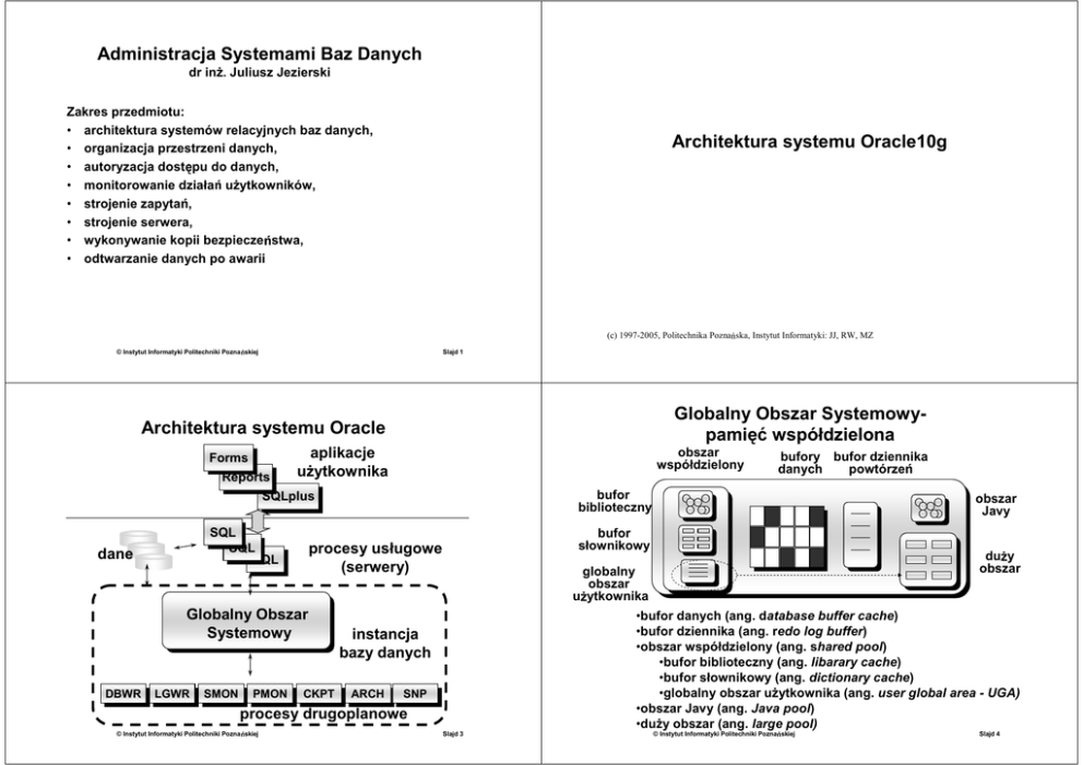 Administracja Systemami Baz Danych dr inŜ. Juliusz Jezierski Zakres przedmiotu: przedmiotu: • architektura systemów relacyjnych baz danych, danych, • organizacja przestrzeni danych, danych, • autoryzacja dostępu do danych, danych, • monitorowanie działań uŜytkowników, ytkowników, • strojenie zapytań, • strojenie serwera, serwera, • wykonywanie kopii bezpieczeństwa, stwa, • odtwarzanie danych po awarii Architektura systemu Oracle10g (c) 1997-2005, Politechnika Poznańska, Instytut Informatyki: JJ, RW, MZ © Instytut Informatyki Politechniki Poznańskiej Slajd 1 Globalny Obszar SystemowySystemowypamięć współdzielona Architektura systemu Oracle Forms Reports aplikacje uŜytkownika obszar współdzielony bufor biblioteczny SQLplus SQL SQL SQL dane DBWR LGWR SMON PMON CKPT SNP procesy drugoplanowe © Instytut Informatyki Politechniki Poznańskiej duŜy obszar globalny obszar uŜytkownika instancja bazy danych ARCH obszar Javy bufor słownikowy procesy usługowe (serwery) Globalny Obszar Systemowy bufory bufor dziennika danych powtórzeń Slajd 3 •bufor danych (ang. database buffer cache) •bufor dziennika (ang. redo log buffer) •obszar współdzielony (ang. shared pool) •bufor biblioteczny (ang. libarary cache) •bufor słownikowy (ang. dictionary cache) •globalny obszar uŜytkownika (ang. user global area - UGA) •obszar Javy (ang. Java pool) •duŜy obszar (ang. large pool) © Instytut Informatyki Politechniki Poznańskiej Slajd 4 Pamięć prywatna procesów instancji Globalny obszar systemowy - sterowanie wielkością • Ręczne - za pomocą parametrów inicjalizacyjnych: inicjalizacyjnych: – DB_CACHE_SIZE - bufor danych – LOG_BUFFER - bufor dziennika – SHARED_POOL_SIZE obszar współdzielony (bufor biblioteczny + bufor słownikowy + globalny obszar uŜytkownika) – JAVA_POOL_SIZE - obszar Javy – LARGE_POOL_SIZE - duŜy obszar • Automatyczne - za pomocą parametru inicjalizacyjnego: inicjalizacyjnego: SGA_TARGET • Parametry te są dynamiczne, czyli mogą być zmieniane w trakcie pracy instancji • Wielkość całej instancji moŜe być ograniczona za pomocą parametru SGA_MAX_SIZE © Instytut Informatyki Politechniki Poznańskiej SQL PGA prywatne obszary poleceń SQL bufor biblioteczny SGA SQL Slajd 5 Parametry inicjalizacyjne mające wpływ na wielkość prywatnego obszaru poleceń SQL • OPEN_CURSORS - liczba prywatnych obszarów SQL równocześnie wykorzystywanych przez kursory przez pojedynczy proces serwera, zamknięcie kursora powoduje jego dealokację, domyślnie 50 • SESSION_CACHED_CURSORS - umoŜliwia buforowanie kursorów po stronie procesu serwera i odciąŜa wykorzystanie obszaru bibliotecznego, domyślnie 0 © Instytut Informatyki Politechniki Poznańskiej Obszary PGA Robocze SQL Private Global Area: Area: • stos - zmienne, tablice sesji itp., • informacje o sesji uŜytkownika, • prywatny obszar poleceń SQL • zmienne i parametry poleceń SQL(kursory) • obszary robocze SQL - sortowanie danych, tworzenia i przetwarzania map bitowych oraz tablic haszowych Slajd 7 © Instytut Informatyki Politechniki Poznańskiej Slajd 6 Obszary robocze SQL - sterowanie wielkością • Ręczne - za pomocą parametrów inicjalizacyjnych (dla kaŜdego procesu serwera): – BITMAP_MERGE_AREA_SIZE – CREATE_BITMAP_AREA_SIZE – HASH_AREA_SIZE – SORT_AREA_SIZE • Automatyczne - za pomocą parametru inicjalizacyjnych: inicjalizacyjnych: – PGA_AGGREGATE_TARGET (od 10MB do 4000MB) określa docelowy rozmiar pamięci PGA dla wszystkich sesji przyłączonych do instancji – WORKAREA_SIZE_POLICY - dopuszczalne wartości: • AUTO - uaktywnia automatyczne zarządzania pamięcią sortowania • MANUAL - dezaktywuje automatyczne zarządzania pamięcią sortowania i umoŜliwia ręczną alokację za pomocą parametrów %_AREA_SIZE © Instytut Informatyki Politechniki Poznańskiej Slajd 8 Procesy usługowe (serwery) • Konfiguracje serwerów usługowych SQL procesy usługowe - realizują Ŝądania uŜytkowników, wykonując: – autoryzację, analizę składniową i optymalizację polecenia SQL, – odczyt niezbędnych bloków z dysku do buforów, – pielęgnują listy: LRU i kolejkę punktu kontrolnego obszar współdzielony bufor danych Bufor biblioteczny • z dedykowanymi serwerami sqlplus formularz raport 4. Odczyt danych ZałoŜenie blokad zapis do segm. wycofania i modyfikacja danych Rejestracja zmian SQL SGA • z współdzielonymi serwerami we sqlplus formularz 2 © Instytut Informatyki Politechniki Poznańskiej 3 4 SQL wy dane 1 Slajd 9 © Instytut Informatyki Politechniki Poznańskiej Slajd 10 Sekretarz Dziennika Powtórzeń • Zadania Sekratarza Dziennika Powtórzeń (ang. Log WriterWriterLGWR) LGWR) – zapis danych z bufora dziennika do pliku • następuje zatwierdzenie transakcji • • • • SGA bufor ten jest w jednej trzeciej zapełniony upłyną trzy sekundy od ostatniego zapisu zostaje zgłoszony punkt kontrolny zanim DBW0 dokona jakiegokolwiek zapisu na dysk zawartości bufora danych lista LRU SGA Kolejka punktu kontrolnegot LGWR bufor dziennika powtórzeń DBW0 dane © Instytut Informatyki Politechniki Poznańskiej SQL SQL dane zadania Sekretarza Bazy Danych (ang. Database WriterWriter-DBW0): DBW0): – zapis zmodyfikowanych bloków z buforów na dysk gdy: • zostanie zgłoszony punkt kontrolny • upłyną trzy sekundy od ostatniego zapisu • brakuje miejsca w buforze danych • liczba brudnych bloków przekroczy określoną granicę bufor danych dispatcher raport Sekretarz Bazy Danych • dane SQL bufor dziennika powtórzeń bufor słownikowy 1. 2. 3. SQL Slajd 11 © Instytut Informatyki Politechniki Poznańskiej plik dziennika powtórzeń Slajd 12 Punkty kontrolne Przełączanie plików dziennika powtórzeń Zdarzenia systemowe uaktualniające informacje o najstarszym brudnym bloku w buforze danych - inf. inf. niezbędna do odtwarzania bd po awarii instancji Dwa rodzaje punktów kontrolnych: – Przyrost
