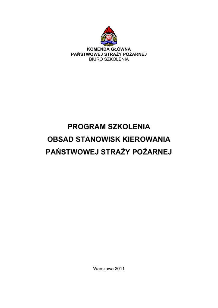 KOMENDA GŁÓWNA PAŃSTWOWEJ STRAŻY POŻARNEJ BIURO SZKOLENIA PROGRAM SZKOLENIA OBSAD STANOWISK KIEROWANIA PAŃSTWOWEJ STRAŻY POŻARNEJ Warszawa 2011 Koordynacja prac: mł. bryg. mgr inż. Adam Langner – Komenda Wojewódzka Państwowej Straży Pożarnej w Poznaniu Opracowanie merytoryczne: − st. bryg. Andrzej Król – Komenda Wojewódzka Państwowej Straży Pożarnej w Poznaniu, − st. kpt. Jarosław Kuśmirek – Komenda Wojewódzka Państwowej Straży Pożarnej w Poznaniu, − kpt. Piotr Mądry – Komenda Miejska Państwowej Straży Pożarnej w Poznaniu, − asp. Paweł Klecha – Komenda Wojewódzka Państwowej Straży Pożarnej w Poznaniu. Zagadnienia dotyczące umiejętności komunikacyjnych, interpersonalnych i zarządzania stresem opracował zespół psychologów w składzie: − mł. bryg. mgr Cezary Dobrodziej – Komenda Główna Państwowej Straży Pożarnej, − kpt. mgr Marta Różycka – Komenda Wojewódzka Państwowej Straży Pożarnej w Katowicach, − mł. asp. mgr Anna Nawrocka – Szkoła Aspirantów Państwowej Straży Pożarnej w Poznaniu, − mł. ogn. mgr Joanna Pluczyńska – Komenda Wojewódzka Państwowej Straży Pożarnej w Poznaniu. Konsultacja merytoryczna: Krajowe Centrum Koordynacji Ratownictwa i Ochrony Ludności Konsultacje metodyczne: Magdalena Stajszczak – Komenda Główna Państwowej Straży Pożarnej 2 Spis treści I. Założenia dydaktyczno-wychowawcze..........................................................................4 1. 2. 3. 4. II. Cel szkolenia ................................................................................................................4 Sylwetka absolwenta ....................................................................................................4 Czas trwania szkolenia.................................................................................................5 Warunki przyjęcia na szkolenie. ...................................................................................5 Realizacja procesu dydaktycznego. ..............................................................................6 1. 2. 3. 4. 5. III. Organizacja szkolenia ..................................................................................................6 Baza dydaktyczna ........................................................................................................7 Kadra dydaktyczna .......................................................................................................7 Zalecenia i wskazówki metodyczne..............................................................................8 Plan nauczania. ..........................................................................................................10 Treści kształcenia. .......................................................................................................11 1. 2. 3. 4. 5. 6. 7. 8. 9. 10. 11. 12. 13. Organizacyjno-prawne podstawy funkcjonowania stanowisk kierowania .................. 11 Organizacja i funkcjonowanie CPR i systemu PRM .................................................... 11 Współdziałanie ze służbami i podmiotami ratowniczymi oraz instytucjami współdziałającymi ......................................................................................................... 11 Zagrożenia na obszarze chronionym .......................................................................... 12 Zasoby ratownicze ...................................................................................................... 12 Łączność i alarmowanie. Programy komputerowe wspomagające kierowanie działaniami ratowniczymi .......................................................................... 13 Zasady przyjmowania zgłoszeń alarmowych............................................................... 14 Zasady czytania i analizy map w pozycjonowaniu zdarzeń. ....................................... 15 Zasady dysponowania sił i środków oraz zabezpieczenia operacyjnego obszarów chronionych w aspekcie ich dynamicznych zmian .................................................... 15 Organizacja działań ratowniczych ............................................................................... 16 Dokumentacja stanowisk kierowania i jej wykorzystanie ........................................... 16 Umiejętności komunikacyjne, interpersonalne i zarządzanie stresem.......................17 Rola mediów w procesie przekazywania informacji ze zdarzenia. Współpraca z rzecznikiem prasowym ......................................................................... 18 Załącznik ................................................................................................................................19 3 I. ZAŁOŻENIA DYDAKTYCZNO–WYCHOWAWCZE 1. CEL SZKOLENIA Celem szkolenia jest przygotowanie słuchacza do wykonywania zadań dyspozytora w stanowisku kierowania Państwowej Straży Pożarnej (PSP). 2. SYLWETKA ABSOLWENTA W wyniku realizacji szkolenia słuchacz powinien: a) w sferze poznawczej: − omawiać organizację i zasady funkcjonowania stanowisk kierowania, − omawiać organizację i zasady funkcjonowania CPR, − omawiać organizację i zasady funkcjonowania systemu Państwowe Ratownictwo Medyczne (PRM), − omawiać rolę i zadania służb, podmiotów i instytucji współdziałających z KSRG, − opisywać zagrożenia występujące na obszarze chronionym, − omawiać zasady prowadzenia łączności radiowej i telefonicznej, − omawiać procedury przyjmowania zgłoszeń o różnorodnych zagrożeniach życia/ zdrowia, mienia lub środowiska, − omawiać procedury alarmowania poszczególnych podmiotów systemów, − omawiać procedury dysponowania sił i środków (SIS) do poszczególnych rodzajów zagrożeń, − analizować zmiany obszarów chronionych po zadysponowaniu SIS, − przedstawiać zasady formułowania komunikatów służących udzielaniu wsparcia psychologicznego osobom zgłaszającym zdarzenie, − 