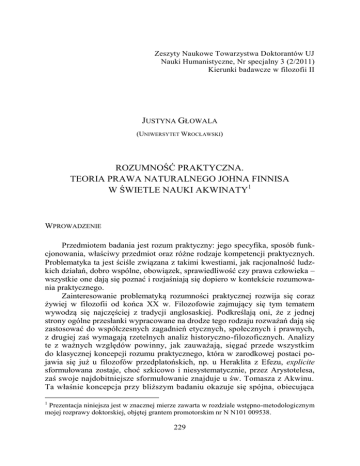 Zeszyty Naukowe Towarzystwa Doktorantów UJ Nauki Humanistyczne, Nr specjalny 3 (2/2011) Kierunki badawcze w filozofii II JUSTYNA GŁOWALA (UNIWERSYTET WROCŁAWSKI) ROZUMNOŚĆ PRAKTYCZNA. TEORIA PRAWA NATURALNEGO JOHNA FINNISA W ŚWIETLE NAUKI AKWINATY1 WPROWADZENIE Przedmiotem badania jest rozum praktyczny: jego specyfika, sposób funkcjonowania, właściwy przedmiot oraz różne rodzaje kompetencji praktycznych. Problematyka ta jest ściśle związana z takimi kwestiami, jak racjonalność ludzkich działań, dobro wspólne, obowiązek, sprawiedliwość czy prawa człowieka – wszystkie one dają się poznać i rozjaśniają się dopiero w kontekście rozumowania praktycznego. Zainteresowanie problematyką rozumności praktycznej rozwija się coraz żywiej w filozofii od końca XX w. Filozofowie zajmujący się tym tematem wywodzą się najczęściej z tradycji anglosaskiej. Podkreślają oni, że z jednej strony ogólne przesłanki wypracowane na drodze tego rodzaju rozważań dają się zastosować do współczesnych zagadnień etycznych, społecznych i prawnych, z drugiej zaś wymagają rzetelnych analiz historyczno-filozoficznych. Analizy te z ważnych względów powinny, jak zauważają, sięgać przede wszystkim do klasycznej koncepcji rozumu praktycznego, która w zarodkowej postaci pojawia się już u filozofów przedplatońskich, np. u Heraklita z Efezu, explicite sformułowana zostaje, choć szkicowo i niesystematycznie, przez Arystotelesa, zaś swoje najdobitniejsze sformułowanie znajduje u św. Tomasza z Akwinu. Ta właśnie koncepcja przy bliższym badaniu okazuje się spójna, obiecująca 1 Prezentacja niniejsza jest w znacznej mierze zawarta w rozdziale wstępno-metodologicznym mojej rozprawy doktorskiej, objętej grantem promotorskim nr N N101 009538. 229 Justyna Głowala __________________________________________________________________________________________________________________________________________________________________________________________________________________________________ w kontekście rozwiązania współczesnych trudności w tej dziedzinie badań oraz broni się przed zarzutami sceptyków. Zarazem zdecydowanie wymaga ona nowej wykładni – oczyszczającej ją z wielu późnoscholastycznych i nowożytnych przekształceń, które całkowicie zmieniły jej główne założenia i znaczenia, przez co stały się przyczyną wielu poważnych błędów i nieporozumień. Jedną z najważniejszych współczesnych teorii, będących w taki sposób kontynuacją i rozwinięciem koncepcji klasycznej (w wersji odwołującej się do św. Tomasza), jest tzw. nowa teoria prawa naturalnego. Teoria ta rozwija się od kilku dekad i uznana jest za nadzwyczaj znaczącą i przełomową w najnowszych badaniach nad rozumnością praktyczną. Do jej głównych reprezentantów należą: John M. Finnis, Germain Grisez, Joseph Boyle, Robert P. George oraz William E. May. W prezentowanej tu rozprawie najbardziej znaczące są twierdzenia i argumentacje pierwszego z wymienionych autorów (ur. 1940)2. W niniejszym artykule omawiam kolejno: cel i tezy rozprawy, wagę podejmowanego zagadnienia, metodę i ogólny plan pracy. Zanim przejdę do wymienionych wyżej punktów, najpierw przedstawię w zarysie, czym jest rozum praktyczny w ujęciu Akwinaty i Johna Finnisa oraz jaki jest charakter jego pierwszych przesłanek, których zbiór określany jest w tej teorii jako prawo naturalne. ROZUM PRAKTYCZNY I PRAWO NATURALNE W myśl wspomnianej wyżej koncepcji, r o z u m p r a k t y c z n y jest zdolnością czy też władzą osoby, odpowiadającą za podejmowanie rozmyślnych działań w imię pewnych racji i z roszczeniem do racjonalności. Doniosłość tej władzy przejawia się zarówno w działaniach politycznych na wielką skalę, jak i w osobistych decyzjach. Zasadniczym zadaniem rozumu praktycznego jest realizacja tego, co obmyślił. Obmyślanie zaś polega na wnioskowaniu, czyli przechodzeniu od pewnych przesłanek (Akwinata nazywa je niekiedy „zasadami” – principia, co można wyjaśniać, mówiąc o „punkcie wyjścia” rozumowania) do wniosków. W takim obmyślaniu biorą udział ogólne i szczegółowe (dotyczące konkretnej sytuacji) przesłanki; oba typy zaś mają szczególny charakter przez to, że dotyczą działania. 2 Do podstawowych pozycji tego autora należą: Natural Law and Natural Rights, Oxford 1980 (wydanie polskie: Prawo naturalne i uprawnienia naturalne, tłum. K. Lossman Warszawa 2001); Fundamentals of Ethics, Oxford 1983; Moral Absolutes: Tradition, Revision and Truth, Washington D.C. 1991; Aquinas: Moral, Political, and Legal Theory, Oxford 1998; G. Grisez, J. Boyle, Practical Principles, Moral Truth and Ultimate Ends, “American Journal of Jurisprudence” 1987, Vol. 32, s. 99-151; Nuclear Deterrence. Morality and Realism, Oxford 1987. Do nowej teorii prawa naturalnego odwołują się również autorzy reprezentujący odmienne nurty filozoficzne, którzy uznani są za oponentów i krytyków tej teorii, przede wszystkim: R. McCormick, C. Curran, E. Vacek, R. Hittinger, H. Veatch. 230 Rozumność praktyczna... __________________________________________________________________________________________________________________________________________________________________________________________________________________________________ Spośród tych przesłanek ogólne, będące podstawą oraz (także, nierzadko) wynikiem procesu obmyślania, mają charakter prawa. To, że prawo jest właśnie dziełem rozumu praktycznego i czymś przez rozum sformułowanym, jest rzeczą godną szczególnej uwagi. W związku z tym problematyka rozumu praktycznego okazuje się w naturalny sposób nadrzędna względem kontekstu prawnego; w tej również mierze teoretyk prawa musi – mniej lub bardziej wprost i jawnie – opierać się na założeniach dotyczących rozumności praktycznej. Sprawa ta jest istotna w szczególności z tego względu, że to właśni
