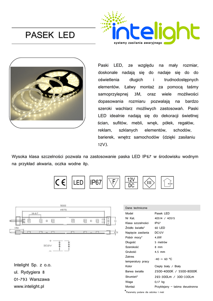 PASEK LED systemy zasilania awaryjnego Paski LED, ze względu na mały rozmiar, doskonale nadają się do nadaje się do do oświetlenia elementów. długich Łatwy trudnodostępnych montaż 3M, samoprzylepnej dopasowania i za oraz rozmiaru pomocą wiele taśmy możliwości pozwalają na bardzo szeroki wachlarz możliwych zastosowań. Paski LED idealnie nadają się do dekoracji świetlnej ścian, sufitów, mebli, wnęk, półek, regałów, reklam, szklanych elementów, schodów, barierek, wnętrz samochodów (dzięki zasilaniu 12V). Wysoka klasa szczelności pozwala na zastosowanie paska LED IP67 w środowisku wodnym na przykład akwaria, oczka wodne itp. Dane techniczne Model Pasek LED Nr Kat. 40514 / 40515 Klasa szczelności IP67 Źródło światła* 60 LED Napięcie zasilania DC12V Pobór mocy* 4.8W Długość 5 metrów Szerokość 8 mm Grubość Zakres Intelight Sp. z o.o. ul. Rydygiera 8 01-793 Warszawa www.intelight.pl temperatury pracy 4.5 mm -40 ~ 60 ºC Kolor Ciepły biały / Biały Barwa światła 2500-4000K / 5500-8000K Strumień* 265-300Lm / 300-330Lm Waga 0,17 kg Montaż Przyklejany – taśma dwustronna *Parametry podane dla odcinka 1 metr