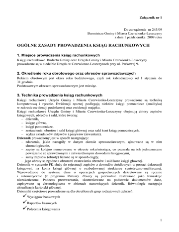 Załącznik nr 1 Do zarządzenia nr 245/09 Burmistrza Gminy i Miasta Czerwionka-Leszczyny z dnia 1 października 2009 roku OGÓLNE ZASADY PROWADZENIA KSIĄG RACHUNKOWYCH 1. Miejsce prowadzenia ksiąg rachunkowych Księgi rachunkowe Budżetu Gminy oraz Urzędu Gminy i Miasta Czerwionka-Leszczyny prowadzone są w siedzibie Urzędu w Czerwionce-Leszczynach przy ul. Parkowej 9. 2. Określenie roku obrotowego oraz okresów sprawozdawczych Rokiem obrotowym jest okres roku budżetowego, czyli rok kalendarzowy od 1 stycznia do 31 grudnia. Podstawowym okresem sprawozdawczym jest miesiąc. 3. Technika prowadzenia ksiąg rachunkowych Księgi rachunkowe Urzędu Gminy i Miasta Czerwionka-Leszczyny prowadzone są techniką komputerową i ręcznie. Ewidencji ręcznej podlegają niektóre księgi pomocnicze (analityka) w zakresie ewidencji podatkowej oraz ewidencji majątku. Księgi rachunkowe Urzędu Gminy i Miasta Czerwionka-Leszczyny obejmują zbiory zapisów księgowych, obrotów i sald, które tworzą: – dziennik, – księgę główną, – księgi pomocnicze, – zestawienia: obrotów i sald księgi głównej oraz sald kont ksiąg pomocniczych, – wykaz składników aktywów i pasywów (inwentarz). Dziennik prowadzony jest w sposób następujący: – zdarzenia, jakie nastąpiły w danym okresie sprawozdawczym, ujmowane są w nim chronologicznie, – zapisy są kolejno numerowane w okresie roku/miesiąca, co pozwala na ich jednoznaczne powiązanie ze sprawdzonymi i zatwierdzonymi dowodami księgowymi, – sumy zapisów (obroty) liczone są w sposób ciągły, – jego obroty są zgodne z obrotami zestawienia obrotów i sald kont księgi głównej. Dziennik w systemie FK służy do rejestracji zapisów z dowodów źródłowych w postaci dekretacji księgowej, na konta księgi głównej o rozbudowanej strukturze syntetyczno-analitycznej. Wprowadzone do systemu dane o operacjach gospodarczych dekretowane są ręcznie i automatycznie (z programu Ratusz). Zbiory są pierwotnie zestawione jako transakcje niezakończone. Podczas przetwarzania, skontrolowane na podstawie dokumentów dane, zapisywane są chronologiczne w zbiorach stanowiących dziennik. Równolegle następuje aktualizacja kartoteki głównej. Dzienniki częściowe prowadzone są dla określonych grup rodzajowych zdarzeń: Wyciągów bankowych Raportów kasowych Polecenia księgowania 1 Rejestrów zakupu Rejestrów sprzedaży Na koniec każdego okresu sprawozdawczego sporządzane jest zestawienie obrotów dzienników częściowych. Księga główna (konta syntetyczne) prowadzona jest w sposób spełniający następujące zasady: – podwójnego zapisu, – systematycznego i chronologicznego rejestrowania zdarzeń gospodarczych zgodnie z zasadą memoriałową, z wyjątkiem dochodów i wydatków, które ujmowane są w terminie ich zapłaty, niezależnie od rocznego budżetu, którego dotyczą, – (w zakresie dotacji i udziałów gminy w podatkach BP) według „zmodyfikowanej” zasady kasowej na podstawie rozdziału 6 „Rozliczenia w okresie przejściowym po zakończeniu roku budżetowego” rozporządzenia Ministra Finansów z dnia 29 czerwca 2006 r w sprawie szczegółowego sposobu wykonywania budżetu państwa ( Dz.U. Nr 116, poz. 784), – powiązania dokonywanych w niej zapisów z zapisami w dzienniku. W księdze głównej znajdują się zapisy pochodzące z dowodów księgowych oraz automatycznych transmisji. Zapisy dokonywane są w pełnym układzie analitycznym (określonym w zakładowym planie kont). Na kontach głównych (syntetyka do trzech miejsc), stanowią zbiorcze sumy zapisów z składających się na nie kont analitycznych. Na podstawie zbioru zaksięgowanych danych sporządzane są zestawienia obrotów i sald w układzie analitycznym i syntetycznym. Zestawienia te, dzięki przewidzianym w programie procedurom kontroli, wykazują pełną zgodność danych pomiędzy sobą jak i z dziennikiem. Księgi pomocnicze (konta analityczne) stanowią zapisy uszczegóławiające dla wybranych kont księgi głównej. Zapisy na kontach analitycznych dokonywane są zgodnie z zasadą zapisu powtarzanego. Ich forma dostosowywana jest za każdym razem do przedmiotu ewidencji konta głównego. Księgi pomocnicze prowadzone są w dwóch układach: 1.W programie finansowo-księgowym FK, jako zbiór wyodrębnionych danych w ramach kont księgi głównej o rozbudowanej strukturze syntetyczno-analitycznej, gdzie suma sald początkowych i obrotów na kontach ewidencji analitycznej stanowi początkowe saldo i obroty kont księgi głównej, zaś suma sald końcowych na kontach ewidencji analitycznej stanowi saldo końcowe konta księgi głównej. 2.Jako moduły dziedzinowe: Podatki, Wieczyste użytkowanie, Płace, System środki trwałe, System wyposażenie. Moduły te obsługiwane są poza księgą główną stanowiąc ewidencję szczegółową. Dodatkowy zbiór (poziom), stanowi klasyfikacja budżetowa dochodów i wydatków wbudowana jako podsystem w programie FK. Ewidencja zdarzeń gospodarczych zapisywana na kontach analitycznych rozbudowana jest o zapisy w układzie klasyfikacji budżetowej, w celu sporządzenia obowiązujących sprawozdań budżetowych. Ewidencja ta prowadzona jest do dochodów i wydatków (konto 130) oraz kosztów i przychodów (konta 400,700,750,760) Konta pozabilansowe pełnią funkcję wyłącznie informacyjno-kontrolną. Zdarzenia na nich rejestrowane nie powodują zmian w składnikach aktywów i pasywów. Na kontach pozabilansowych obowiązuje zapis jednokrotny, który nie podlega uzgodnieniu z dziennikiem ani innym urządzeniem ewidencyjnym. Ujmowane są na nich m. innymi: obce środki trwałe przejściowo użytkowane zaangażowanie dochodów własnych urzędu zaangażowanie wydatków budżetowych roku bieżącego zaangażowanie wydatków budżetowych przyszłych lat poniesione wydatki strukturalne 2 plan finansowy wydatków budżetowych plan finansowy wydatków niewygasajacych Księgi rachunkowe prowadzi się w cel