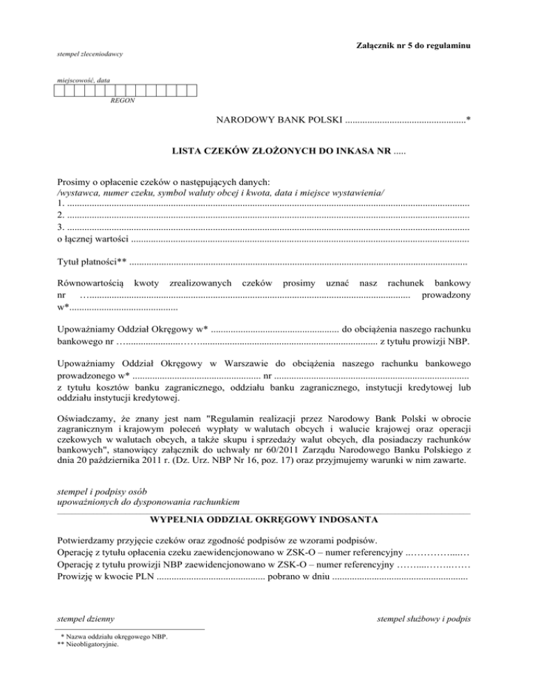 Załącznik nr 5 do regulaminu stempel zleceniodawcy miejscowość, data REGON NARODOWY BANK POLSKI .................................................* LISTA CZEKÓW ZŁOŻONYCH DO INKASA NR ..... Prosimy o opłacenie czeków o następujących danych: /wystawca, numer czeku, symbol waluty obcej i kwota, data i miejsce wystawienia/ 1. ................................................................................................................................................................... 2. ................................................................................................................................................................... 3. ................................................................................................................................................................... o łącznej wartości ......................................................................................................................................... Tytuł płatności** ......................................................................................................................................... Równowartością kwoty zrealizowanych czeków prosimy uznać nasz rachunek bankowy nr ….................................................................................................................................. prowadzony w*............................................ Upoważniamy Oddział Okręgowy w* .................................................... do obciążenia naszego rachunku bankowego nr …......................……........................................................................ z tytułu prowizji NBP. Upoważniamy Oddział Okręgowy w Warszawie do obciążenia naszego rachunku bankowego prowadzonego w* .................................................... nr ............................................................................... z tytułu kosztów banku zagranicznego, oddziału banku zagranicznego, instytucji kredytowej lub oddziału instytucji kredytowej. Oświadczamy, że znany jest nam "Regulamin realizacji przez Narodowy Bank Polski w obrocie zagranicznym i krajowym poleceń wypłaty w walutach obcych i walucie krajowej oraz operacji czekowych w walutach obcych, a także skupu i sprzedaży walut obcych, dla posiadaczy rachunków bankowych", stanowiący załącznik do uchwały nr 60/2011 Zarządu Narodowego Banku Polskiego z dnia 20 października 2011 r. (Dz. Urz. NBP Nr 16, poz. 17) oraz przyjmujemy warunki w nim zawarte. stempel i podpisy osób upoważnionych do dysponowania rachunkiem ___________________________________________________________________________________________________________________ WYPEŁNIA ODDZIAŁ OKRĘGOWY INDOSANTA Potwierdzamy przyjęcie czeków oraz zgodność podpisów ze wzorami podpisów. Operację z tytułu opłacenia czeku zaewidencjonowano w ZSK-O – numer referencyjny ..…………....… Operację z tytułu prowizji NBP zaewidencjonowano w ZSK-O – numer referencyjny ……....……..…… Prowizję w kwocie PLN ............................................ pobrano w dniu ....................................................... stempel dzienny * Nazwa oddziału okręgowego NBP. ** Nieobligatoryjnie. stempel służbowy i podpis
