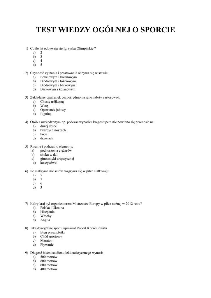 TEST WIEDZY OGÓLNEJ O SPORCIE 1) Co ile lat odbywają się Igrzyska Olimpijskie ? a) 2 b) 3 c) 4 d) 5 2) Czynność zginania i prostowania odbywa się w stawie: a) Łokciowym i kolanowym b) Biodrowym i łokciowym c) Biodrowym i barkowym d) Barkowym i kolanowym 3) Zakładając opatrunek bezpośrednio na ranę należy zastosować: a) Chustę trójkątną b) Watę c) Opatrunek jałowy d) Ligninę 4) Osób z uszkodzonym np. podczas wypadku kręgosłupem nie powinno się przenosić na: a) dużej desce b) twardych noszach c) kocu d) drzwiach 5) Rwanie i podrzut to elementy: a) podnoszenia ciężarów b) skoku w dal c) gimnastyki artystycznej d) koszykówki 6) Ile maksymalnie setów rozgrywa się w piłce siatkowej? a) 5 b) 7 c) 6 d) 3 7) Który kraj był organizatorem Mistrzostw Europy w piłce nożnej w 2012 roku? a) Polska i Ukraina b) Hiszpania c) Włochy d) Anglia 8) Jaką dyscyplinę sportu uprawiał Robert Korzeniowski a) Bieg przez płotki b) Chód sportowy c) Maraton d) Pływanie 9) Długość bieżni stadionu lekkoatletycznego wynosi: a) 500 metrów b) 800 metrów c) 600 metrów d) 400 metrów 10)Panczenista to zawodnik uprawiający: a) Jazdę figurową na lodzie b) Jazdę konną c) Strzelectwo sportowe d) Jazdę szybką na łyżwach 11)Rozszyfruj skrót UKS (NP. UKS ŁADY) a) Uczniowskie Koło Sportowe b) Unijny Klub Sportowy c) Uczniowski Klub Sportowy d) Uczniowski Klub Samorządowy 12)Która z wymienionych konkurencji nie należy do lekkiej atletyki? a) skok w dal b) skok o tyczce c) skok przez skrzynię d) skok wzwyż 13)Co oznaczają kolory kół na fladze olimpijskiej ? a) Tęczę b) Kontynenty c) Kluby sportowe d) Kraje 14)Gdzie odbyły się pierwsze nowożytne Igrzyska Olimpijskie ? a) Paryż b) Warszawa c) Londyn d) Ateny 15)Ile kół tworzy flagę olimpijską ? a) 7 b) 6 c) 5 d) 4 16)Co to są igrzyska paraolimpijskie? a) Na paralotniach b) Młodzieżowe c) Dla niepełnosprawnych d) Kwalifikacje olimpijskiej 17) Jaki skrót ma Europejska federacja piłkarska? a) UEFA b) FIFA c) UNICEF d) PZPN 18)Jaki sport uprawiał Adam Małysz? a) skok wzwyż b) kombinacje norweską c) skoki narciarskie d) slalom gigant 19)Najlepsza polska tenisistka? a) Otylia Jędrzejczak b) Agnieszka Radwańska c) Irena Szewińska d) Justyna Kowalczyk 20)Ile razy w Polsce odbyły się Igrzyska Olimpijskie? a) 1 b) 0 c) 2 d) 3 21)Z ilu biegaczy składa się sztafeta olimpijska 4 x 400 metrów? a) 2 b) 3 c) 4 d) 5 22)Mamut to popularna nazwa: a) stadionu Chelsea b) skoczni narciarskiej c) toru kolarskiego d) kortu tenisowego 23)Jaka dyscyplina sportu kryje się za skrótem NBA? a) hokej b) baseball c) koszykówka d) siatkówka 24)Jaki Polski sportowiec kojarzy ci się z „FORMUŁA 1” ? a) Robert Korzeniowski b) Kuba Giermaziak c) Robert Lewandowski d) Robert Kubica 25) „Ping pong” to inaczej: a) japońskie sztuki walki b) tenis stołowy c) zawody strzeleckie d) zawody pływackie