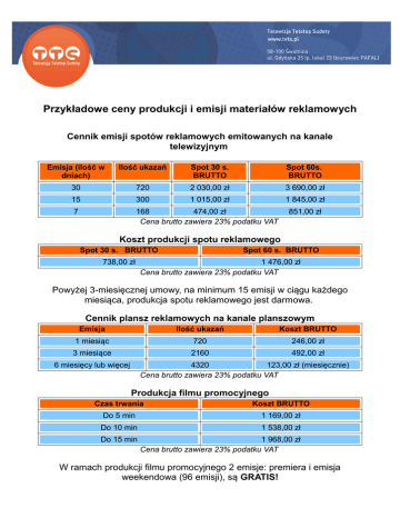 Przykładowe ceny produkcji i emisji materiałów reklamowych Cennik emisji spotów reklamowych emitowanych na kanale telewizyjnym Emisja (ilość w dniach) Ilość ukazań Spot 30 s. BRUTTO Spot 60s. BRUTTO 30 720 2 030,00 zł 3 690,00 zł 15 300 1 015,00 zł 1 845,00 zł 7 168 474,00 zł Cena brutto zawiera 23% podatku VAT 851,00 zł Koszt produkcji spotu reklamowego Spot 30 s. BRUTTO 738,00 zł Spot 60 s. BRUTTO 1 476,00 zł Cena brutto zawiera 23% podatku VAT Powyżej 3-miesięcznej umowy, na minimum 15 emisji w ciągu każdego miesiąca, produkcja spotu reklamowego jest darmowa. Cennik plansz reklamowych na kanale planszowym Emisja Ilość ukazań Koszt BRUTTO 1 miesiąc 720 246,00 zł 3 miesiące 2160 492,00 zł 6 miesięcy lub więcej 4320 123,00 zł (miesięcznie) Cena brutto zawiera 23% podatku VAT Produkcja filmu promocyjnego Czas trwania Koszt BRUTTO Do 5 min 1 169,00 zł Do 10 min 1 538,00 zł Do 15 min 1 968,00 zł Cena brutto zawiera 23% podatku VAT W ramach produkcji filmu promocyjnego 2 emisje: premiera i emisja weekendowa (96 emisji), są GRATIS! Wywiad sponsorowany Czas trwania Koszt produkcji w studio BRUTTO Koszt produkcji z dojazdem do klienta BRUTTO Do 5 min 861,00 zł 984,00 zł Do 10 min 1 230,00 zł 1 353,00 zł Do 15 min 1 599,00 zł 1 722,00 zł Cena brutto zawiera 23% podatku VAT Istnieje możliwość umieszczenia przez Państwa reklamy na stronie internetowej lub na pasku informacyjnym, w takim wypadku prosimy o kontakt z działem marketingu. Dla wszystkich klientów, którzy zainteresowani są inną formą reklamy, oferta i cennik ustalany jest indywidualnie z uwzględnieniem osobistych potrzeb i oczekiwań klienta. Telewizja Teletop Sudety uwzględnia też system promocji i rabatów.