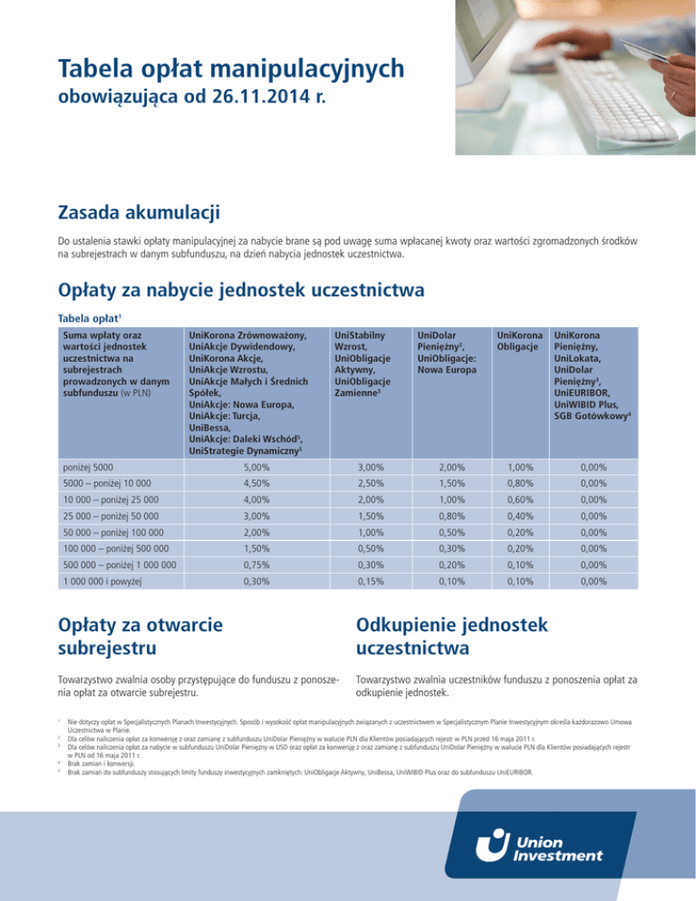 Tabela opłat manipulacyjnych obowiązująca od 26.11.2014 r. Zasada akumulacji Do ustalenia stawki opłaty manipulacyjnej za nabycie brane są pod uwagę suma wpłacanej kwoty oraz wartości zgromadzonych środków na subrejestrach w danym subfunduszu, na dzień nabycia jednostek uczestnictwa. Opłaty za nabycie jednostek uczestnictwa Tabela opłat1 Suma wpłaty oraz wartości jednostek uczestnictwa na subrejestrach prowadzonych w danym subfunduszu (w PLN) UniKorona Zrównoważony, UniAkcje Dywidendowy, UniKorona Akcje, UniAkcje Wzrostu, UniAkcje Małych i Średnich Spółek, UniAkcje: Nowa Europa, UniAkcje: Turcja, UniBessa, UniAkcje: Daleki Wschód5, UniStrategie Dynamiczny5 UniStabilny Wzrost, UniObligacje Aktywny, UniObligacje Zamienne5 UniDolar Pieniężny2, UniObligacje: Nowa Europa UniKorona Obligacje UniKorona Pieniężny, UniLokata, UniDolar Pieniężny3, UniEURIBOR, UniWIBID Plus, SGB Gotówkowy4 poniżej 5000 5,00% 3,00% 2,00% 1,00% 0,00% 5000 – poniżej 10 000 4,50% 2,50% 1,50% 0,80% 0,00% 10 000 – poniżej 25 000 4,00% 2,00% 1,00% 0,60% 0,00% 25 000 – poniżej 50 000 3,00% 1,50% 0,80% 0,40% 0,00% 50 000 – poniżej 100 000 2,00% 1,00% 0,50% 0,20% 0,00% 100 000 – poniżej 500 000 1,50% 0,50% 0,30% 0,20% 0,00% 500 000 – poniżej 1 000 000 0,75% 0,30% 0,20% 0,10% 0,00% 1 000 000 i powyżej 0,30% 0,15% 0,10% 0,10% 0,00% Opłaty za otwarcie subrejestru Odkupienie jednostek uczestnictwa Towarzystwo zwalnia osoby przystępujące do funduszu z ponoszenia opłat za otwarcie subrejestru. Towarzystwo zwalnia uczestników funduszu z ponoszenia opłat za odkupienie jednostek. N ie dotyczy opłat w Specjalistycznych Planach Inwestycyjnych. Sposób i wysokość opłat manipulacyjnych związanych z uczestnictwem w Specjalistycznym Planie Inwestycyjnym określa każdorazowo Umowa Uczestnictwa w Planie. Dla celów naliczenia opłat za konwersję z oraz zamianę z subfunduszu UniDolar Pieniężny w walucie PLN dla Klientów posiadających rejestr w PLN przed 16 maja 2011 r. 3 Dla celów naliczenia opłat za nabycie w subfunduszu UniDolar Pieniężny w USD oraz opłat za konwersję z oraz zamianę z subfunduszu UniDolar Pieniężny w walucie PLN dla Klientów posiadających rejestr w PLN od 16 maja 2011 r. 4 Brak zamian i konwersji. 5 Brak zamian do subfunduszy stosujących limity funduszy inwestycyjnych zamkniętych: UniObligacje Aktywny, UniBessa, UniWIBID Plus oraz do subfunduszu UniEURIBOR. 1 2 Tabela opłat manipulacyjnych obowiązująca od 26.11.2014 r. Konwersja/zamiana jednostek uczestnictwa Zwolnienie z opłat lub obniżenie opłat Konwersja/zamiana jednostek uczestnictwa jest możliwa jedynie pomiędzy funduszami oferowanymi w tej samej walucie. Zwolnienie z opłaty manipulacyjnej lub obniżenie jej stawki może nastąpić w następujących wypadkach: •w przypadku nabywania jednostek bezpośrednio w siedzibie Towarzystwa Union Investment lub poprzez UniSieć (szczegóły w regulaminie promocji bez opłat), •w ramach uczestnictwa w specjalistycznych planach inwestycyjnych lub gromadzenia oszczędności na IKE lub IKZE, •w przypadku dokonywania przez Uczestnika reinwestycji, •w innych przypadkach określonych przez Towarzystwo w prospektach informacyjnych funduszy. Za konwersję/zamianę pobierana jest tylko opłata ruchoma. Towarzystwo zwalnia uczestników wszystkich funduszy z ponoszenia opłaty stałej za konwersję/zamianę. Wysokość opłaty ruchomej za konwersję/zamianę jest ustalana w oparciu o stawkę opłaty ruchomej za konwersję/zamianę i podstawę ustalenia ostatecznej wysokości tej stawki. Maksymalna stawka opłaty ruchomej za konwersję/zamianę stanowi różnicę pomiędzy stawką opłaty manipulacyjnej za nabycie jednostek uczestnictwa wg Tabeli Opłat dla funduszu/subfunduszu, w którym nabywane są jednostki uczestnictwa (fundusz/subfundusz docelowy), a stawką opłaty manipulacyjnej za nabycie jednostek uczestnictwa w funduszu/subfunduszu, w którym odkupywane są jednostki uczestnictwa (fundusz/subfundusz źródłowy), z zastrzeżeniem, że stawka ta jest nieujemna. Opłata ruchoma pobierana jest przez Towarzystwo w subfunduszu, w którym nabywane są jednostki (subfundusz docelowy), od kwoty konwertowanych/zamienianych środków. Podstawą ustalenia ostatecznej wysokości stawki opłaty ruchomej za konwersję/ zamianę jest wartość jednostek uczestnictwa posiadanych przez uczestnika w funduszu/subfunduszu źródłowym w dniu wyceny. Pobór opłaty ruchomej następuje po pobraniu należnego podatku. O zwolnieniu z opłaty lub jej obniżeniu decyduje każdorazowo Towarzystwo. Podatek od zysków kapitałowych W związku z „Ustawą o podatku dochodowym od osób fizycznych” (tekst jednolity Dz.U. z 2000 r., nr 14 poz. 176 z późn. zm.) od wszelkich zysków kapitałowych pobierany jest podatek w wysokości 19%. Podatek pobierany jest w złotych polskich. W przypadku walut przeliczany jest po średnim kursie NBP. W funduszach inwestycyjnych podatek ten pobierany jest tylko w przypadku odkupienia bądź konwersji jednostek uczestnictwa. Podatek ten jest wykazywany na potwierdzeniach przesyłanych uczestnikowi po każdorazowym dokonaniu odkupienia bądź konwersji jednostek. Niniejszy materiał jest upowszechniany w celu reklamy lub promocji usług świadczonych przez Union Investment TFI S.A. Brak gwarancji osiągnięcia celów inwestycyjnych subfunduszy; możliwość zmniejszenia wartości, w tym utraty części zainwestowanych środków. Duża zmienność wartości aktywów netto: UniAkcje Małych i Średnich Spółek, UniAkcje Wzrostu, UniAkcje: Nowa Europa, UniKorona Akcje, UniKorona Zrównoważony, UniStabilny Wzrost, UniObligacje: Nowa Europa, UniAkcje: Turcja, UniAkcje Dywidendowy w UniFunduszeFIO oraz UniBessa, UniObligacje Aktywny w UniFunduszeSFIO. Możliwe lokaty ponad 35% wartości aktywów UniKorona Pieniężny, UniKorona Obligacje, UniStabilny Wzrost, UniKorona Zrównoważony, UniLokata w papiery wartościowe emitowane, poręcza