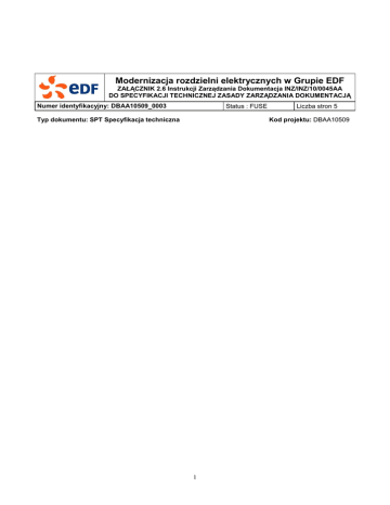Modernizacja rozdzielni elektrycznych w Grupie EDF ZAŁĄCZNIK 2.6 Instrukcji Zarządzania Dokumentacja INZ/INZ/10/0045AA DO SPECYFIKACJI TECHNICZNEJ ZASADY ZARZĄDZANIA DOKUMENTACJĄ Numer identyfikacyjny: DBAA10509_0003 Status : FUSE Typ dokumentu: SPT Specyfikacja techniczna Liczba stron 5 Kod projektu: DBAA10509 1 1 WSTĘP. Niniejsze wytyczne dotyczące zasad zarządzania dokumentacją zawierają ogólne i szczegółowe wymagania, które winne być przestrzegane przez Centralę i Oddziały lokalne CUW EdF Polska oraz Dostawców, Wykonawców a także ich Podwykonawców realizujących zlecenia na rzecz CUW Edf Polska. 2 CEL I ZASTOSOWANIE. Celem niniejszego dokumentu jest określenie szczegółowych zasad obowiązujących przy tworzeniu dokumentacji technicznej związanej z działalnością wewnętrzną CUW (dokumentacja tworzona przez komórki organizacyjne CUW na potrzeby własne) oraz dokumentacją techniczną, która będzie tworzona lub która musi być dostarczona (np. zakupy dóbr gotowych) przy realizacji zleceń udzielanych przez CUW dla firm zewnętrznych. 3 WYMAGANIA OGÓLNE DOTYCZĄCE DOKUMENTACJI. 3.1. Wykonawca zobowiązany jest opracować i dostarczyć następującą dokumentację dla wykonywanych prac: a) b) c) c) 3.2. dokumentację budowlaną na potrzeby uzyskania pozwolenia na budowę, dokumentację projektową, dokumentację montażową, dokumentację powykonawczą. Wymagania ogólne dotyczące dokumentacji technicznej. 3.2.1. Dokumentacja techniczna winna być wykonana w języku polskim zgodnie z obowiązującymi normami i przepisami. 3.2.2 W przypadku zakupów dóbr gotowych dokumentacja związana, np.: − − − − − − − − fabryczne instrukcje obsługi; DTR - urządzeń, armatury, aparatury itp.; dokumentacja montażowa, atesty i świadectwa kontroli technicznej aparatury, urządzeń i armatury; karty gwarancyjne; opisy techniczne; rysunki konstrukcyjne, montażowe i zestawieniowe, karty charakterystyki substancji niebezpiecznych musi być wykonana w języku polskim. W przypadku materiałów obcojęzycznych należy dostarczyć oryginał i tłumaczenie w języku polskim. 3.2.3. Dokumentację projektową należy opracować: a) w 5 egzemplarzach w formie papierowej, b) w 5 egzemplarzach w postaci elektronicznej (na nośniku CD-ROM). 3.2.5 Dokumentację montażową należy opracować: a) w 5 egzemplarzach w formie papierowej, b) w 5 egzemplarzach w postaci elektronicznej (na nośniku CD-ROM). 3.2.6 Dokumentację powykonawczą należy opracować: a) w 5 egzemplarzach w formie papierowej, b) w 5 egzemplarzach w postaci elektronicznej (na nośniku CD-ROM). 2 Uwaga: Poza wymienionymi typami dokumentacji dozwolone jest wykonanie innej specjalistycznej dokumentacji wynikającej ze specyfiki branży (np.: dokumentacja programowa). 3.2.7 Dla dostarczanej dokumentacji obowiązują następujące formaty: a) Rysunki techniczne − Format plików: dwg − Program: Autocad b) Rysunki techniczne elektryczne − Format plików: dwg − Program: Autocad c) Pliki bitmapowe w niskiej jakości − Format plików: jpg − Kompresja: 85-90% − Rozdzielczość: 75-150 DPI d) Pliki bitmapowe w wysokiej jakości − Format plików: tif − Kompresja: możliwa LZW − Rozdzielczość: 300 DPI dla kolorowych 300 DPI dla skali szarości 600 DPI dla czarno-białych e) Pliki tekstowe edytowalne f) − Format plików: doc − Program: MS Word Arkusze kalkulacyjne − Format plików: xls − Program: MS Excel − Format plików: ppt − Program: MS Power Point g) Prezentacje h) Harmonogramy i) j) − Format plików: mpp − Program: MS Project Pliki bazodanowe (Access) − Format plików: mdb − Program: MS Access Pliki zarchiwizowane 3 − Format plików: rar − Program: WinRAR k) Pliki nieedytowalne l) − Format plików: pdf − Program: Adobe Reader, PDFCreator − Uwagi: plik nie może być w żaden sposób zabezpieczony − Format plików: wmv, avi, mpeg Filmy Uwaga: Wyboru wersji danego programu dokonuje osoba sporządzająca specyfikację techniczną w zależności od dostępności wersji oprogramowania. 3.2.8 Dokumentacja powinna zawierać system oznaczeń KKS zgodny z obowiązującym systemem oznaczeń w Spółce dla, której realizowany jest przedmiot zamówienia. 3.2.9 Wykonawca zobowiązany będzie do uzgadniania z Zamawiającym (na piśmie) rozwiązań projektowych na bieżąco. 3.2.10 Dokumentacja powinna być przekazana w siedzibie Zamawiającego wraz z protokołem przekazania dokumentacji. 3.2.11 Dokumentacja powinna posiadać oświadczenie o jej kompletności oraz sporządzeniu zgodnie z obowiązującymi przepisami oraz zasadami wiedzy technicznej. 3.2.12 Całość dokumentacji musi być dostarczona w trwałej i estetycznej oprawie w formie pisemnej oraz na nośniku elektronicznym CD-ROM (w ilościach przedstawionych powyżej). 3.2.13 Wykonawca zobowiązany będzie do udzielenia gwarancji na usuwanie wad dokumentacji, tj. Wykonawca zobowiązuje się do dokonania nieodpłatnej zmiany projektu w przypadku wadliwości zaprojektowanego rozwiązania. 3.2.14 Uprawnienia z tytułu rękojmi za wady dokumentacji wygasają w stosunku do Wykonawcy wraz z wygaśnięciem odpowiedzialności Wykonawcy za wady wykonane na podstawie tej dokumentacji. 3.2.15 Zamawiający dokona odbioru dokumentacji w terminie 7 dni od daty jej przekazania. Zamawiający zastrzega sobie możliwość opiniowania i wnoszenia uwag do przekazanej dokumentacji. 3.2.16 Dokumentacja stanowić będzie własność Zamawiającego i bez jego zgody Wykonawca nie może jej upowszechniać. 3.2.17 Wykonawca przekaże wymagane DTR, instrukcje fabryczne lub sporządzone przez Wykonawcę itp. w języku polskim. W przypadku powyższych dokumentów sporządzonych w języku obcym, Wykonawca przekaże tłumaczenia na język polski i oryginały Zamawiającemu. 3.2.18 Wykonawca przenosi na Zamawiającego autorskie prawo majątkowe na polach eksploatacji, z tym że prawa do dokonanych projektów wynalazczych przysługuje Wykona