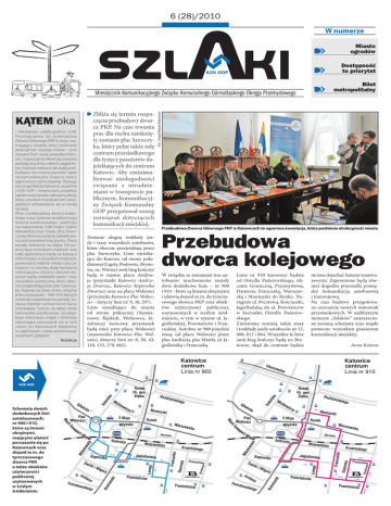 6 (28)/2010 a szl ki KĄTEM oka – Dla Katowic wybiła godzina 12.00. Przystępujemy do przebudowy Dworca Głównego PKP. To duży i wymagający projekt, który podniesie atrakcyjność naszego miasta – tymi słowami Piotr Uszok, prezydent Katowic, rozpoczął konferencję prasową poświęconą temu właśnie zagadnieniu. Podczas realizacji tak dużej przebudowy nie można pozwolić sobie na komunikacyjny chaos w stolicy aglomeracji górnośląskiej. Dlatego też Urząd Miasta Katowice, wspólnie z KZK GOP i inwestorami projektu, zaplanował szeroko zakrojoną akcję, która umożliwi mieszkańcom i przyjezdnym odnalezienie się w nowej sytuacji. Wraz z przebudową dworca kolejowego rusza budowa podziemnego dworca autobusowego i parkingu na maksymalnie 1200 miejsc, Galerii Katowickiej oraz nowej ulicy Dworcowej, która też zostanie zlokalizowana pod powierzchnią gruntu. Prace zostały rozłożone na etapy. Od połowy lipca mieszkańcy Katowic oraz całej aglomeracji będą na bieżąco informowani o wszystkich zmianach, ponieważ to właśnie wtedy ruszy zakrojona na szeroką skalę kampania informacyjna. Zmiany również dotyczyć będą rozkładów jazdy i trasy wszystkich autobusów, które obecnie przejeżdżają przez plac Szewczyka. Pojawią się dwie nowe, okrężne linie autobusowe – 900 i 910, których schematy prezentujemy poniżej. Zostaną również wzmocnione kursy tramwajów. Tworzy się także nowe stanowiska autobusowe. Szczegółowe informacje, mapki i schematy ułatwiające poruszanie się w tym czasie po Katowicach będziemy w najbliższym czasie prezentować na łamach „Szlaków”. Redakcja Zbliża się termin rozpoczęcia przebudowy dworca PKP. Na czas trwania prac dla ruchu zamknięty zostanie plac Szewczyka, który pełni także rolę centrum przesiadkowego dla tysięcy pasażerów dojeżdżających do centrum Katowic. Aby zminimalizować niedogodności związane z utrudnieniami w transporcie publicznym, Komunikacyjny Związek Komunalny GOP przygotował szereg rozwiązań dotyczących komunikacji miejskiej. Zmianie ulegną rozkłady jazdy i trasy wszystkich autobusów, które obecnie przejeżdżają przez plac Szewczyka. Linie wjeżdżające do Katowic od strony południowej (Ligoty, Piotrowic, Brynowa, os. Witosa) swój bieg kończyć będą w rejonie placu Andrzeja (przystanki Katowice Andrzeja Dworzec, Katowice Kopernika Dworzec) oraz na placu Wolności (przystanki Katowice Plac Wolności – dotyczy linii nr: 9, 10, 297). Linie wjeżdżające do miasta od strony północnej (Siemianowic Śląskich, Wełnowca, Józefowca) końcowy przystanek będą mieć przy placu Wolności (stanowisko Katowice Plac Wolności, dotyczy linii nr: 0, 50, 43, 110, 133, 170, 662). Dostępność to priorytet Bilet metropolitalny Przebudowa Dworca Głównego PKP w Katowicach to ogromna inwestycja, która podniesie atrakcyjność miasta Przebudowa dworca kolejowego W związku ze zmianami tras autobusów uruchomione zostały dwie dodatkowe linie – nr 900 i 910 – które są liniami okrężnymi i ułatwią dojazd m.in. do tymczasowego dworca PKP oraz obiektów użyteczności publicznej, usytuowanych w ścisłym śródmieściu, w tym w rejonie ul. Jagiellońskiej, Powstańców i Francuskiej. Autobus nr 900 pojedzie trasą: od placu Wolności przez plac Andrzeja, plac Miarki, ul. Jagiellońską i Francuską. Katowice centrum Linia nr 900 Schematy dwóch dodatkowych linii autobusowych: nr 900 i 910, które są liniami okrężnymi, mającymi ułatwić poruszanie się po Katowicach oraz dojazd m.in. do tymczasowego dworca PKP, a także obiektów użyteczności publicznej usytuowanych w ścisłym śródmieściu Miasto ogrodów Fot. Urząd Miasta Katowice Miesięcznik Komunikacyjnego Związku Komunalnego Górnośląskiego Okręgu Przemysłowego W numerze Linia nr 910 kursować będzie od Osiedla Paderewskiego, ulicami: Graniczną, Przemysłową, Damrota, Francuską, Warszawską i Moniuszki do Rynku. Następnie ul. Pocztową, Kościuszki, Jagiellońską, do ul. Powstańców w kierunku Osiedla Paderewskiego. Zmienione zostaną także trasy i rozkłady jazdy autobusów nr 13, 688, 812 i 804. Wszystkie te linie swój bieg kończyć będą na Brynowie, skąd do centrum będzie można dojechać liniami tramwajowymi. Zapewnione będą również dogodne przesiadki pomiędzy komunikacją autobusową i tramwajową. Na czas budowy przygotowano szesnaście nowych stanowisk przystankowych. W najbliższym numerze „Szlaków” zamieszczone zostaną schematy oraz mapki pomocne wszystkim pasażerom komunikacji miejskiej. Anna Koteras Katowice centrum Linia nr 910 szlaki 6/2010 KZK GOP 2 Fot. Dominik Gajda CZYM ŻYJĄ GMINY SOSNOWIEC w skrócie... CZELADŹ 15 czerwca 2010 roku dokonano kolejnego odkrycia archeologicznego na terenie Starego Miasta w Czeladzi. Podczas prac ziemnych przy ul. Pieńkowskiego odkryto kamienny fundament średniowiecznego muru obronnego. O tym, że jest to fundament średniowieczny, świadczą znalezione fragmenty ceramiki, pochodzące z tego okresu. GLIWICE W gliwickim Urzędzie Miejskim otwarto Centrum Certyfikacji Systemu Elektronicznej Komunikacji Administracji Publicznej. Przychodząc z dowodem osobistym oraz pendrivem i podpisując stosowną umowę, zainteresowani otrzymują bezpłatnie certyfikat służący do składania podpisu elektronicznego. Można nim sygnować elektroniczne pisma, wnioski oraz korespondencję, przesyłane online (za pomocą elektronicznej skrzynki podawczej) do 73 śląskich urzędów działających w ramach SEKAP. Umożliwi to załatwianie spraw urzędowych 24 godziny na dobę, z każdego miejsca podłączonego do Internetu. RADZIONKÓW Informujemy pasażerów korzystających z linii autobusowej nr 73 o stałych zmianach, obowiązujących od 1 czerwca br. w rozkładzie jazdy autobusów w soboty oraz niedziele i święta. Informacje umieszczone są na tablicach z rozkładami jazdy oraz na stronie internetowej KZK GOP: rozklady.kzkgop.pl. SIE