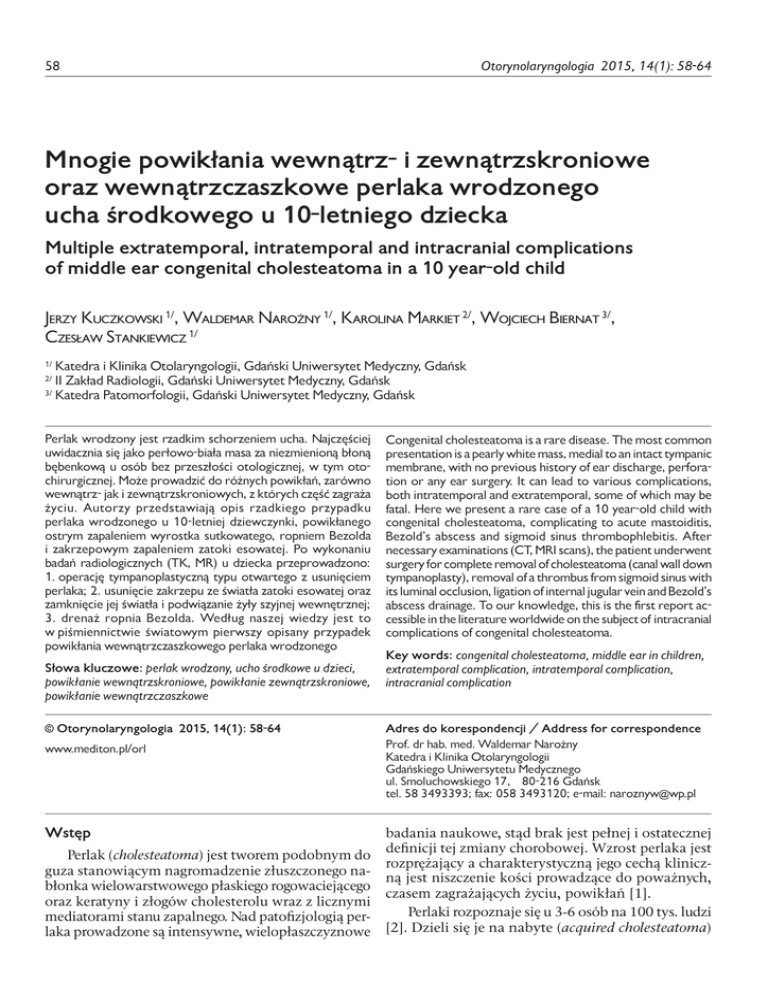 58 Otorynolaryngologia 2015, 14(1): 58-64 Mnogie powikłania wewnątrz- i zewnątrzskroniowe oraz wewnątrzczaszkowe perlaka wrodzonego ucha środkowego u 10-letniego dziecka Multiple extratemporal, intratemporal and intracranial complications of middle ear congenital cholesteatoma in a 10 year-old child Jerzy Kuczkowski 1/, Waldemar Narożny 1/, Karolina Markiet 2/, Wojciech Biernat 3/, Czesław Stankiewicz 1/ Katedra i Klinika Otolaryngologii, Gdański Uniwersytet Medyczny, Gdańsk II Zakład Radiologii, Gdański Uniwersytet Medyczny, Gdańsk 3/ Katedra Patomorfologii, Gdański Uniwersytet Medyczny, Gdańsk 1/ 2/ Perlak wrodzony jest rzadkim schorzeniem ucha. Najczęściej uwidacznia się jako perłowo-biała masa za niezmienioną błoną bębenkową u osób bez przeszłości otologicznej, w tym otochirurgicznej. Może prowadzić do różnych powikłań, zarówno wewnątrz- jak i zewnątrzskroniowych, z których część zagraża życiu. Autorzy przedstawiają opis rzadkiego przypadku perlaka wrodzonego u 10-letniej dziewczynki, powikłanego ostrym zapaleniem wyrostka sutkowatego, ropniem Bezolda i zakrzepowym zapaleniem zatoki esowatej. Po wykonaniu badań radiologicznych (TK, MR) u dziecka przeprowadzono: 1. operację tympanoplastyczną typu otwartego z usunięciem perlaka; 2. usunięcie zakrzepu ze światła zatoki esowatej oraz zamknięcie jej światła i podwiązanie żyły szyjnej wewnętrznej; 3. drenaż ropnia Bezolda. Według naszej wiedzy jest to w piśmiennictwie światowym pierwszy opisany przypadek powikłania wewnątrzczaszkowego perlaka wrodzonego Słowa kluczowe: perlak wrodzony, ucho środkowe u dzieci, powikłanie wewnątrzskroniowe, powikłanie zewnątrzskroniowe, powikłanie wewnątrzczaszkowe © Otorynolaryngologia 2015, 14(1): 58-64 www.mediton.pl/orl Wstęp Perlak (cholesteatoma) jest tworem podobnym do guza stanowiącym nagromadzenie złuszczonego nabłonka wielowarstwowego płaskiego rogowaciejącego oraz keratyny i złogów cholesterolu wraz z licznymi mediatorami stanu zapalnego. Nad patofizjologią perlaka prowadzone są intensywne, wielopłaszczyznowe Congenital cholesteatoma is a rare disease. The most common presentation is a pearly white mass, medial to an intact tympanic membrane, with no previous history of ear discharge, perforation or any ear surgery. It can lead to various complications, both intratemporal and extratemporal, some of which may be fatal. Here we present a rare case of a 10 year-old child with congenital cholesteatoma, complicating to acute mastoiditis, Bezold’s abscess and sigmoid sinus thrombophlebitis. After necessary examinations (CT, MRI scans), the patient underwent surgery for complete removal of cholesteatoma (canal wall down tympanoplasty), removal of a thrombus from sigmoid sinus with its luminal occlusion, ligation of internal jugular vein and Bezold’s abscess drainage. To our knowledge, this is the first report accessible in the literature worldwide on the subject of intracranial complications of congenital cholesteatoma. Key words: congenital cholesteatoma, middle ear in children, extratemporal complication, intratemporal complication, intracranial complication Adres do korespondencji / Address for correspondence Prof. dr hab. med. Waldemar Narożny Katedra i Klinika Otolaryngologii Gdańskiego Uniwersytetu Medycznego ul. Smoluchowskiego 17, 80-216 Gdańsk tel. 58 3493393; fax: 058 3493120; e-mail: [email protected] badania naukowe, stąd brak jest pełnej i ostatecznej definicji tej zmiany chorobowej. Wzrost perlaka jest rozprężający a charakterystyczną jego cechą kliniczną jest niszczenie kości prowadzące do poważnych, czasem zagrażających życiu, powikłań [1]. Perlaki rozpoznaje się u 3-6 osób na 100 tys. ludzi [2]. Dzieli się je na nabyte (acquired cholesteatoma) Kuczkowski J i wsp. Mnogie powikłania wewnątrz- i zewnątrzskroniowe oraz wewnątrzczaszkowe perlaka... i wrodzone (congenital cholesteatoma). Perlaki wrodzone są zdecydowanie rzadsze. Częstość ich występowania określa się na 0,12/100 tys. ludzi, 2-24% wszystkich perlaków oraz 4-24% perlaków u dzieci [2-7]. Nazwy „perlak” jako pierwszy użył Müller w 1838 r. [2]. Pierwszego opisu perlaka wrodzonego dokonał w 1885 r. Luchae [8]. W 1922 r. Cushing przedstawił zmienioną koncepcję rozwoju perlaka wrodzonego [9]. Derlacki i wsp. w 1965 r. określili kryteria rozpoznania perlaka wrodzonego jako: obecność perłowo-białej masy za niezmienioną błoną bębenkową; brak perforacji błony bębenkowej oraz wycieków z ucha środkowego; negatywny wywiad otochirurgiczny [10]. W 1986 r. Levenson i wsp. zaproponowali złagodzenie kryteriów przedstawionych przez Derlackiego i wsp. o możliwość uznania przebytego zapalenia ucha środkowego jako stanu nie wykluczającego rozpoznania perlaka wrodzonego [11]. Perlak wrodzony może rozwinąć się w różnych miejscach kości skroniowej. Najczęściej jest to ucho środkowe, rzadziej wyrostek sutkowaty, przewód słuchowy zewnętrzny, część skalista kości skroniowej lub szczyt piramidy kości skroniowej [12-16]. W materiale 64 chorych z perlakiem wrodzonym leczonych przez Giannuzzi’ego i wsp. u 46 (71,9%) był on umiejscowiony w uchu środkowym, u 15 (23,4%) w piramidzie kości skroniowej i u 3 (4,7%) obejmował wyrostek sutkowaty [17]. Wśród 63 chorych leczonych przez Kojima i wsp. większość (35-55,6%) stanowiły zmiany rozległe, obejmujące jamę bębenkową i sutkową; rzadziej perlaki obejmowały jamę bębenkową (26-41,2%), szczyt piramidy kości skroniowej (1-1,6%) bądź rozwijały się dwuogniskowo (1-1,6%) [18]. Perlaki wrodzone rozpoznawane są najczęściej u dzieci w wieku 4-8 lat [19-20]. Wraz ze wzrostem świadomości istnienia takiej choroby ucha środkowego oraz postępem technik diagnostycznych (obrazowania radiologicznego, badań elektrofizjologicznych słuchu) wiek chorych obniża się [19-21]. Wśród 63 perlaków wrodzonych leczonych przez Kojima i ws