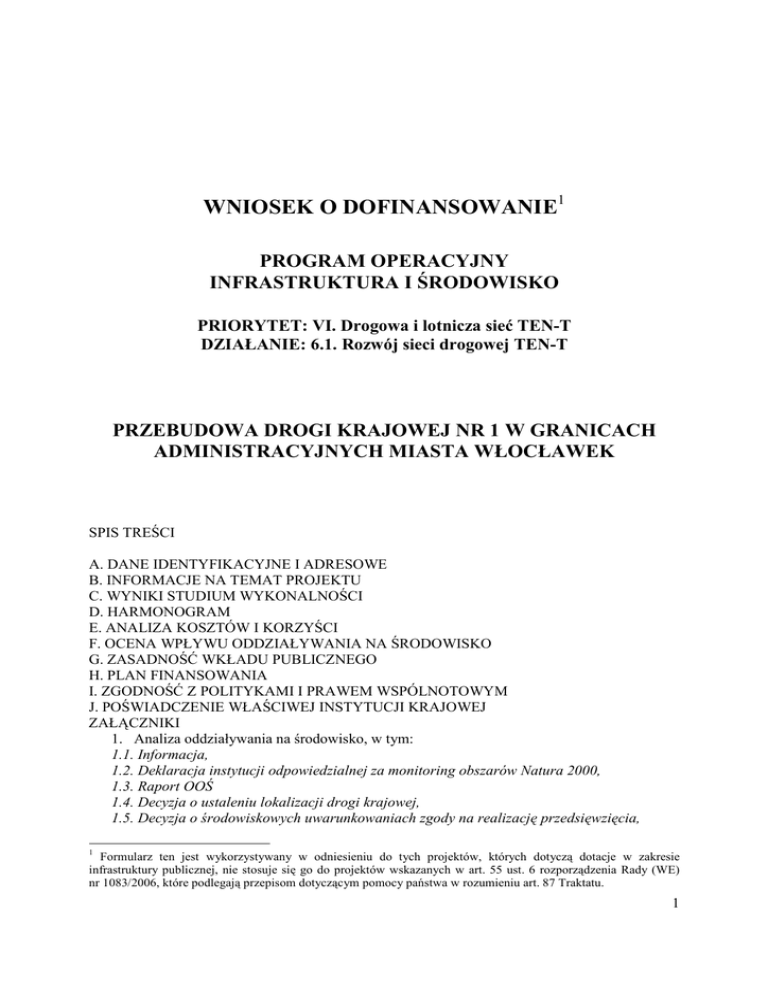 WNIOSEK O DOFINANSOWANIE1 PROGRAM OPERACYJNY INFRASTRUKTURA I ŚRODOWISKO PRIORYTET: VI. Drogowa i lotnicza sieć TEN-T DZIAŁANIE: 6.1. Rozwój sieci drogowej TEN-T PRZEBUDOWA DROGI KRAJOWEJ NR 1 W GRANICACH ADMINISTRACYJNYCH MIASTA WŁOCŁAWEK SPIS TREŚCI A. DANE IDENTYFIKACYJNE I ADRESOWE B. INFORMACJE NA TEMAT PROJEKTU C. WYNIKI STUDIUM WYKONALNOŚCI D. HARMONOGRAM E. ANALIZA KOSZTÓW I KORZYŚCI F. OCENA WPŁYWU ODDZIAŁYWANIA NA ŚRODOWISKO G. ZASADNOŚĆ WKŁADU PUBLICZNEGO H. PLAN FINANSOWANIA I. ZGODNOŚĆ Z POLITYKAMI I PRAWEM WSPÓLNOTOWYM J. POŚWIADCZENIE WŁAŚCIWEJ INSTYTUCJI KRAJOWEJ ZAŁĄCZNIKI 1. Analiza oddziaływania na środowisko, w tym: 1.1. Informacja, 1.2. Deklaracja instytucji odpowiedzialnej za monitoring obszarów Natura 2000, 1.3. Raport OOŚ 1.4. Decyzja o ustaleniu lokalizacji drogi krajowej, 1.5. Decyzja o środowiskowych uwarunkowaniach zgody na realizację przedsięwzięcia, 1 Formularz ten jest wykorzystywany w odniesieniu do tych projektów, których dotyczą dotacje w zakresie infrastruktury publicznej, nie stosuje się go do projektów wskazanych w art. 55 ust. 6 rozporządzenia Rady (WE) nr 1083/2006, które podlegają przepisom dotyczącym pomocy państwa w rozumieniu art. 87 Traktatu. 1 1.6. Postanowienie Wojewody Kujawsko – Pomorskiego, 1.7. Pozwolenia na budowę ( nr: DW – 16/2008, DW-1/2009), 1.8. Wnioski o wydanie pozwolenia na budowę (znak: DI-5551-1/11/145/2009, DI-55511/12/227/2009). 2. Rezultaty Studium Wykonalności, w tym: 2.1. Aktualna Analiza Kosztów i Korzyści, 2.2. Harmonogram realizacji projektu w postaci wykresu Gantt’a. 3. Oświadczenie beneficjenta w związku z ubieganiem się o dofinansowanie z Programu Operacyjnego Infrastruktura i Środowisko. 4. Mapy: 4.1. Mapa lokalizująca projekt w mieście, 4.2. Mapa lokalizująca projekt w najbliższym otoczeniu. 5. Upoważnienie do potwierdzania zgodności dokumentów z oryginałem. 6. Uchwała Nr 121/XXV/2008 Rady Miasta Włocławek z dnia 29 grudnia 2008 r. w sprawie uchwalenia budżetu miasta Włocławek na prawach powiatu na rok 2009. 7. Uchwała Nr 36/XVI/2008 Rady Miasta Włocławek z dnia 31 marca 2008 r. w sprawie uchwalenia Wieloletniego Programu Inwestycyjnego na lata 2008-2015 dla miasta Włocławek dla zadań realizowanych przy wsparciu środkami Unii Europejskiej. 8. Upoważnienie do podpisywania oryginałów dokumentów. A. DANE IDENTYFIKACYJNE I ADRESOWE A.1. Instytucja odpowiedzialna za wniosek (tj. instytucja zarządzająca lub instytucja pośrednicząca) A.1.1. A.1.2. A.1.3. A.1.4. A.1.5. A.1.6. Nazwa: Adres: Kontakt: Tel.: Teleks/Faks: E-mail: A.2. Organ odpowiedzialny za realizację projektu (beneficjent) Centrum Unijnych Projektów Transportowych ul. Bonifraterska 17, 00-203 Warszawa Anna Siejda – Dyrektor Centrum Unijnych Projektów Transportowych 022 246 05 00 022 246 05 01 [email protected] A.2.1. Nazwa: Gmina Miasto Włocławek, NIP: 888-10-12-236, REGON: 910866910 A.2.2. Adres: ul. Zielony Rynek 11/13 A.2.3. Kontakt: Andrzej Pałucki – Prezydent Miasta Włocławek A.2.4. Tel.: 054 411 35 00 A.2.5. Teleks/Faks: 054 411 36 00 A.2.6. E-mail: [email protected] A.2.7. Osoba do kontaktów roboczych: Piotr Kosseda – Dyrektor Miejskiego Zarządu Dróg, ul. Zielna 13/21, 87-800 Włocławek, tel./fax: 054 412 13 23, e-mail: [email protected] Anna Wszelak – Zastępca Naczelnika Działu Inwestycji, Miejski Zarząd Dróg, ul. Zielna 13/21, 87-800 Włocławek, tel. 054 412 13 23 wew. 111, e-mail: [email protected] 2 B. INFORMACJE NA TEMAT PROJEKTU B.1.1. Tytuł projektu/faza projektu: Przebudowa drogi krajowej Nr 1 w granicach administracyjnych miasta Włocławek B.2. Kategoryzacja działań związanych z projektem2 B.2.1. Kod klasyfikacji wg kryterium priorytetowego obszaru tematycznego: Kod: 21 Wartość procentowa: 0% Kod: 22 Wartość procentowa: 100% B.2.2. Kod klasyfikacji wg kryterium formy finansowania: Kod: 01 B.2.3. Kod wymiaru terytorialnego: Kod: Nie dotyczy B.2.4. Kod wymiaru rodzaju działalności gospodarczej:3 Kod: 11 Transport Kod: Wartość procentowa: 100% Wartość procentowa: B.2.4.1. Kod NACE:4 Kod: F42.1.1 Budowa dróg i autostrad B.2.5. Kod klasyfikacji wg kryterium lokalizacji (NUTS/LAU):5 Gmina: M. Włocławek 5.6.04.08.64.01.1 B.3. Zgodność i spójność z programem operacyjnym B.3.1. Nazwa powiązanego programu operacyjnego: Program Operacyjny Infrastruktura i Środowisko B.3.2. Wspólny kod identyfikacyjny programu operacyjnego: CCI 2007PL161PO002 B.3.3. Decyzja Komisji (nr i data): Decyzja Komisji nr K(2007)6321 z dnia 7 grudnia 2007 r. 2 Załącznik II do rozporządzenia Komisji (WE) nr 1828/2006, o ile nie wskazano inaczej. Jeżeli projekt dotyczy więcej niż jednej działalności gospodarczej, należy wskazać wiele kodów. W takim przypadku procentowy udział każdego kodu powinien stanowić łączną wartość nieprzekraczającą 100 %. 4 NACE-Rev.1, 4-cyfrowy kod: http://europa.eu.int/comm/competition/mergers/cases/index/nace_all.htmll. 5 Kody NUTS: http://europa.eu.int/comm/eurostat/ramon/nuts/home_regions_en.html. Proszę stosować najbardziej szczegółowe i odpowiednie kody NUTS. Jeżeli projekt dotyczy wielu poszczególnych poziomów obszaru NUTS/LAU 2, należy rozważyć wprowadzenie kodów NUTS/LAU 1 lub wyższych. 3 3 B.3.4. Fundusz: EFRR Fundusz Spójności X B.3.5. Nazwa osi priorytetowej: Drogowa i lotnicza sieć TEN-T B.4. Opis projektu B.4.1. Opis projektu (lub etapu projektu): a) przedstawić opis projektu (lub etapu projektu): Zasięg geograficzny Projekt zlokalizowany jest w mieście Włocławek, trzecim co do wielkości ośrodku miejskim województwa kujawsko – pomorskiego, położonym w południowowschodniej części województwa, na obu brzegach rzek Wisły oraz Zgłowiączki, w Kotlinie Płockiej. Miasto graniczy z gminami: Włocławek, Lubanie, Brześć Kujawski, Fabianki, Bobrowniki i Dobrzyń nad Wisłą, a także z powiatami: włocławskim i lipnowskim. Włocławek stanowi, zgodnie z dokument